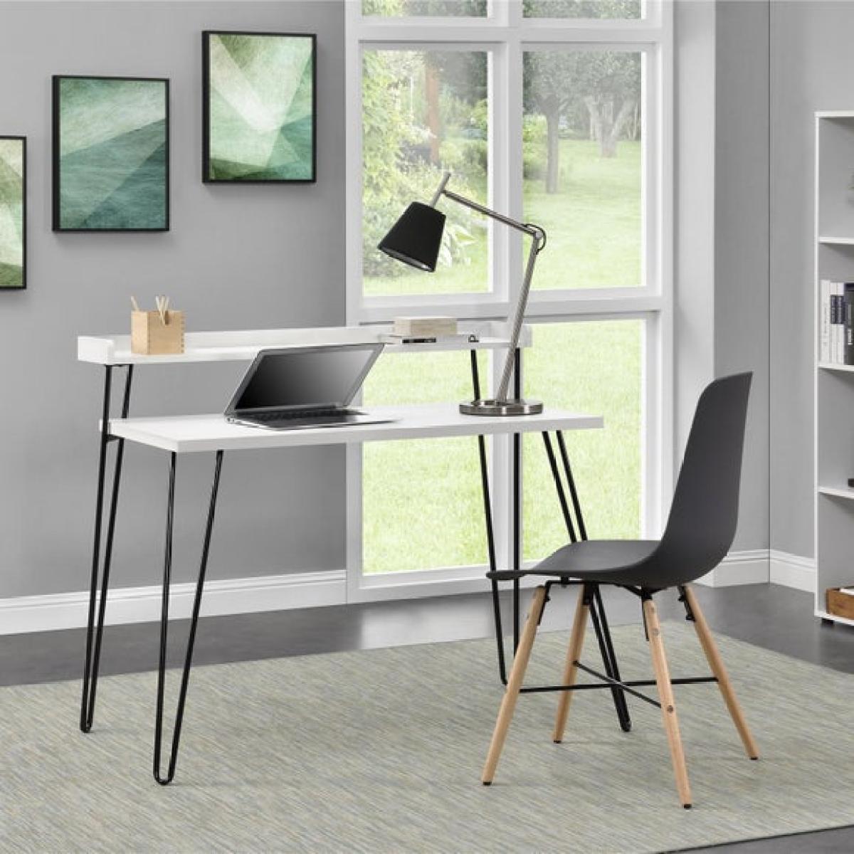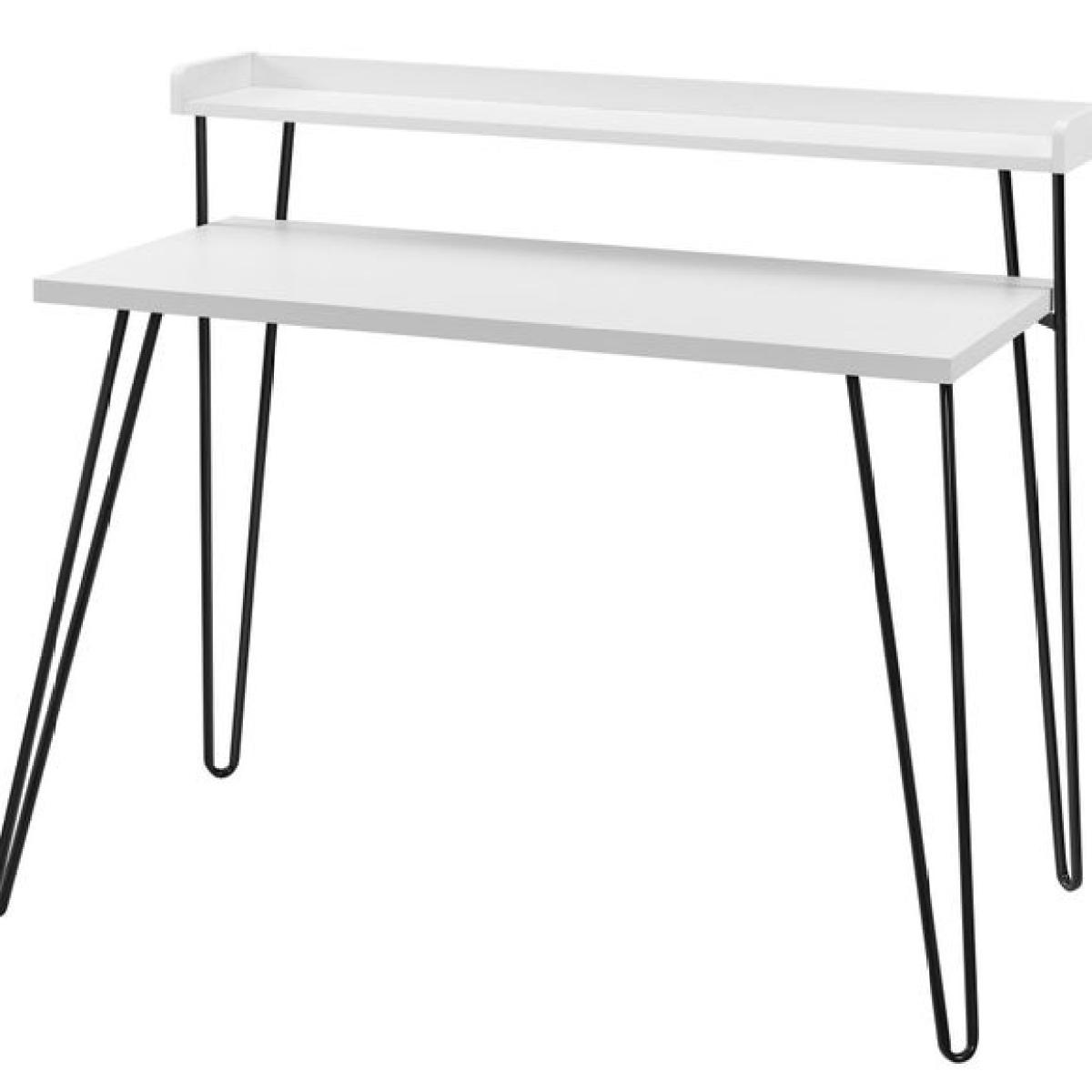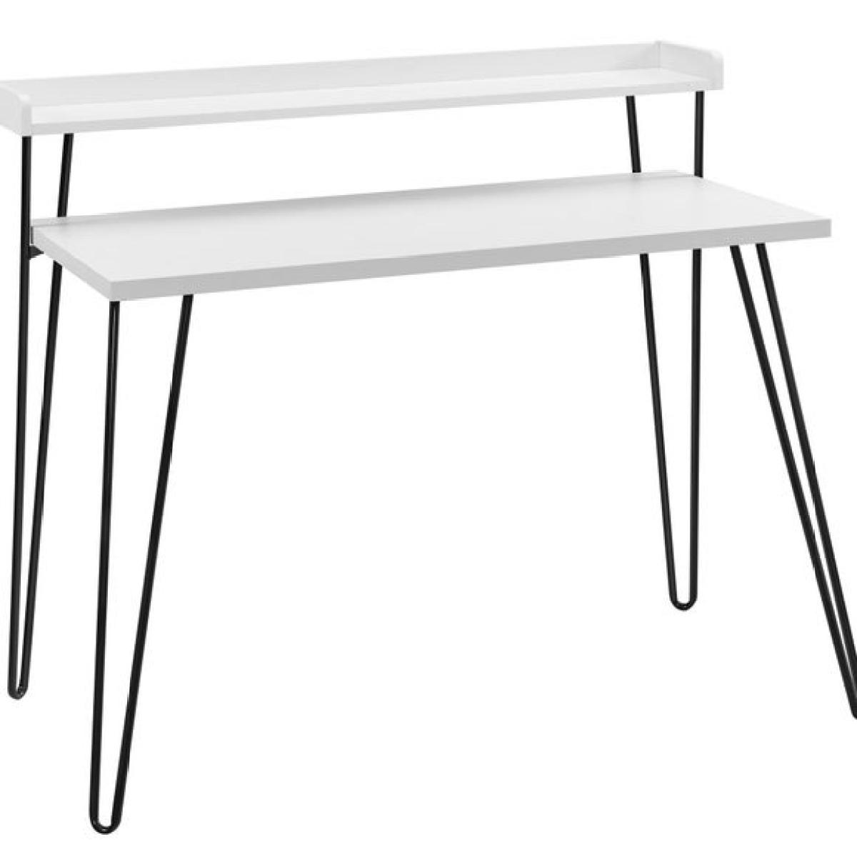 * Retro style desk * Risen shelving * Metal legs Bring a touch of vintage charm to your workspace with this stylish retro-inspired desk. Designed with practicality in mind, it features a raised shelf for extra storage or display, helping you keep your desktop neat and organised. The desk arrives flat-packed for easy delivery and requires minimal assembly, so you’ll be up and running in no time.