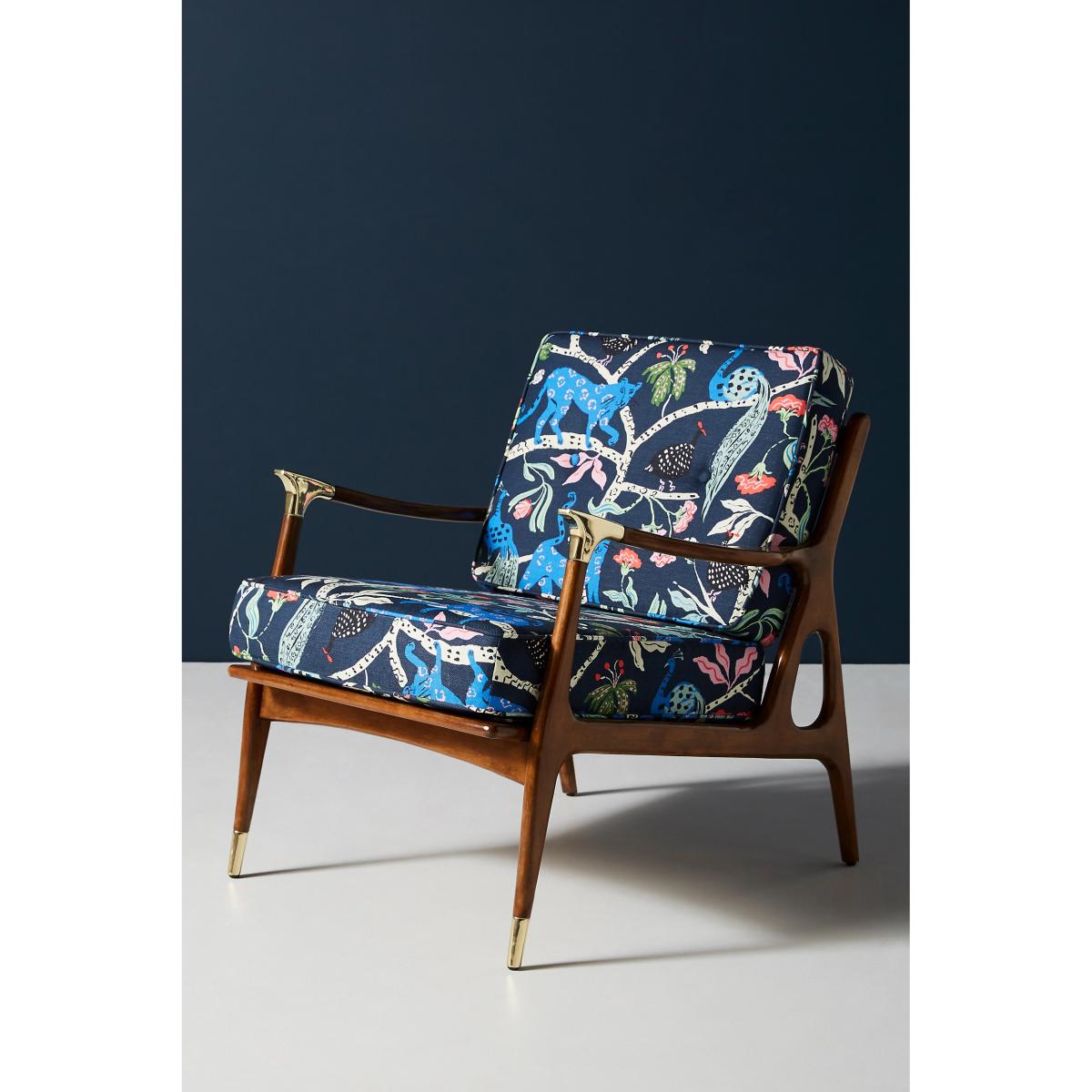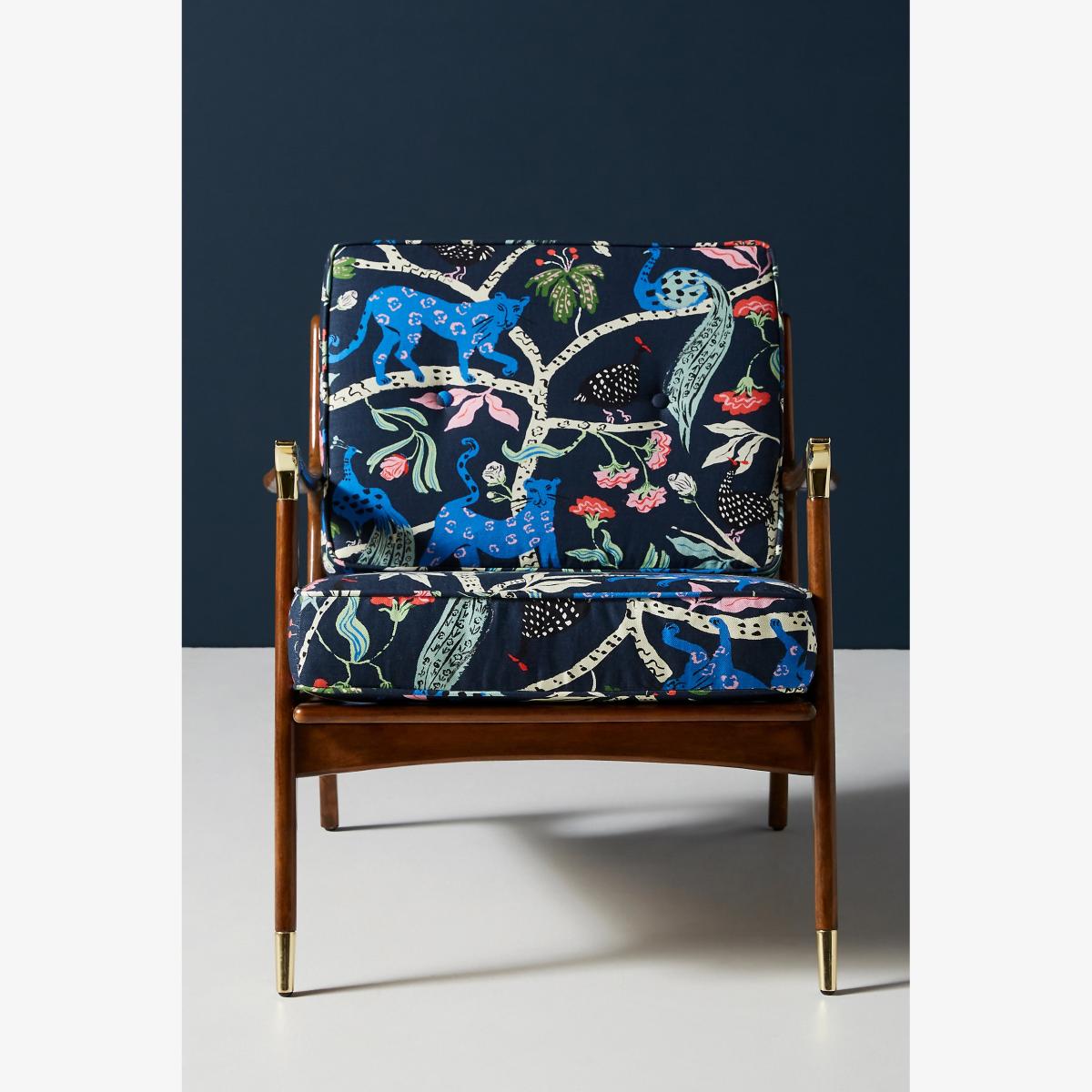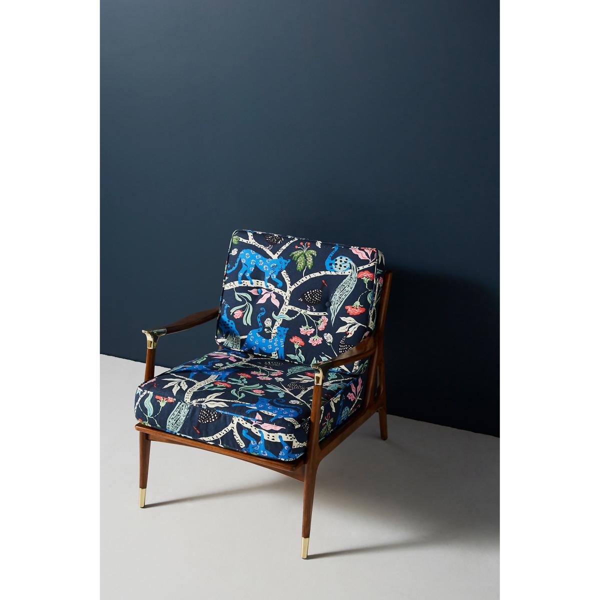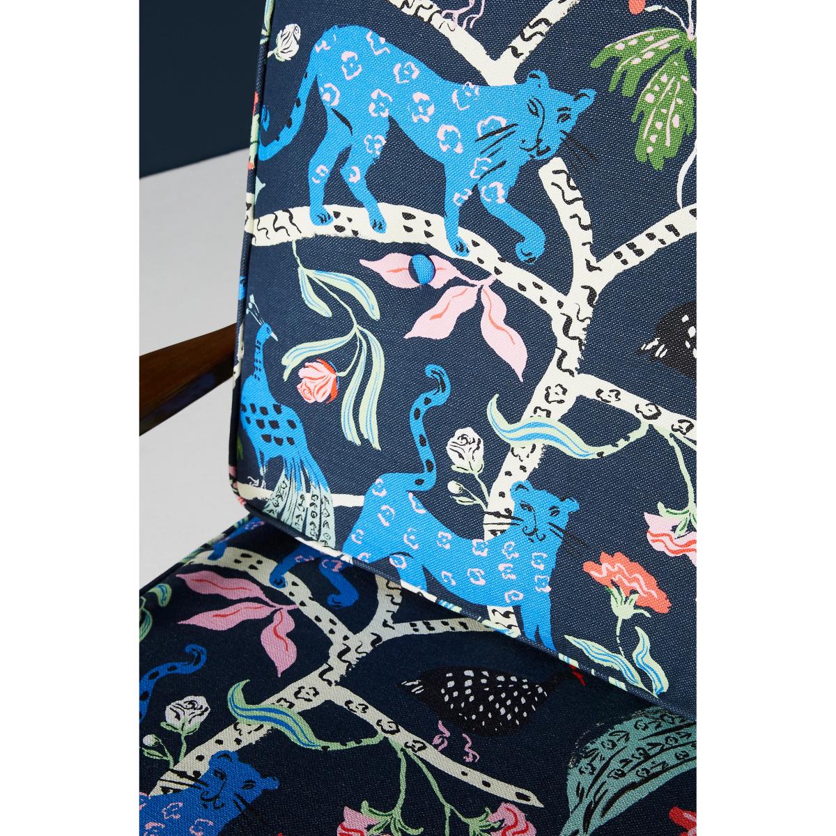 Designed by Emily Isabella in collaboration with Anthropologie, our favourite Haverhill Chair now features a lush rainforest print filled with electric blue leopards, sleek peacocks, and an intricate network of blooming, berry-covered branches. Built in a wide-set silhouette with tufted cushions, this modern chair is finished with tapered, brass-accented legs. About Emily Isabella Endlessly inspired by her search for charm in the everyday, Emily's pattern driven work reflects her training in textile design from the Savannah College of Art and Design. Emily Isabella infuses her modern illustrations with expressionist and abstract undertones that recall the stirring works of Picasso and Chagall. Aside from book illustration, her gouache paintings have been applied to product like bedding, clothing, fabric, dishes, rugs, toys and wallpaper. Emily lives in the Hudson Valley, just north of NYC, where her rural surroundings inform much of her work. Her favourite things include perusing flea markets, making friends with wildflowers and travelling to new places both near and far. Her sketchbook is always in tow, just in case she finds a bug that needs its portrait painted or an interior that has a story to share. Haverhill Midnight Jasmine Birch Wood Lounge Armchair by Anthropologie in Blue