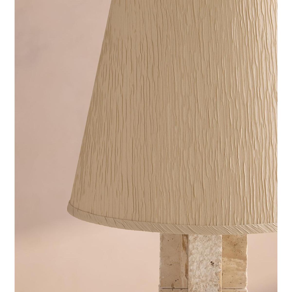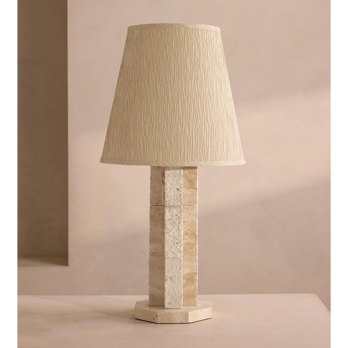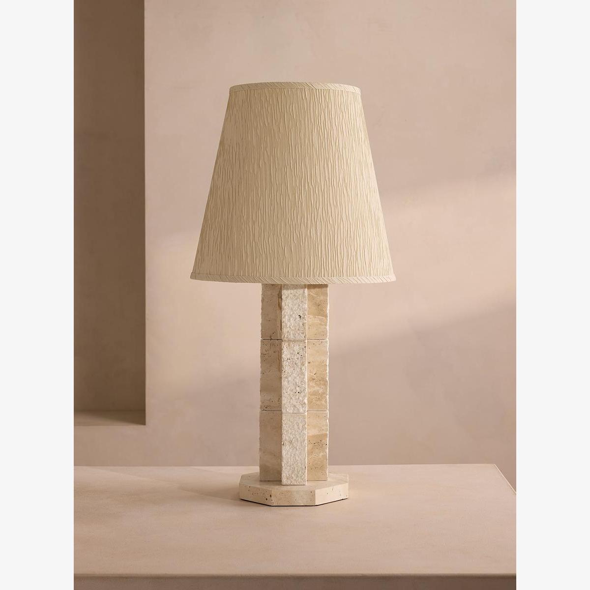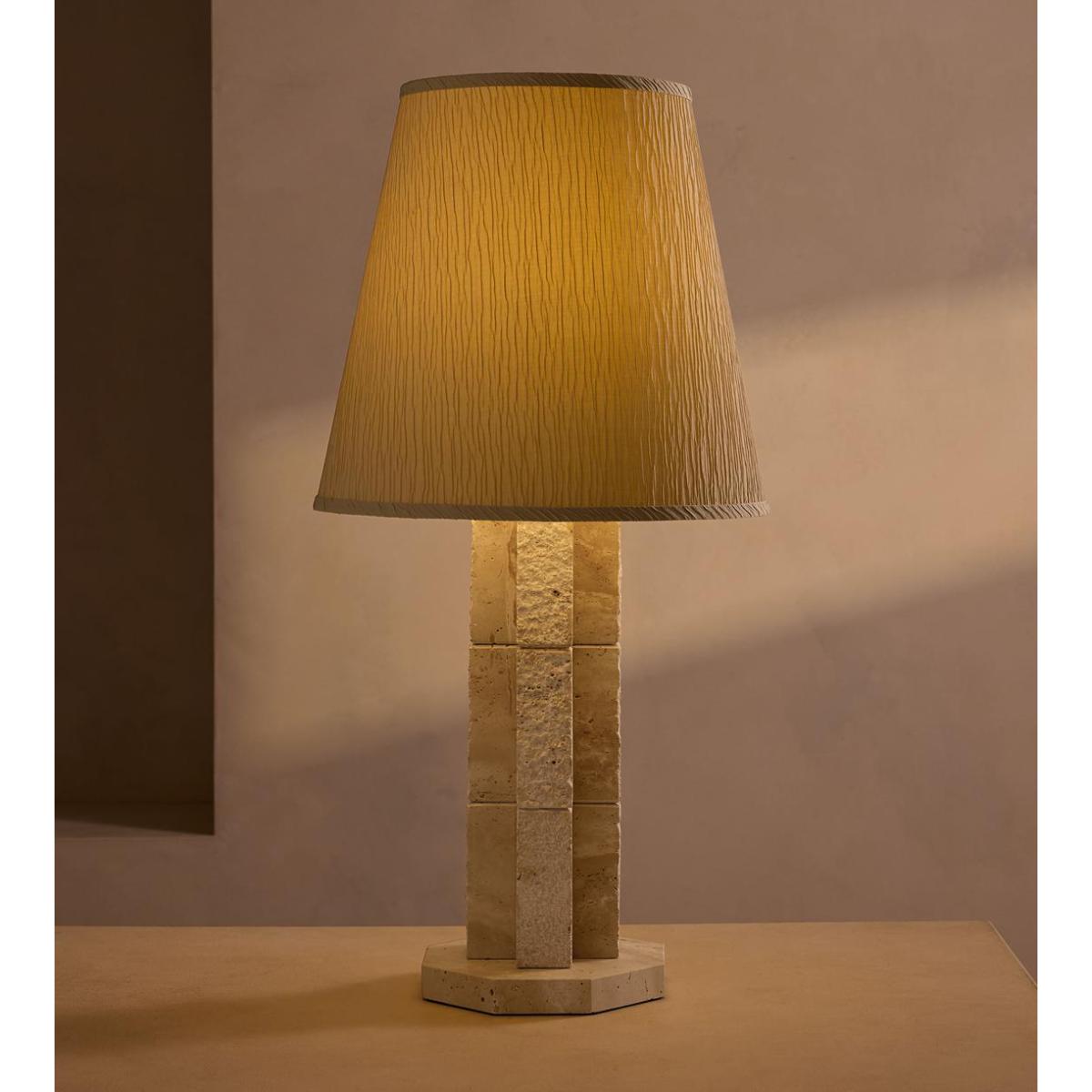 A raw-edged travertine base contrasts against a silk shade that creates a soft, warm light. Roughly textured travertine pieces are vertically stacked to form the octagonal stem of our Hawksworth table lamp. Contrasting stripes on its silk shade mirror the finish of the base, while simultaneously softening the raw travertine edges by creating a warm, ambient light.