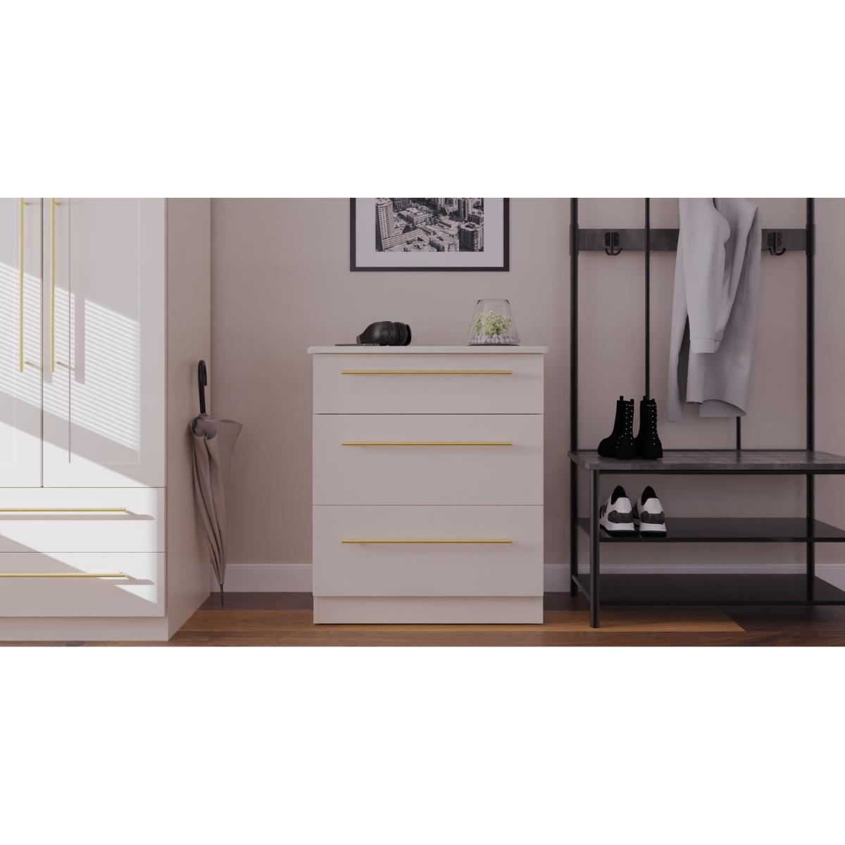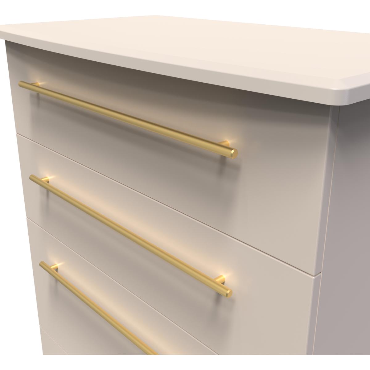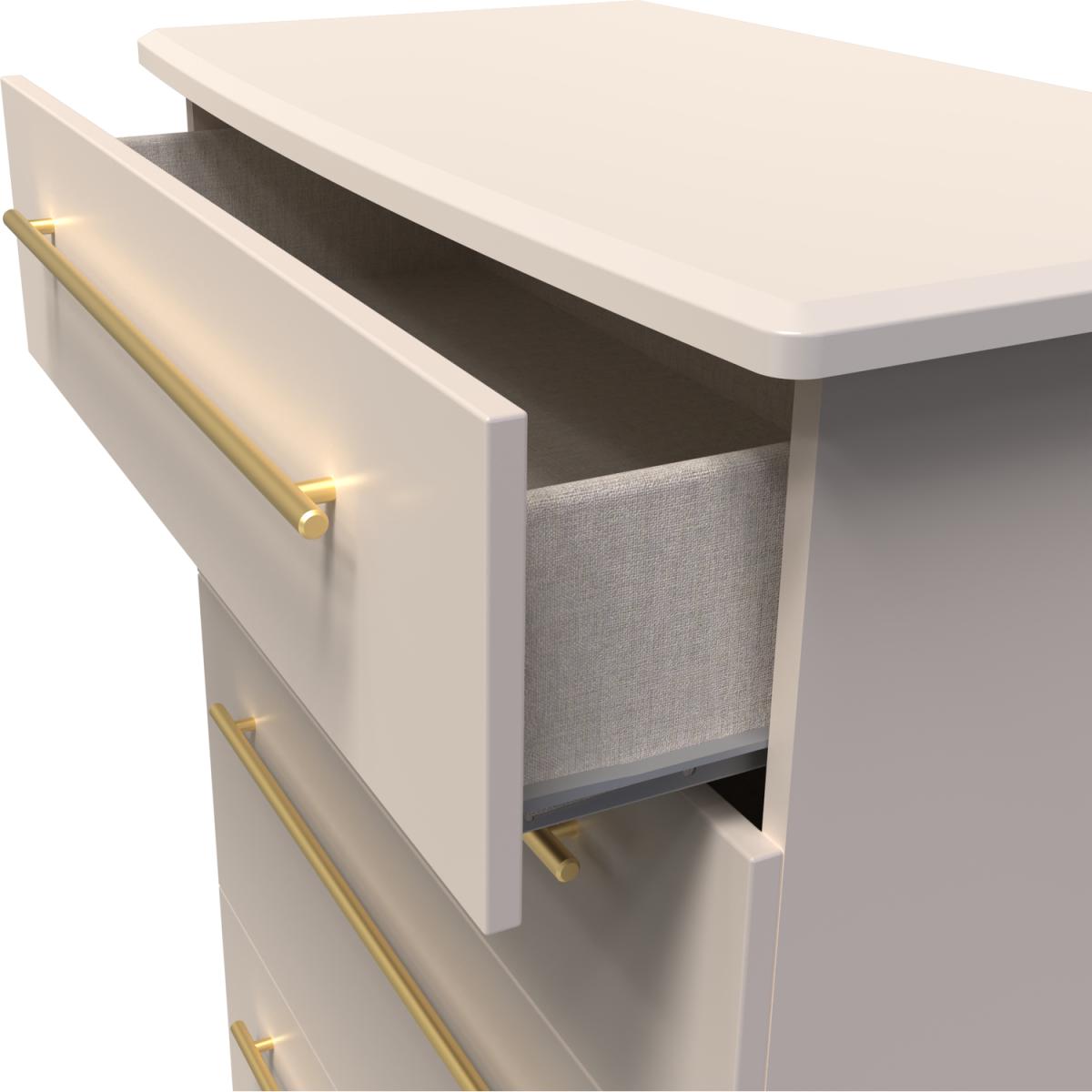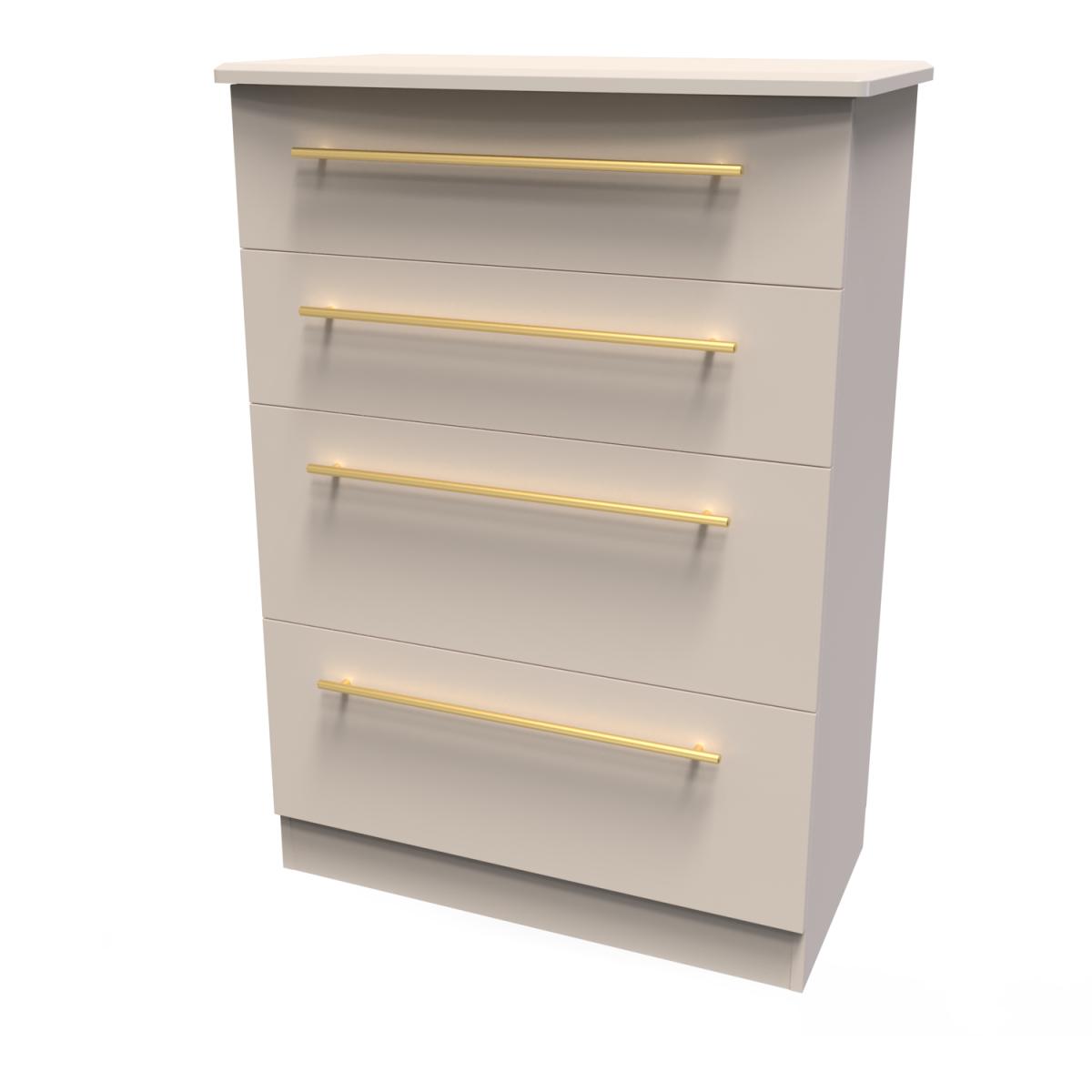 This deep 4 drawer chest of drawers is practical and stylish. Perfect for any home as a free standing storage unit. This range is modern and elegant with a smooth clean design. Features sleek gold T-Bar handles and comes ina range of scratch resistant colours. All our furniture is made in the United Kingdom, to the highest quality. It is delivered direct to your location of choice by one of our two man delivery teams, and come full assembled (although legs may be removed to prevent damage in transit).