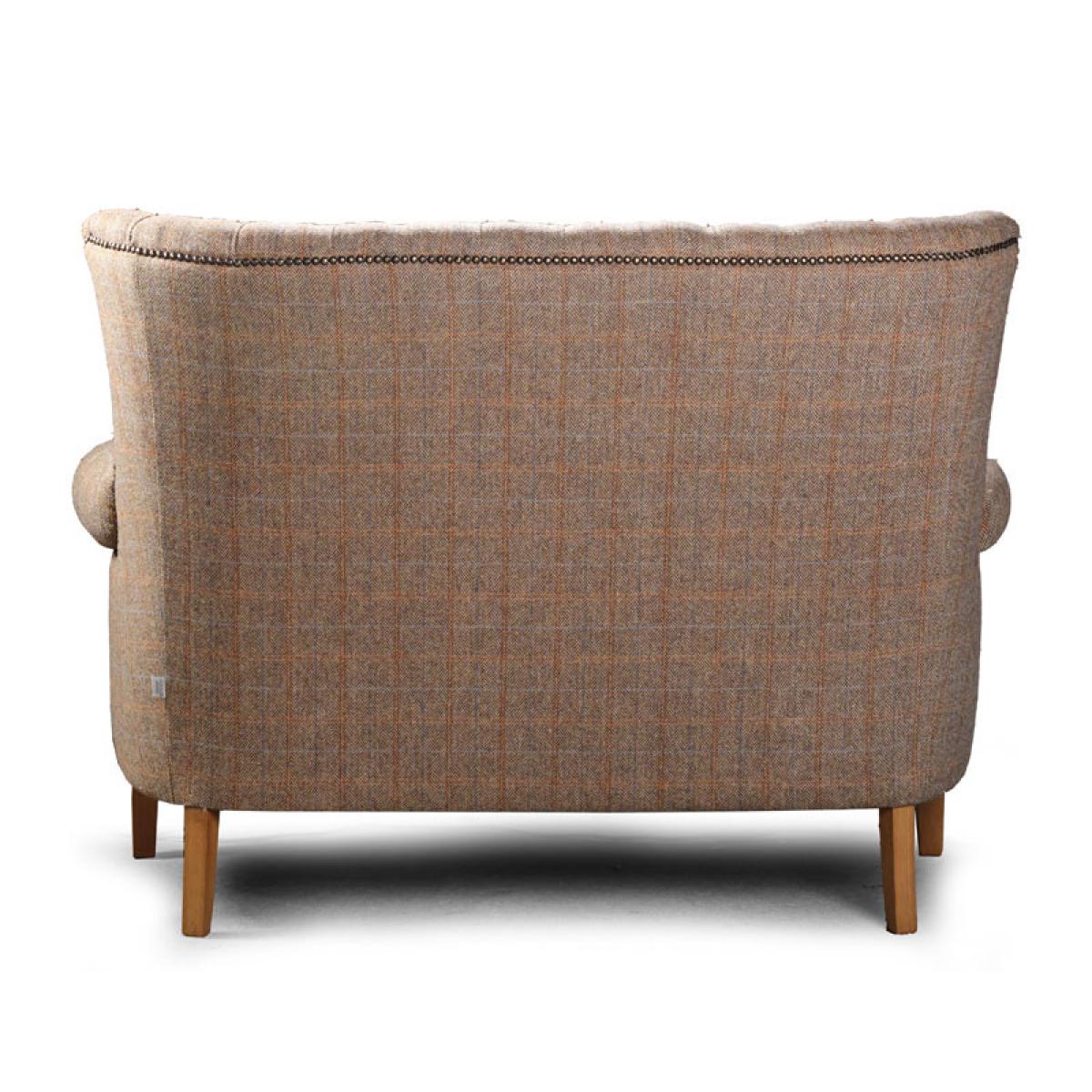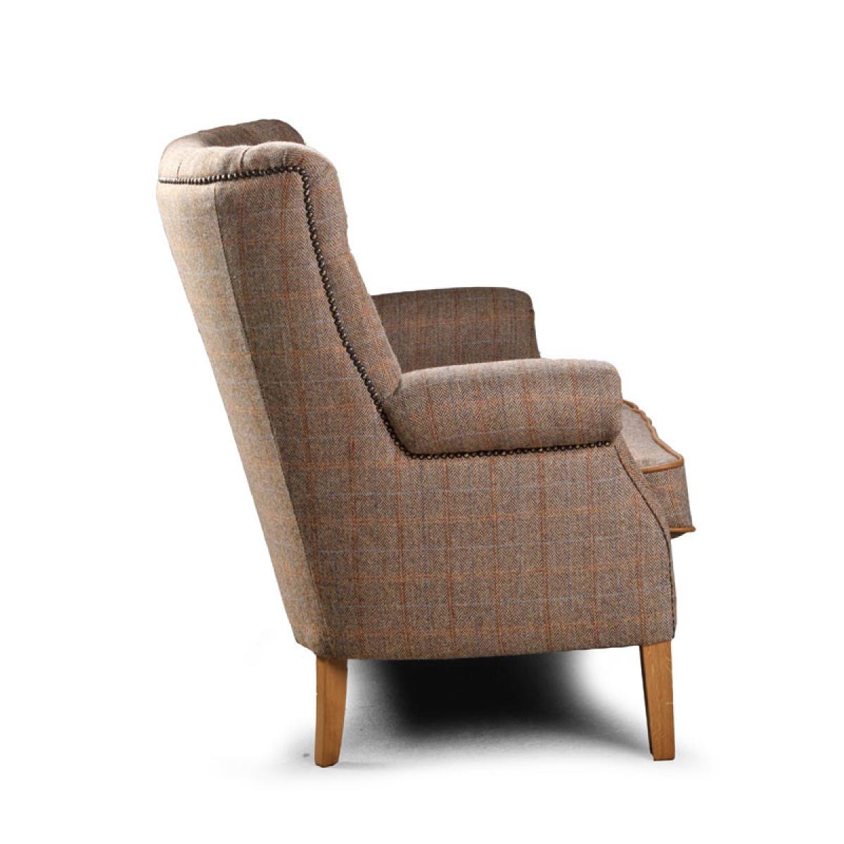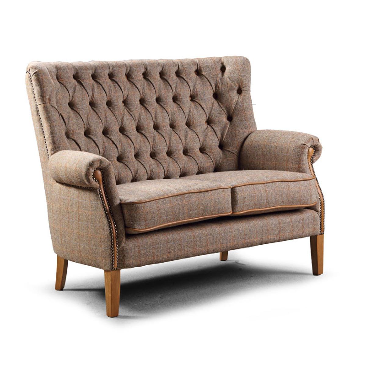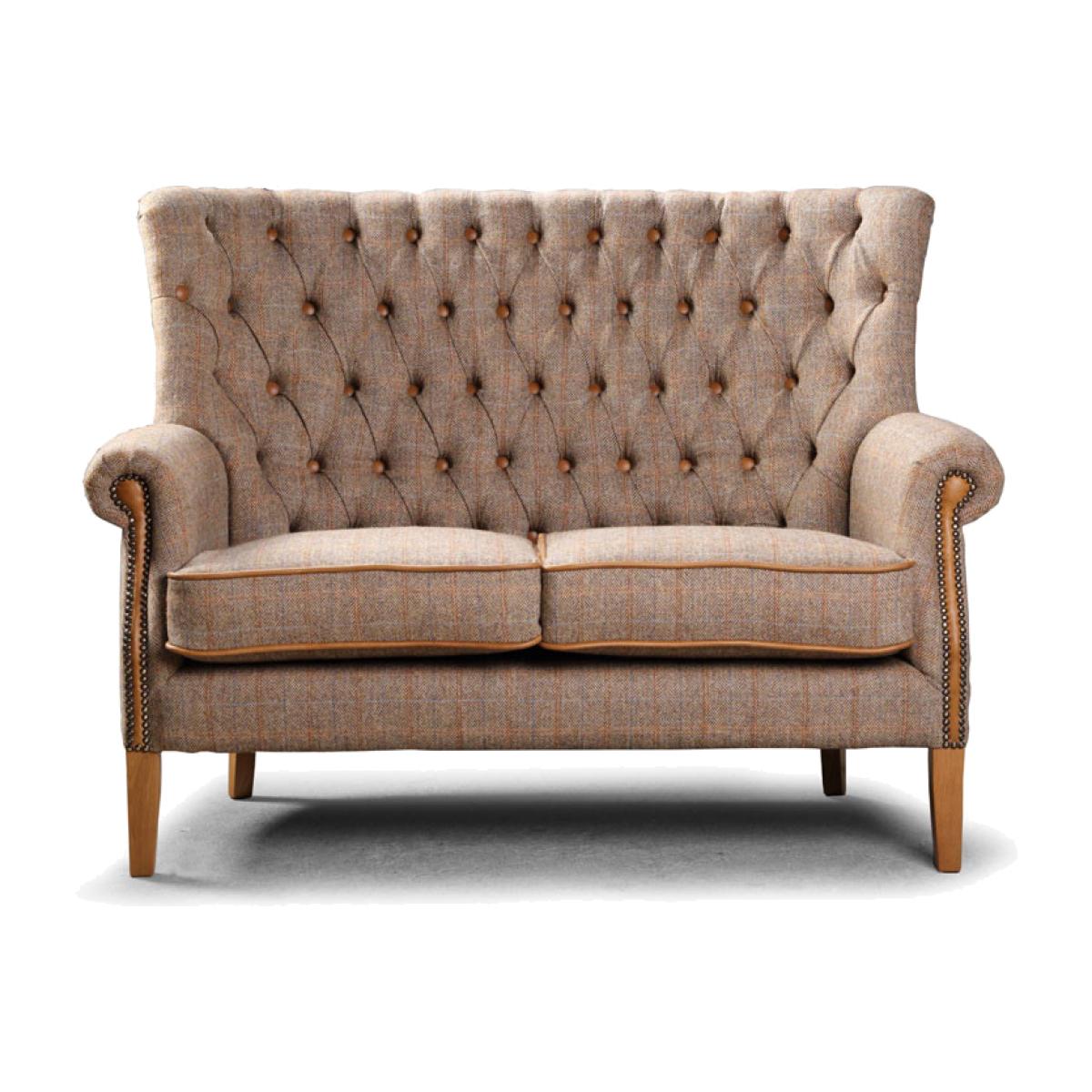 One of the most-loved styles, the Chesterfield, has been beautifully modernised with the Haxham sofa. The deep buttoning is leather, the cushion piping, whilst the classic rolled arms and brass studs remain in tradition. This design doesn’t simply provide a welcoming seat but also invites conversation with guests. Upholstered in ‘Hunting Lodge’ Harris tweed. Chesterfield deep-buttoned back style Trendy leather buttons and piping. Traditional rolled arms for comfort. Stunning brass stud detailing