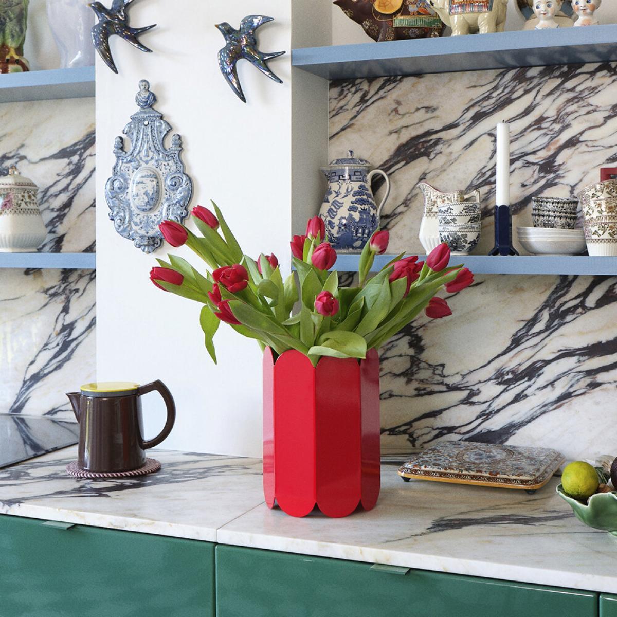 I love the bold, sculptural design of this vase - it adds a striking focal point to both modern and eclectic interiors. The vibrant red makes it a perfect statement piece that can brighten up neutral colour schemes or complement similarly rich tones. It works well in minimal settings where its form can stand out or grouped with other vases for a layered display. Practical styling tips include pairing it with dried or minimal fresh stems to keep the look clean and contemporary, or placing it on a console or side table to capitalise on its architectural shape. Its size and shape make it versatile, so don’t shy away from using it as a centrepiece or in a more subdued corner for added visual interest.