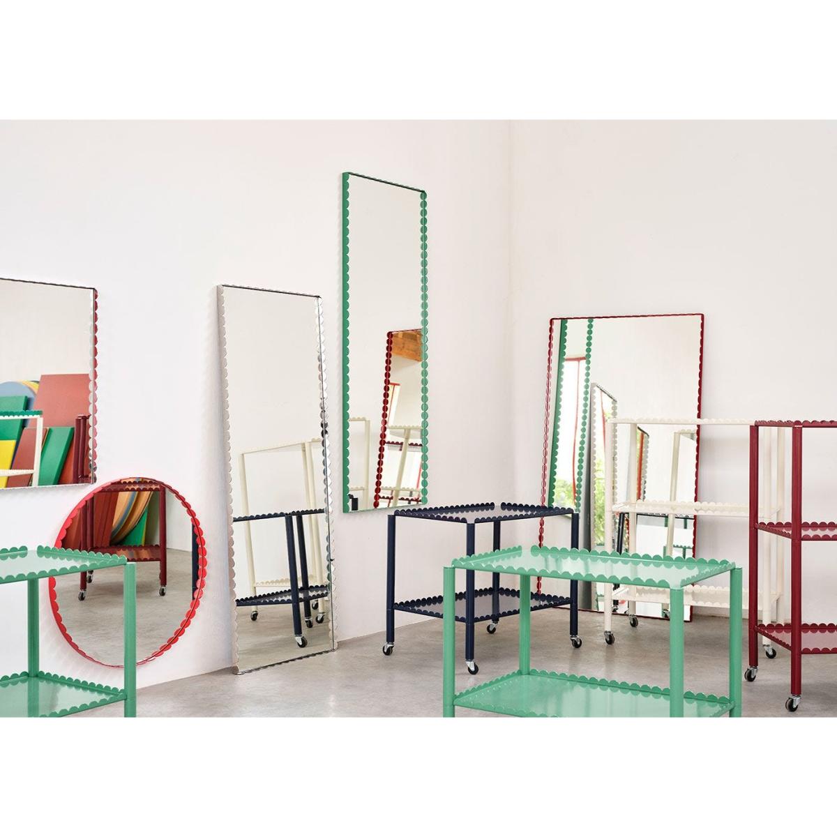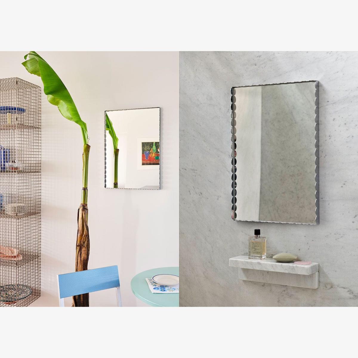 Designed by Belgian duo Muller Van Severen, Arcs Mirror is formed by a unified chain of vertical arcs that encase the mirror to create an elegant, scalloped edge. Made in stainless steel with a mirrored finish or powder coated steel in different colours, its variety of sizes and shapes ranges from a small round mirror to a large rectangular one, making it suitable for all rooms and uses.