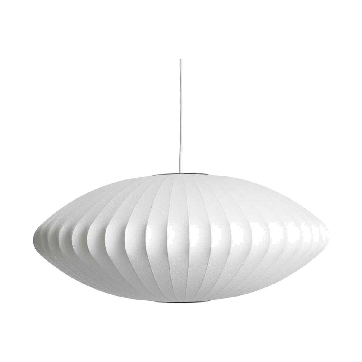 Part of the Nelson Bubble Lamp series, the Nelson Saucer Bubble Pendant's wide surface area diffuses soft light into any interior. It comes with a ceiling plate, which allows it to delicately float overhead. George Nelson originally designed the Bubble Lamp series in 1952, inspired by a set of silk-covered Swedish hanging lamps. Comes in four sizes, from Small to Extra Large.