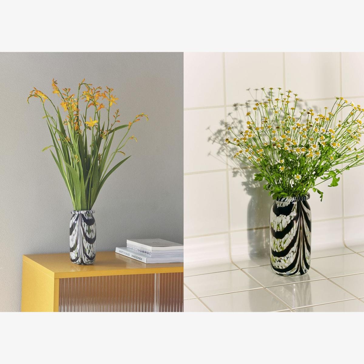 Handmade using a special glassblowing technique that involves multiple layers of coloured glass dots, the Splash Vase features a unique swirled pattern. Available in different designs, the vases can be used both for displaying flowers and as decorative objects.