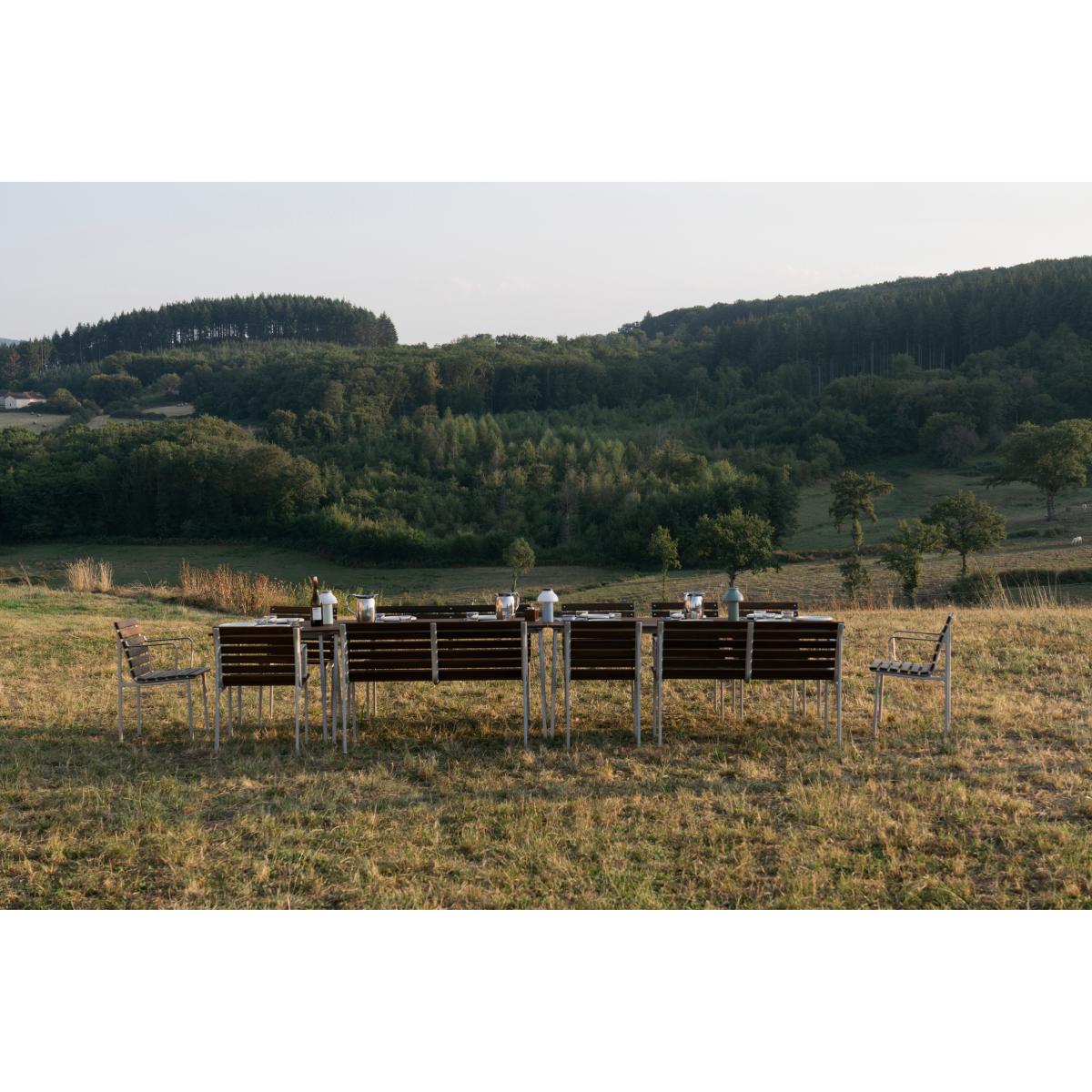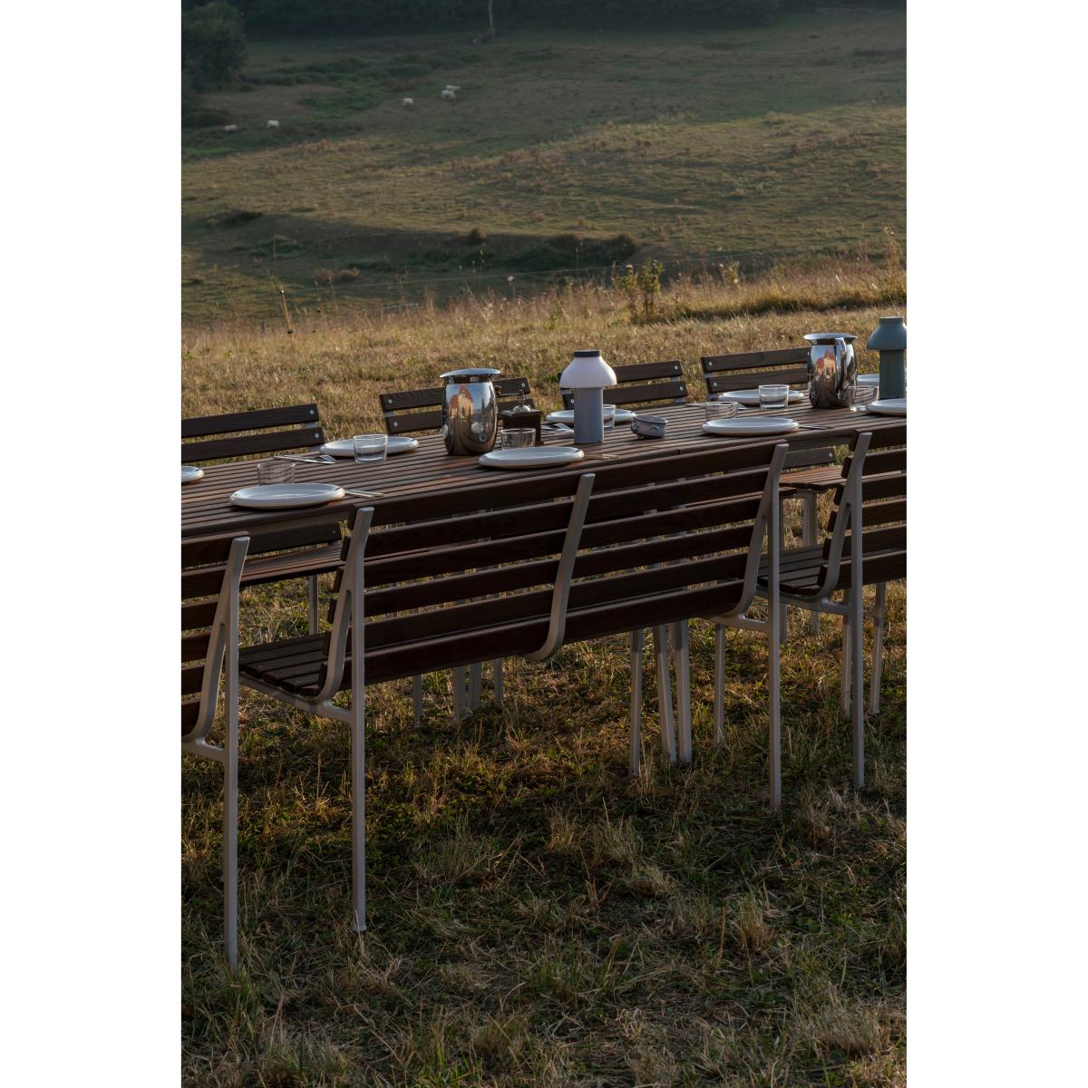 The Traverse Dining bench from HAY is designed by Erwan Bouroullec and is part of the Traverse collection. The bench is manufactured for outdoor use with a robust frame in cast aluminium and slats of heat-treated ash. The wood develops a silver-grey patina over time and both the frame and the wood have a finish protected for outdoor use.
