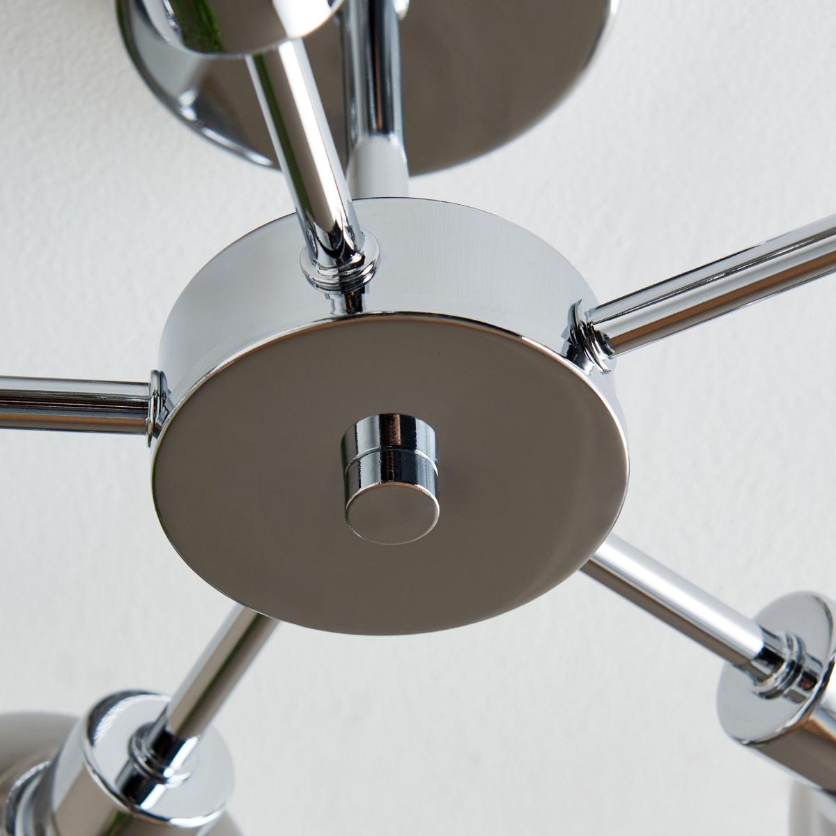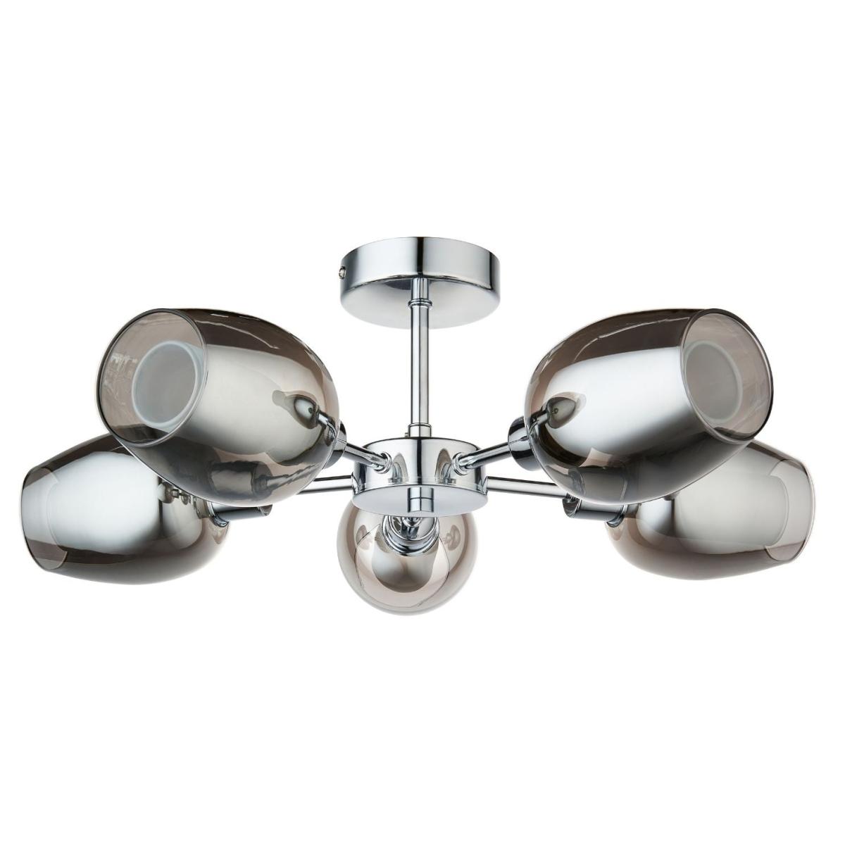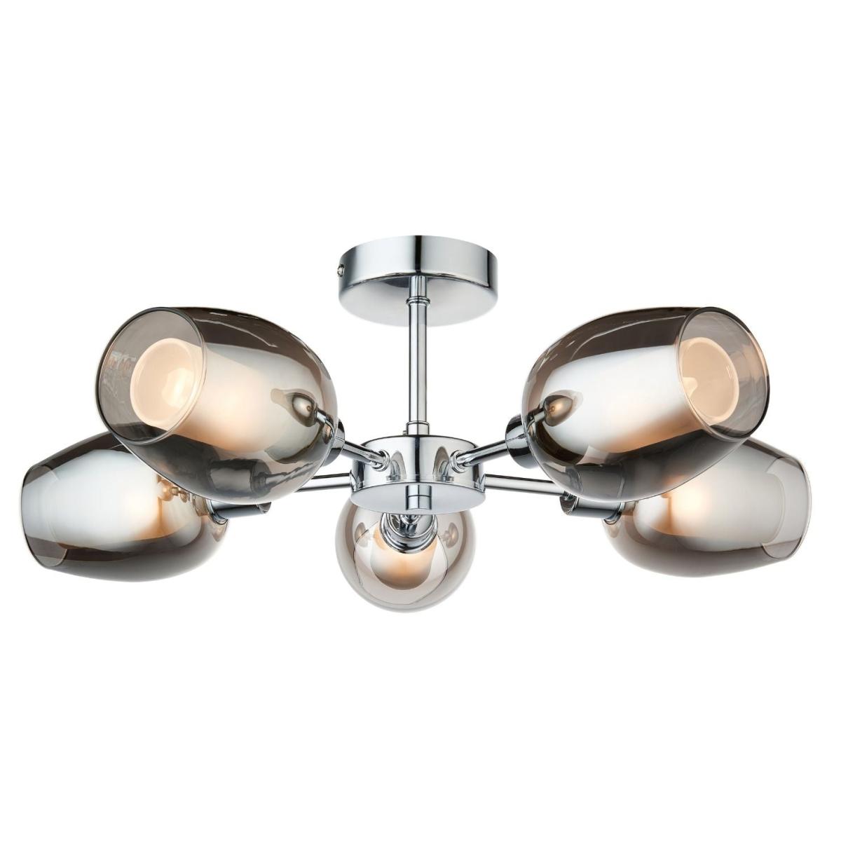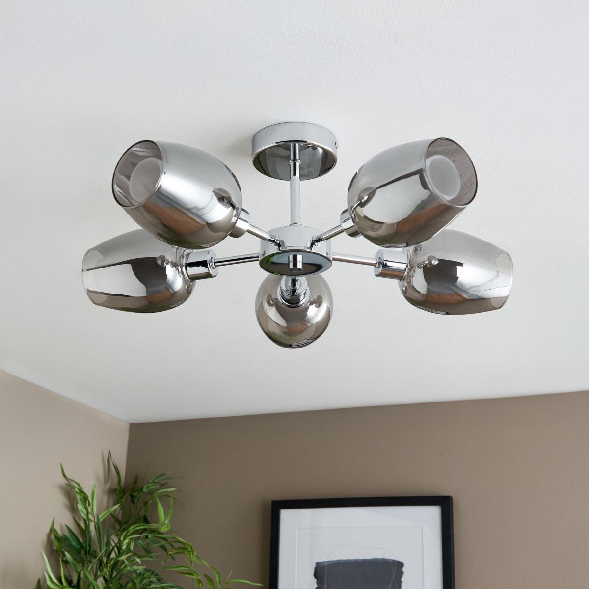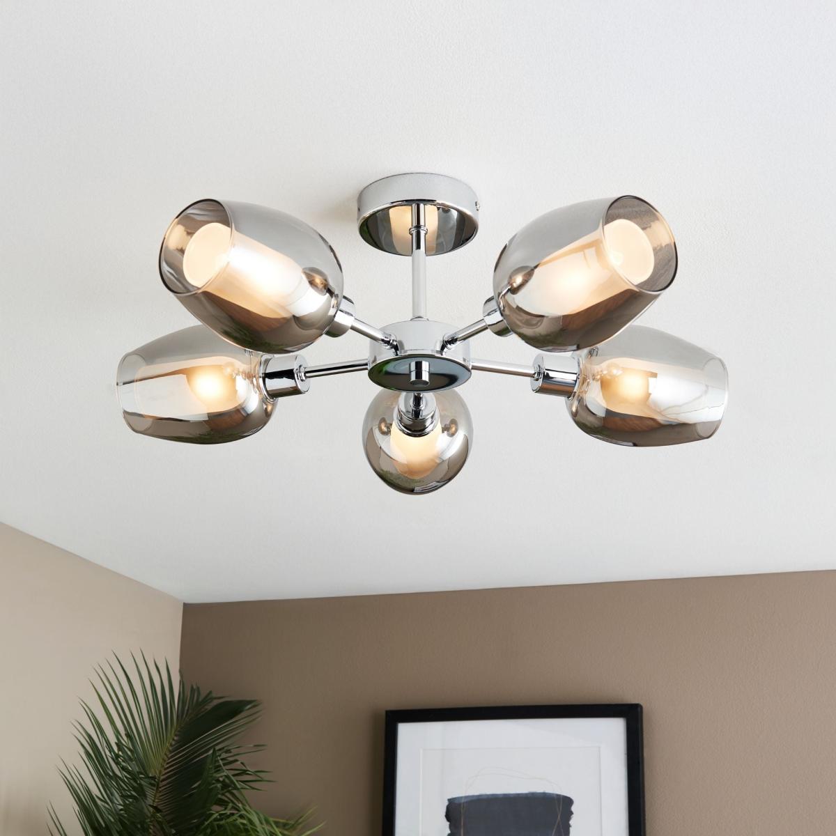 Hayden 5-light semi-flush ceiling light, featuring smoked glass shades, with frosted glass inner shades and a polished chrome finish. The Hayden ceiling light offers a sleek and modern aesthetic, perfect for elevating contemporary interiors. Featuring a polished chrome finish, this fixture exudes a clean, sophisticated look. The five smoked glass outer shades add a touch of drama and elegance, while the frosted glass inner shades provide a soft, diffused light that creates a warm and inviting ambiance. Ideal for living rooms, bedrooms or hallways, the Hayden ceiling light balances style and function. Its semi-flush design makes it suitable for spaces with lower ceilings, while the polished chrome and layered glass shades offer a striking, modern statement piece for any room. Hayden 5-light semi-flush ceiling light, featuring smoked glass shades, with frosted glass inner shades and a polished chrome finish. The Hayden ceiling light offers a sleek and modern aesthetic, perfect for elevating contemporary interiors. Featuring a polished chrome finish, this fixture exudes a clean, sophisticated look. The five smoked glass outer shades add a touch of drama and elegance, while the frosted glass inner shades provide a soft, diffused light that creates a warm and inviting ambiance. Ideal for living rooms, bedrooms or hallways, the Hayden ceiling light balances style and function. Its semi-flush design makes it suitable for spaces with lower ceilings, while the polished chrome and layered glass shades offer a striking, modern statement piece for any room.