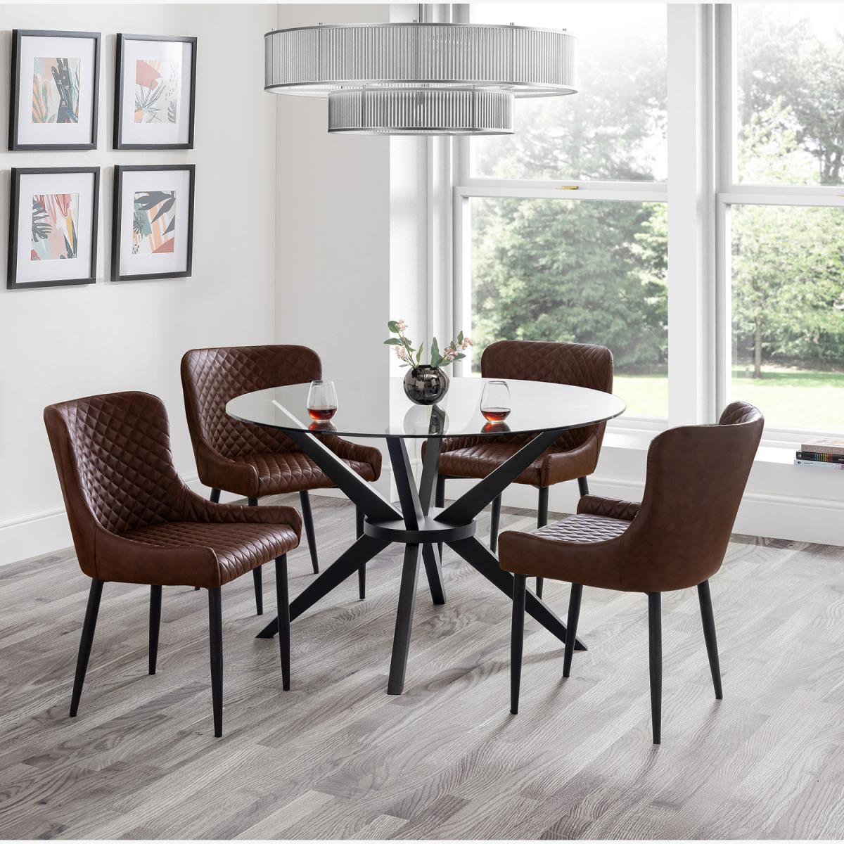The Hayden Round Table combines a sleek, tempered glass top with a contemporary black solid Beech base to create a statement look in your home. Perfect for drinks, dinner, or catching up with friends over a coffee, Hayden is a versatile piece that suits various styles of decor. Matched with Luxe Chairs.