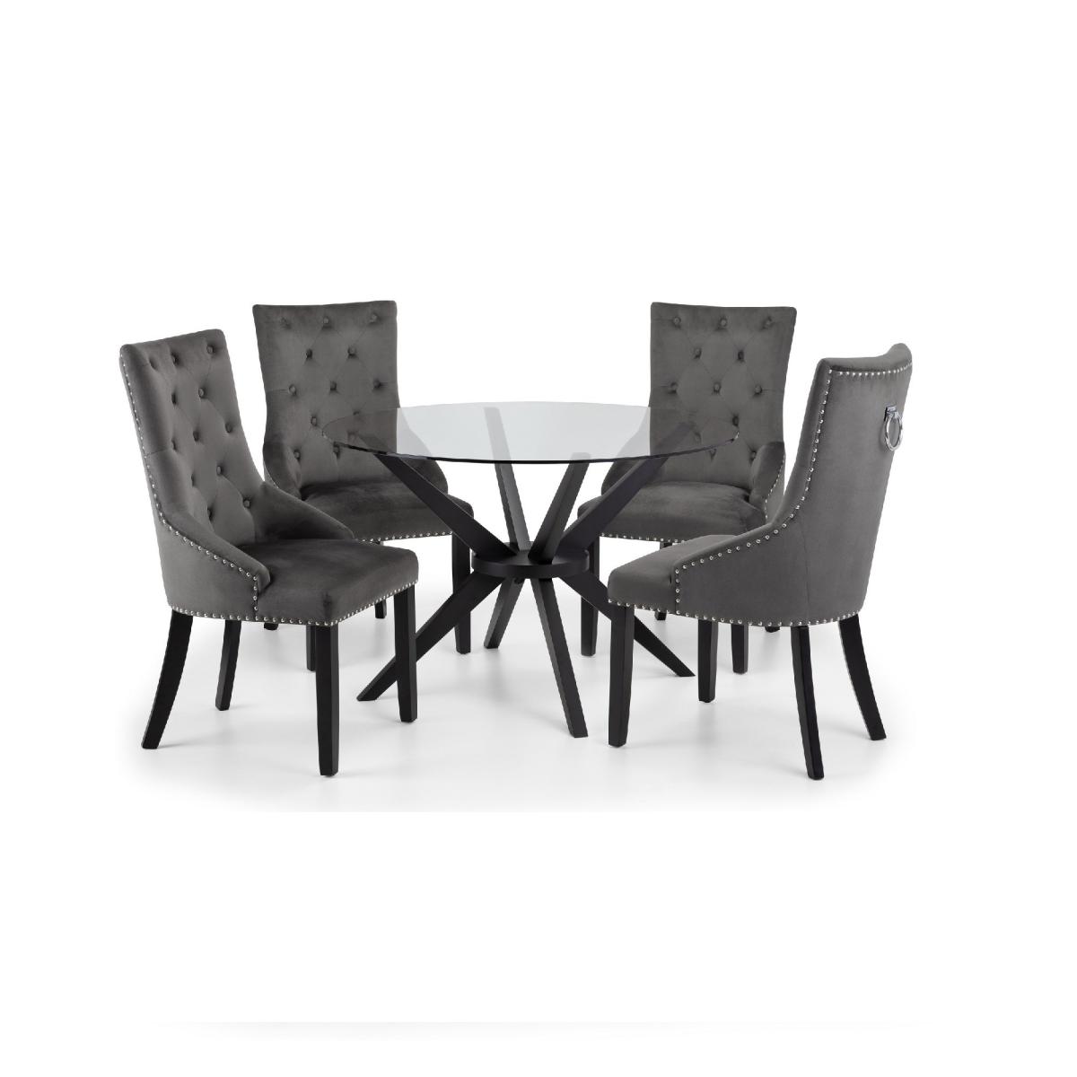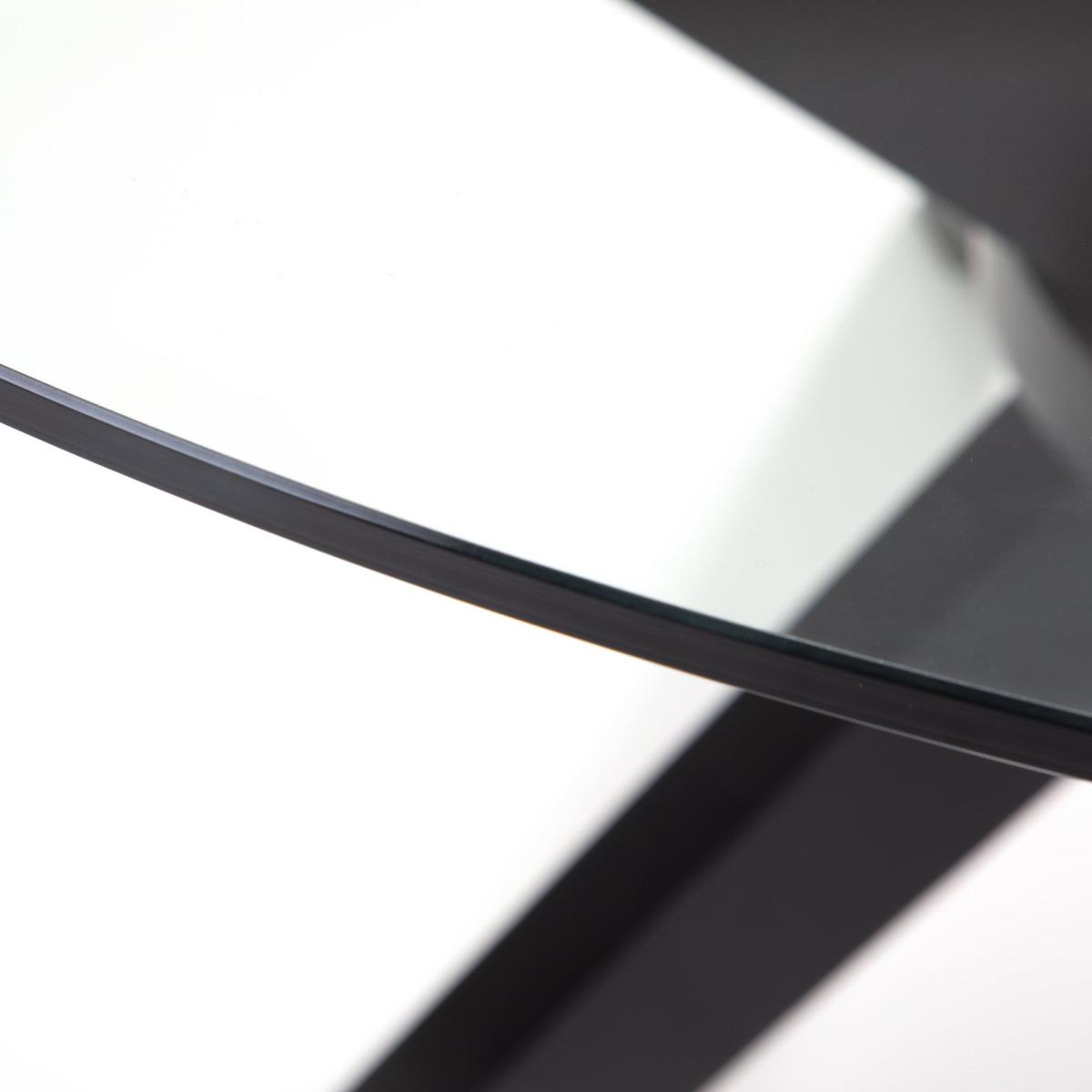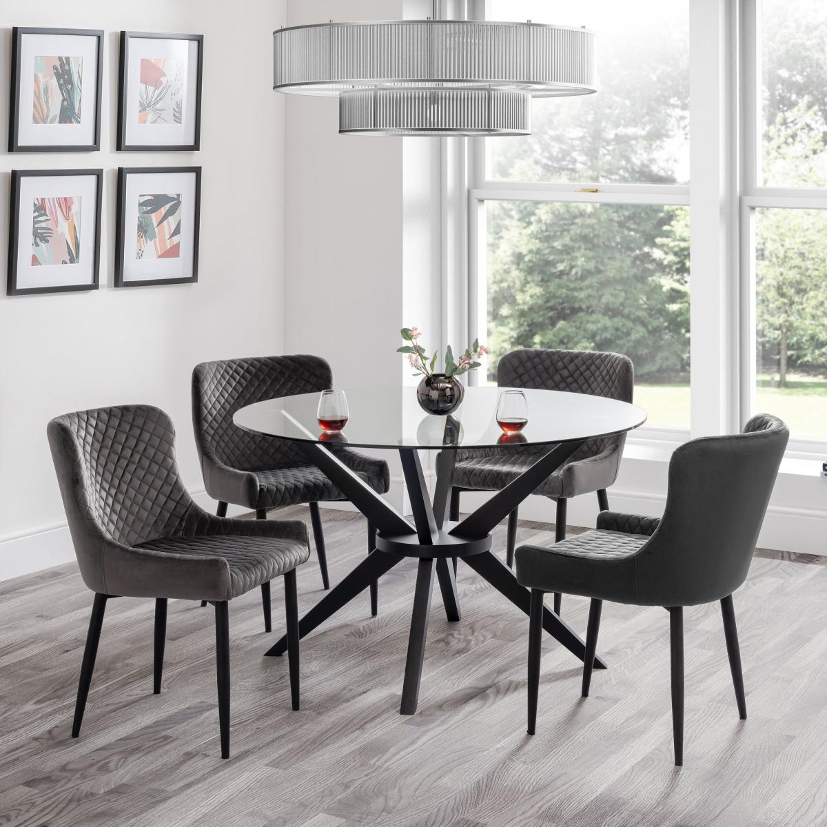 I love the Hayden round glass dining table for its sleek and contemporary aesthetic, which works particularly well in modern or minimalist interiors. Its black base adds grounding and sophistication, making it a versatile focal point. When styling, consider pairing it with chairs that contrast or complement the black finish-fabric textures add softness, while metal or acrylic pieces can enhance its modern vibe. The glass surface also makes the space feel more open and airy, so it’s ideal for smaller dining areas or open-plan kitchens. Practical tips include keeping clutter minimal around the table and considering layered lighting, like a statement pendant, to highlight its shape and create a welcoming dining environment.