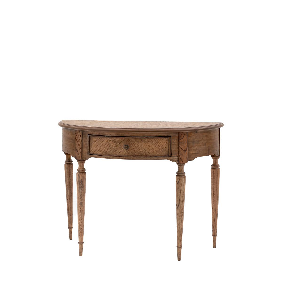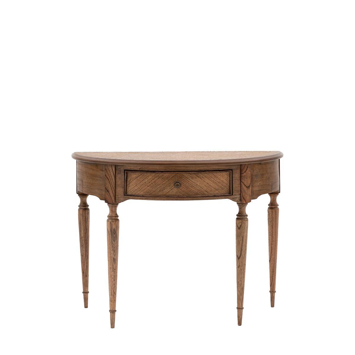 With a sophisticated half-moon shape, this console table is perfectly suited to bedrooms, hallways or any living space where you want to add a timeless elegant style with a modern touch. Offering a ‘new traditional’ look, this stunning console table features beautiful marquetry in exquisite tonal rich brown Mindy wood solids & veneers, with inlaid book-matched details. The bronze beehive drawer pulls and turned spindle legs add the finishing touch. Product details1 Drawer Laquered legs. Anti-topple kit included. Partial assembly required - legs/feet only. Product Composition - Mindi / Mindi Veneer / MDFProduct Dimensions - 40 cm x92.5 cm x73 cm , Weight - 13.2 KGInternal Drawer Size- W3 x D25 x H6cm Clearance to floor- 54.8cm Package Dimensions - 102 cm x 48.5 cm x 33 cm, Weight 15.6 kg. This product will be dispatched by one of our trusted suppliers. You’ll be contacted by their selected courier about your delivery. Please note: this product cannot be delivered to all Offshore Islands, Northern Ireland or Republic of Ireland. GALLE01