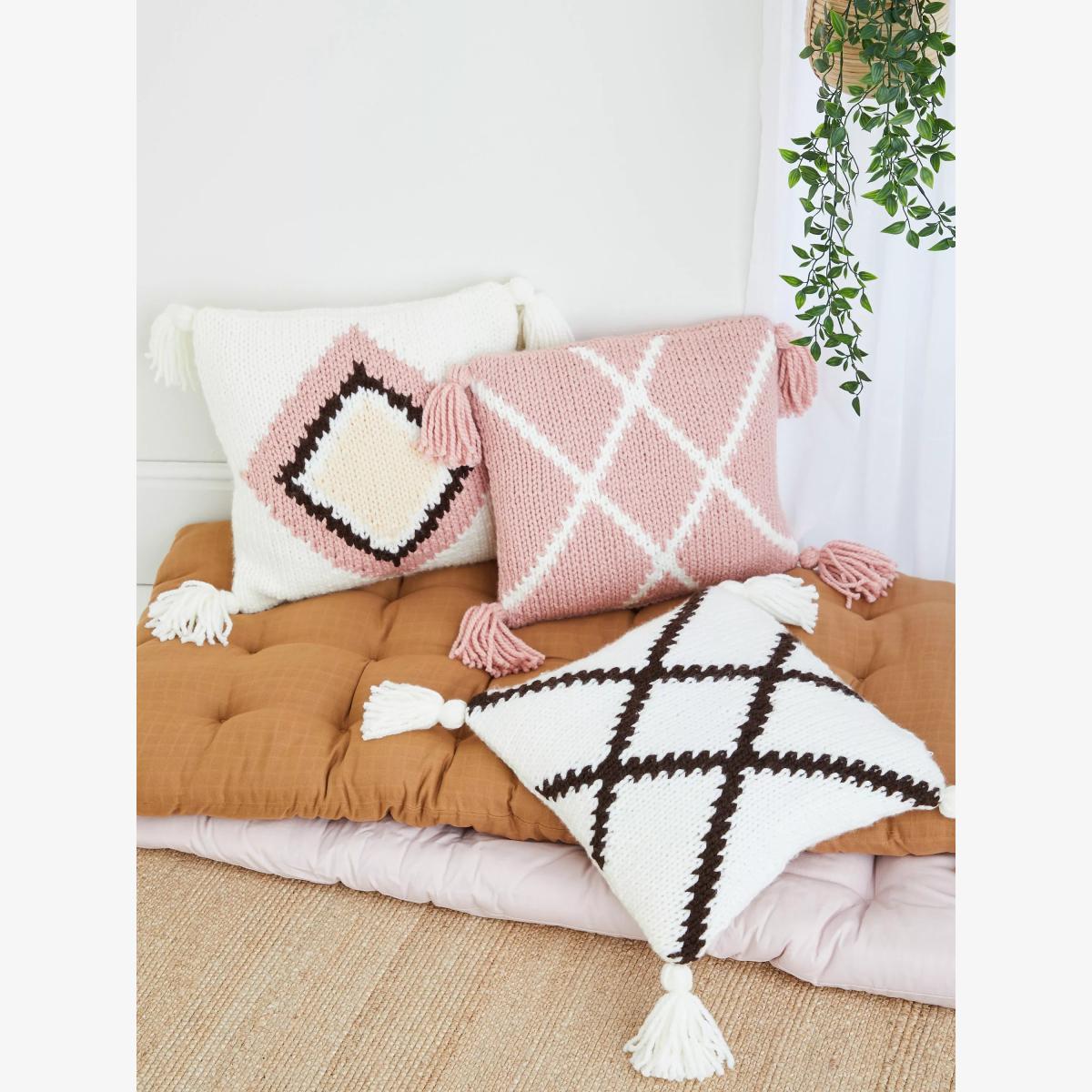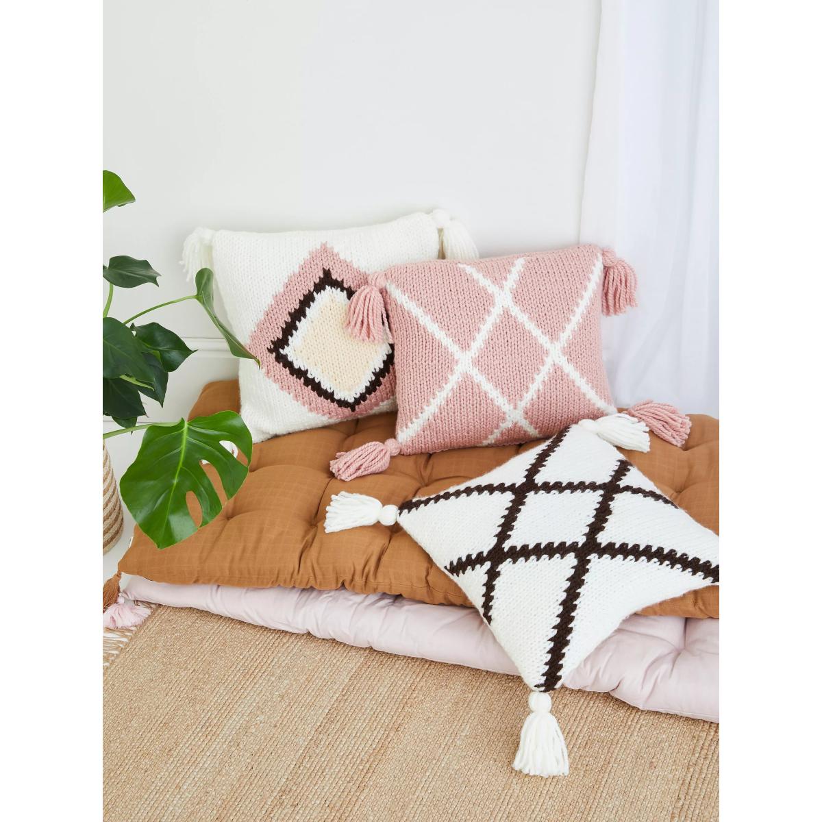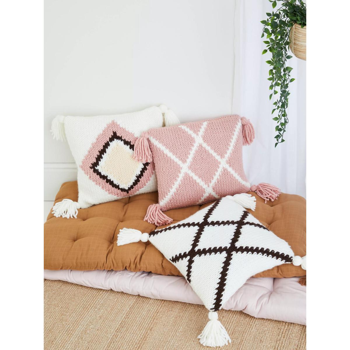These coordinating cushions, each with a distinctive diamond pattern, feature an intarsia technique to keep the graphic designs neat while tassels add a relaxed finishing touch. You'll need 1x pair of 10mm (UK000, USA15) knitting needles as well as 1x pair of 10mm (UK000, USA15) knitting needles or 1x 10mm (UK000, USA15) 80cm circular needle.