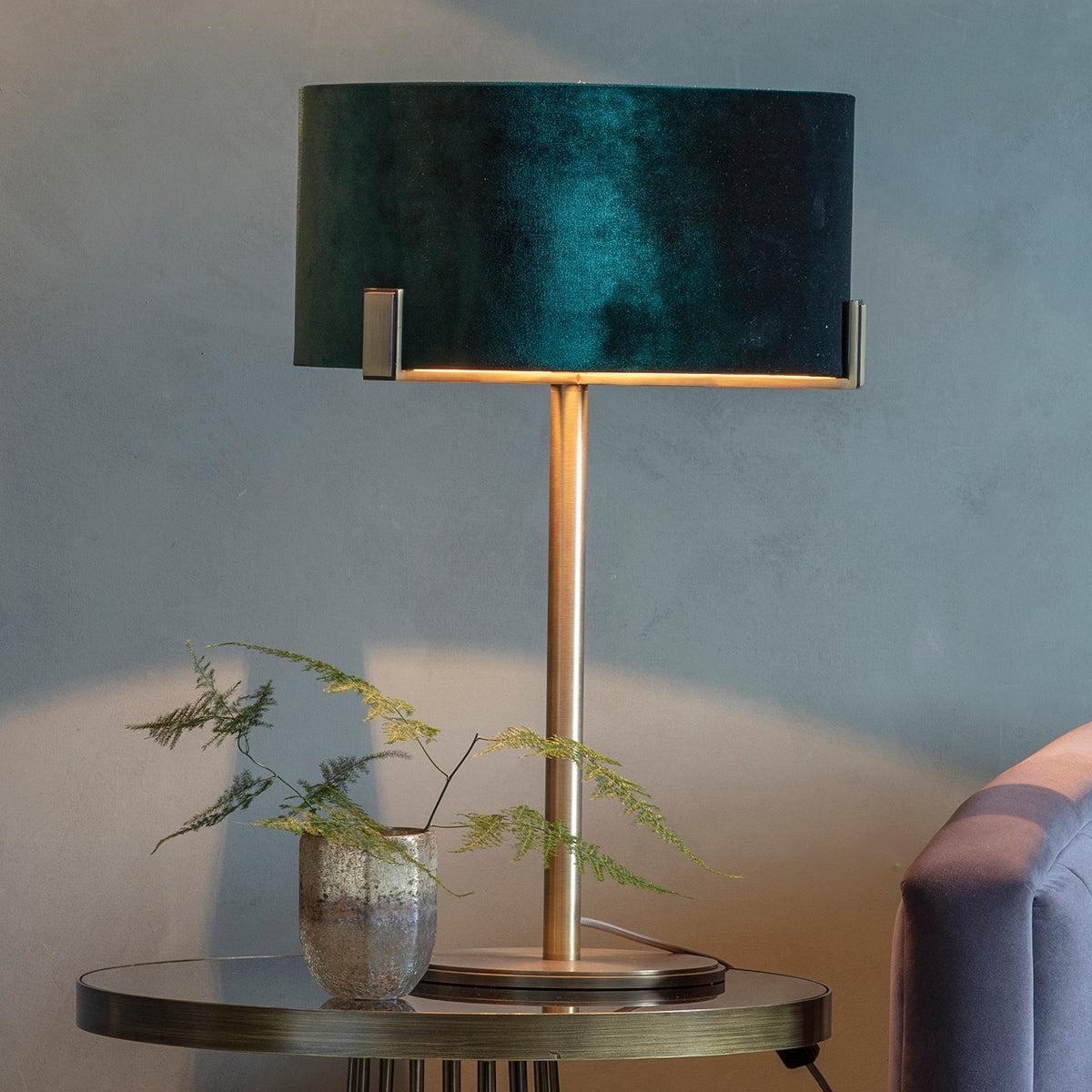 Luxurious, sophisticated table light with understated metalwork in a classic antique brass effect plated finish. The elegant emerald green velvet shade is supported directly on the metalwork creating a clean line aesthetic.