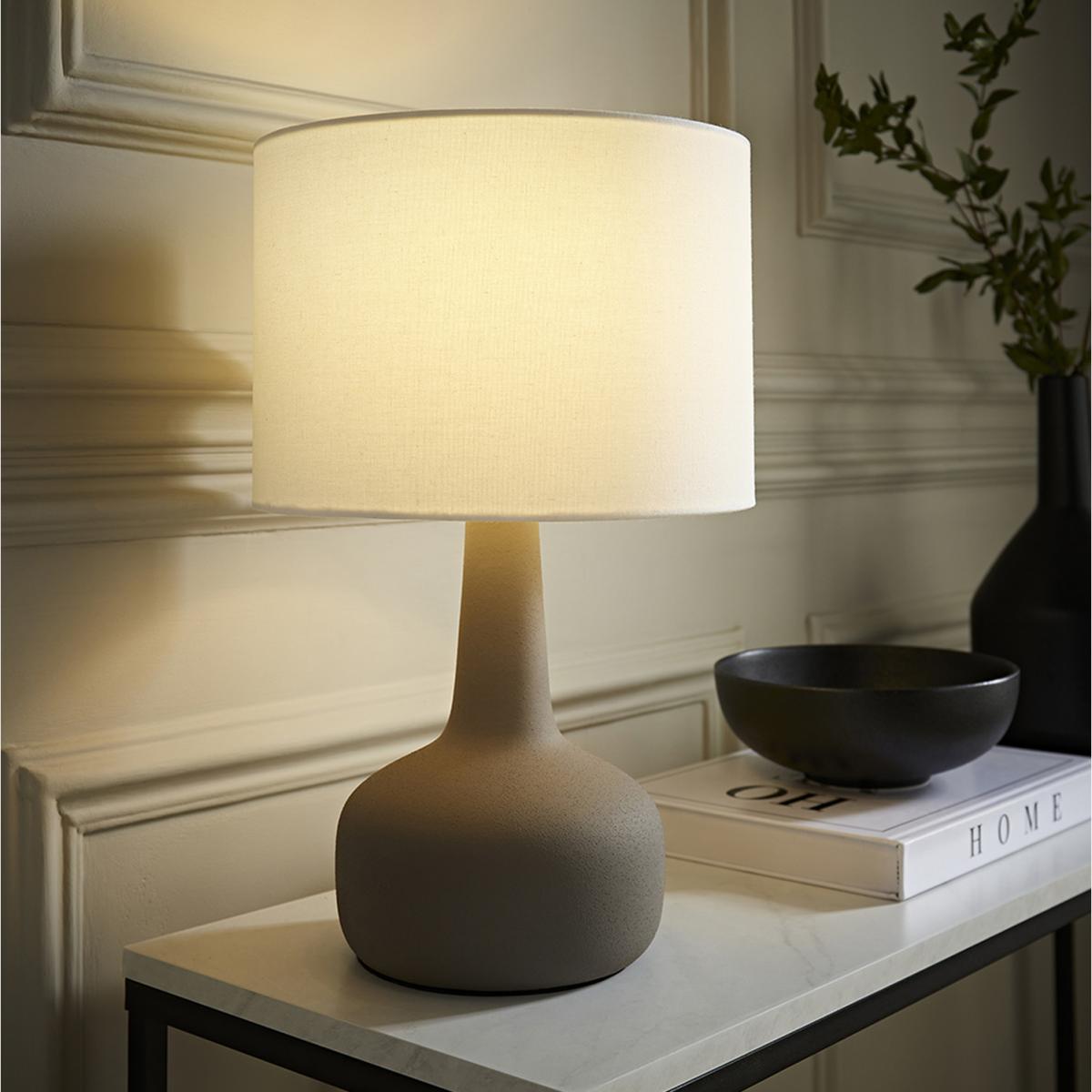 The Hayley squat lamp is a versatile piece that works well in both contemporary and minimal interiors, thanks to its streamlined ceramic base and neutral grey finish. I love how its understated design allows it to slot into various spaces, whether on a side table in the living room or a bedside table in a bedroom. Pair it with soft textiles and simple accessories to create a calm, inviting atmosphere. Practical styling tips include mixing the lamp with other grey accents for a cohesive look or using it as a contrast alongside warmer tones to add a touch of modern elegance. The linen drum shade softens the light, making it ideal for creating a cosy ambiance during the evenings.