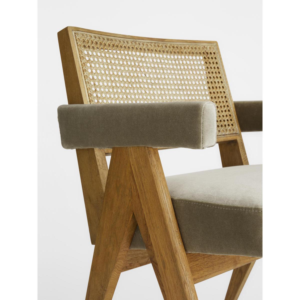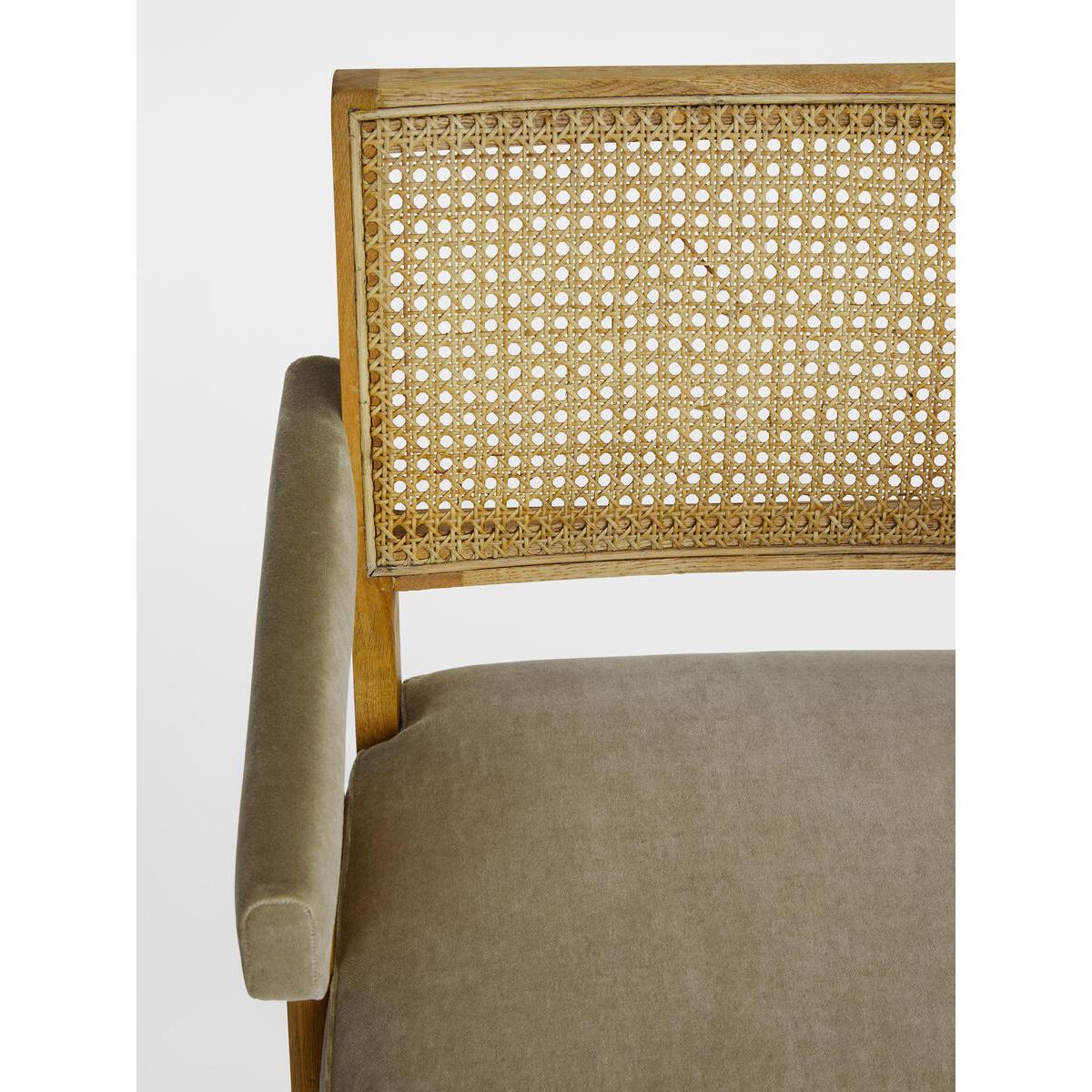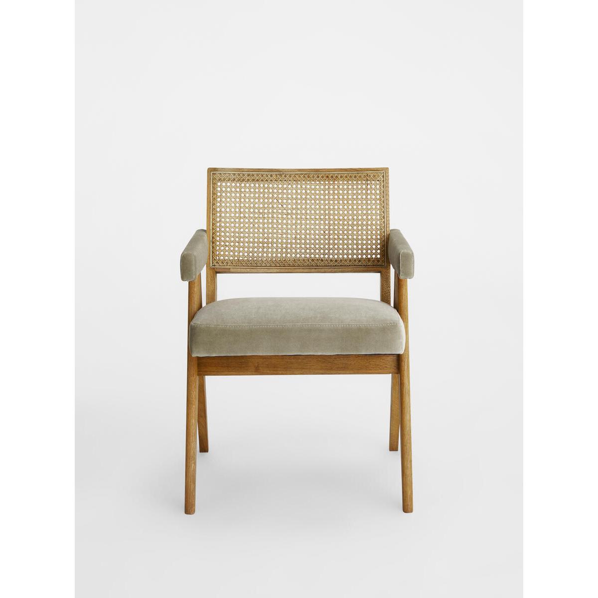 Originally designed for 180 House, our Hayward armchair is builtonto a solid oak frame with a wire-brushed finish. It has a naturalwoven cane back and is upholstered with a padded fern cushion andarms. Solid oak chair. Wire-brush finish. Natural cane back. Padded seat cushion. Upholstered velvet arms. Fern velvet colourway. Inspired by 180 House.