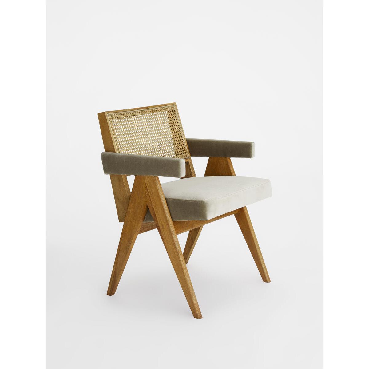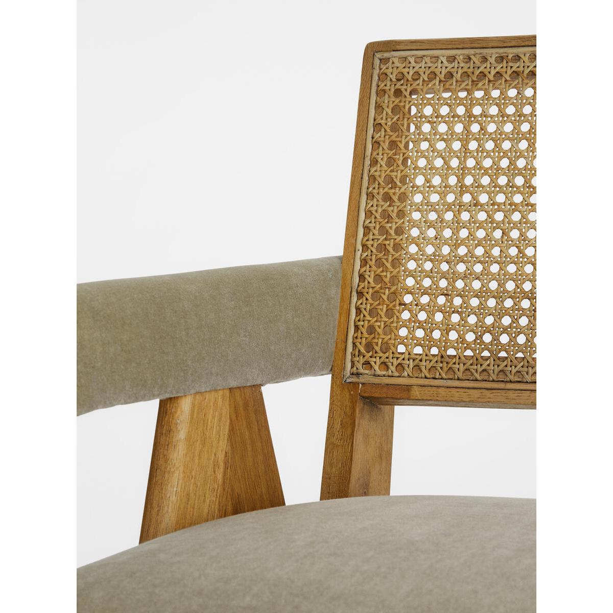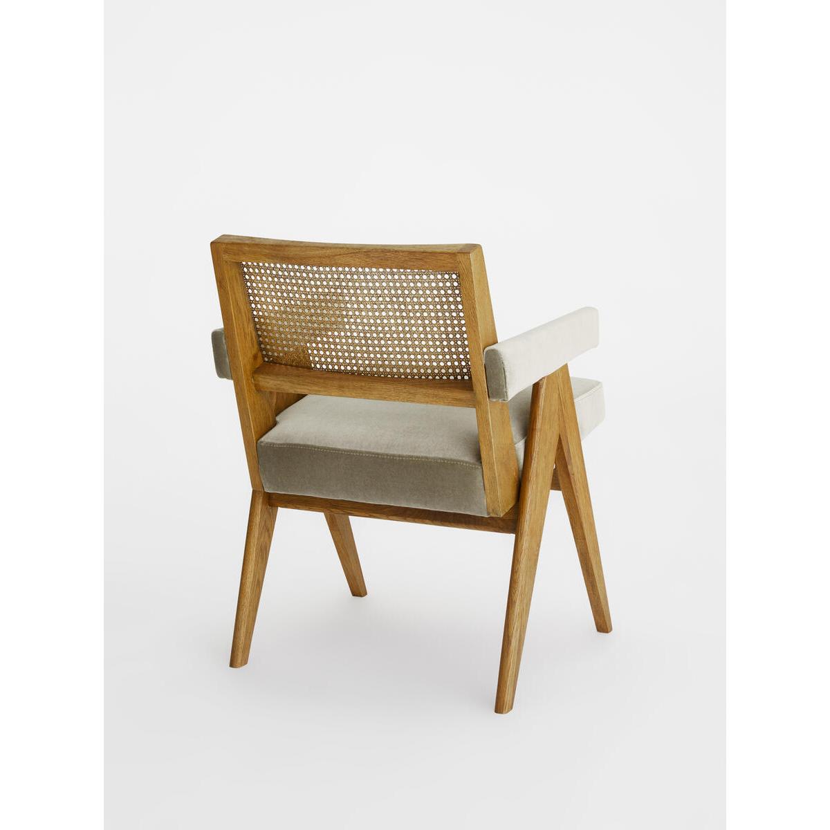 Originally designed for 180 House, our Hayward armchair is builtonto a solid oak frame with a wire-brushed finish. It has a naturalwoven cane back and is upholstered with a padded fern cushion andarms. Solid oak chair. Wire-brush finish. Natural cane back. Padded seat cushion. Upholstered velvet arms. Fern velvet colourway. Inspired by 180 House.
