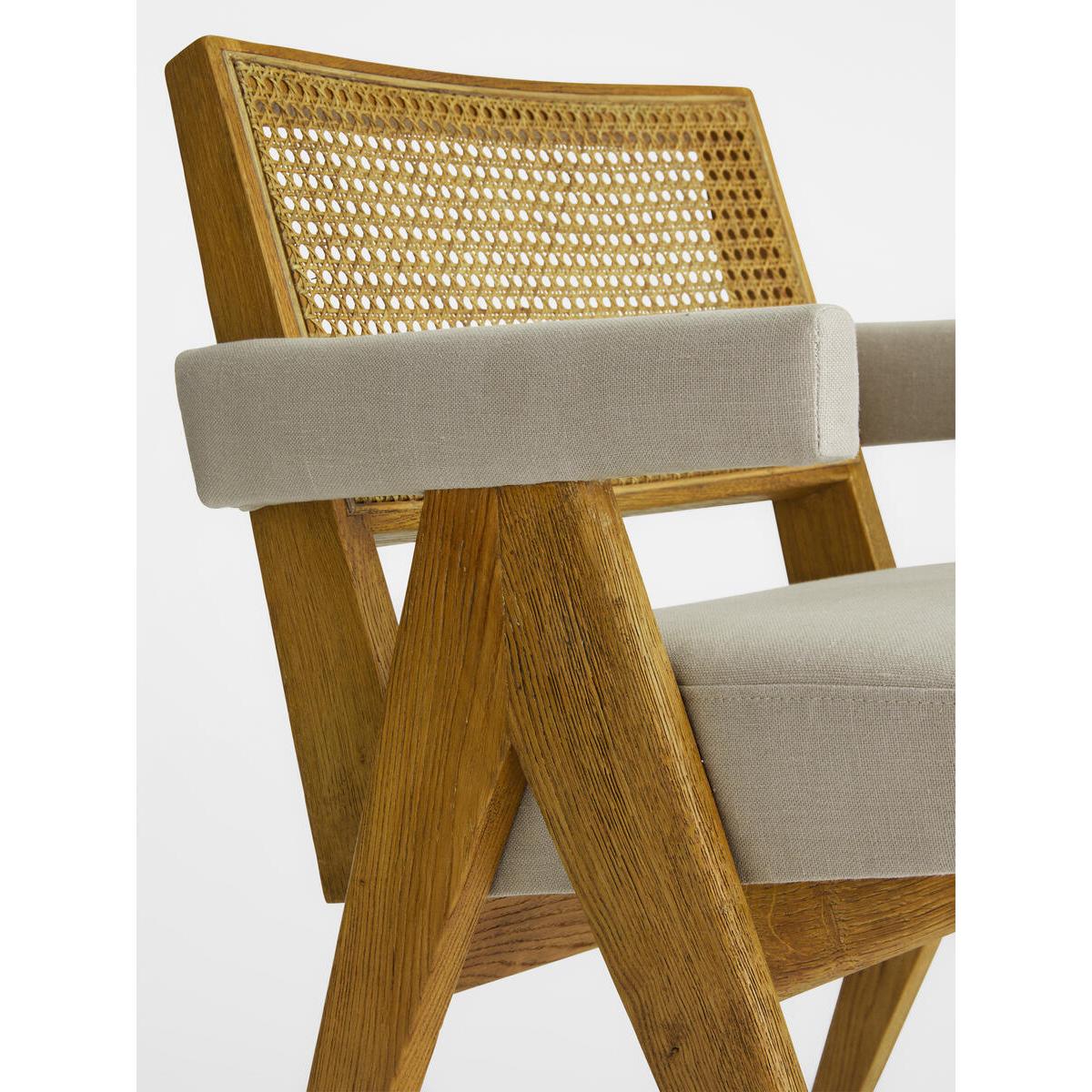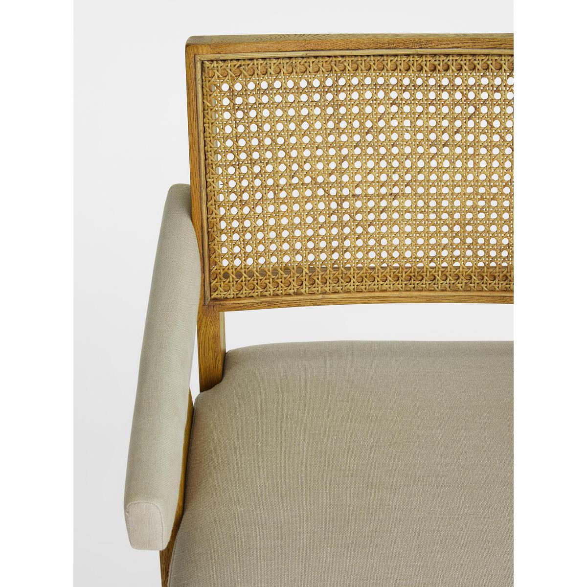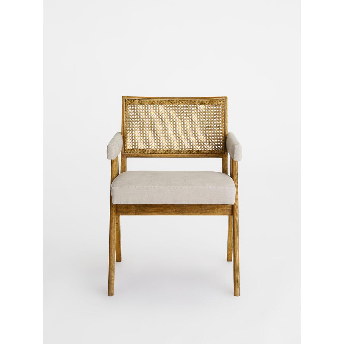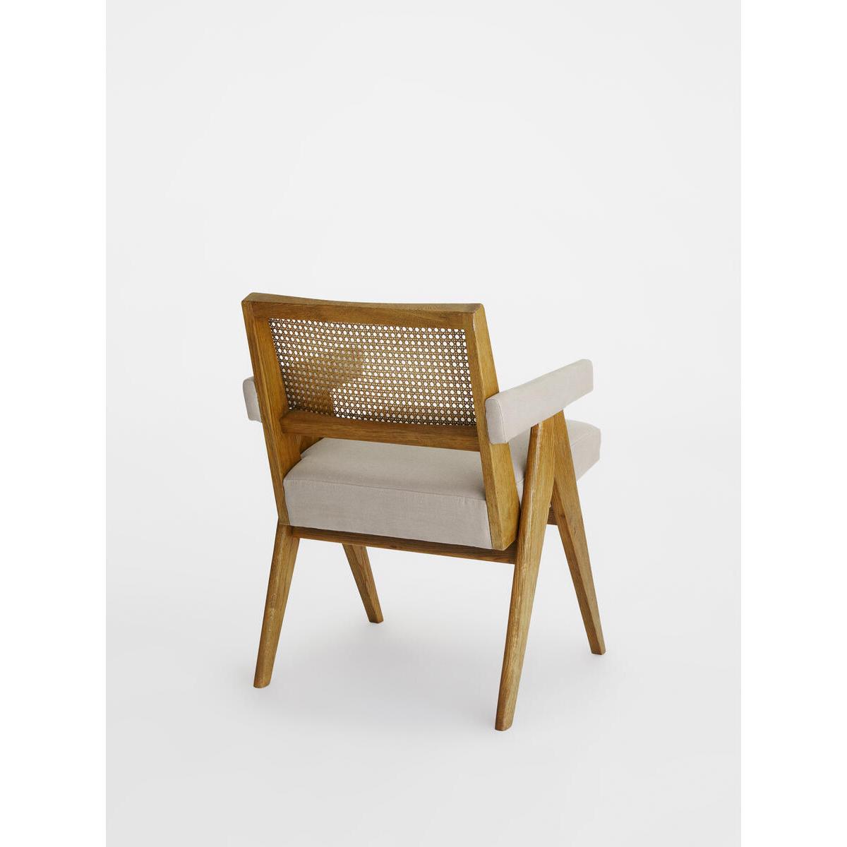 Originally designed for 180 House, our Hayward armchair is built onto a solid oak frame with a wire-brushed finish. It has a natural woven cane back and is upholstered with a taupe linen cushion and arms. Solid oak chair Wire-brush finish Natural cane back Padded seat cushion Upholstered arms Taupe linen colourway Inspired by 180 House