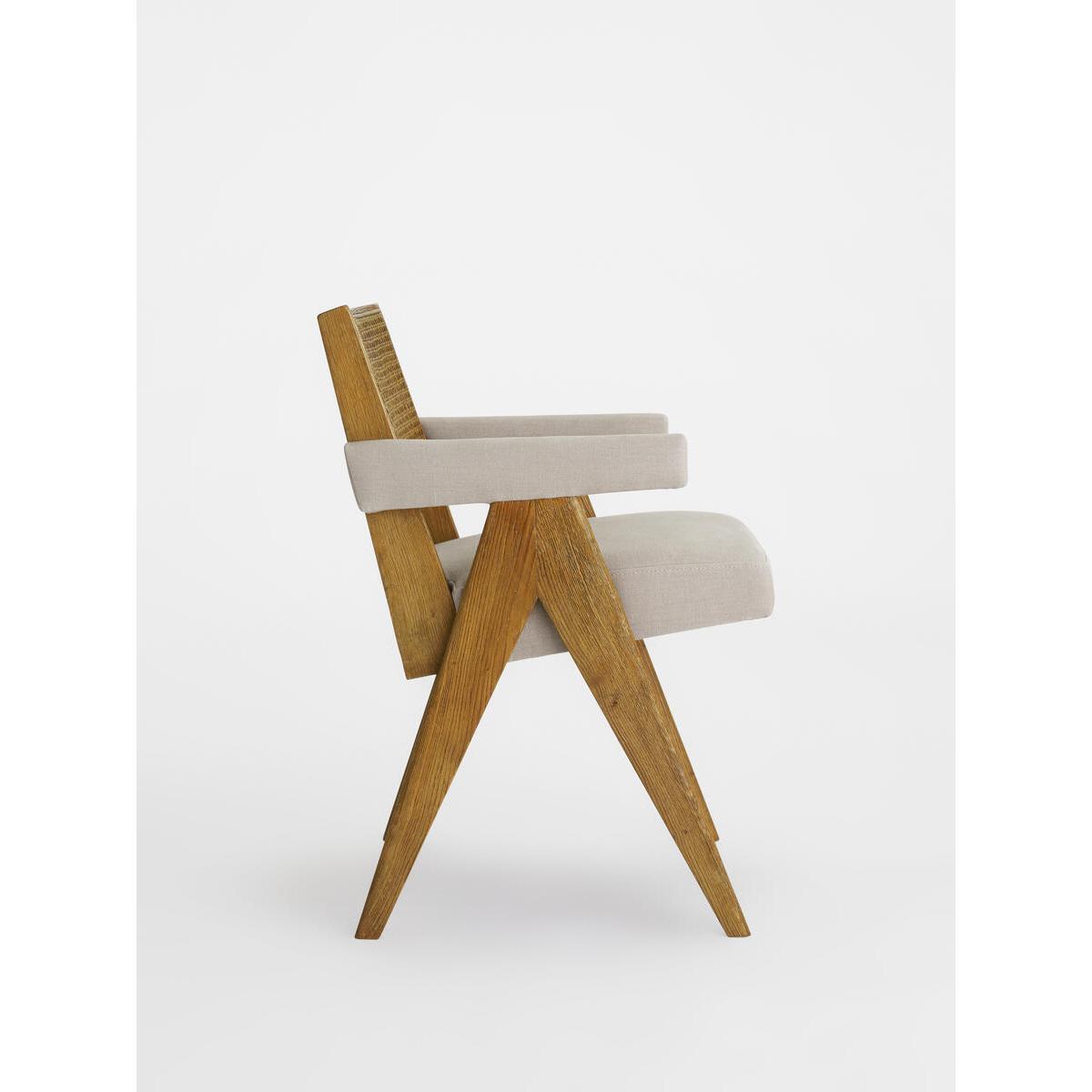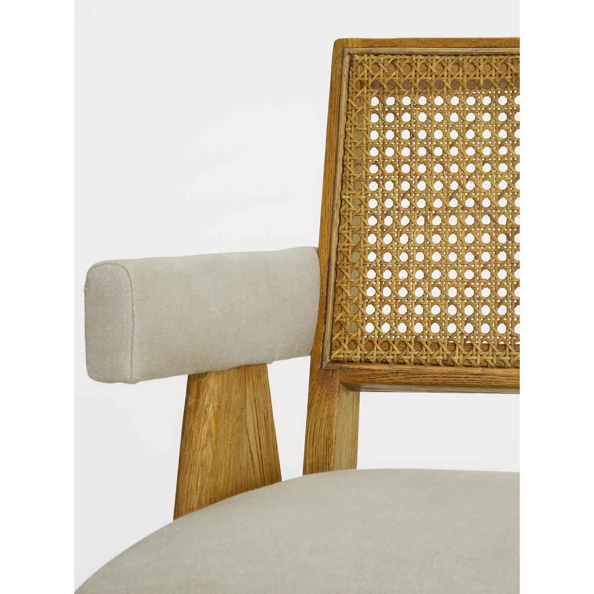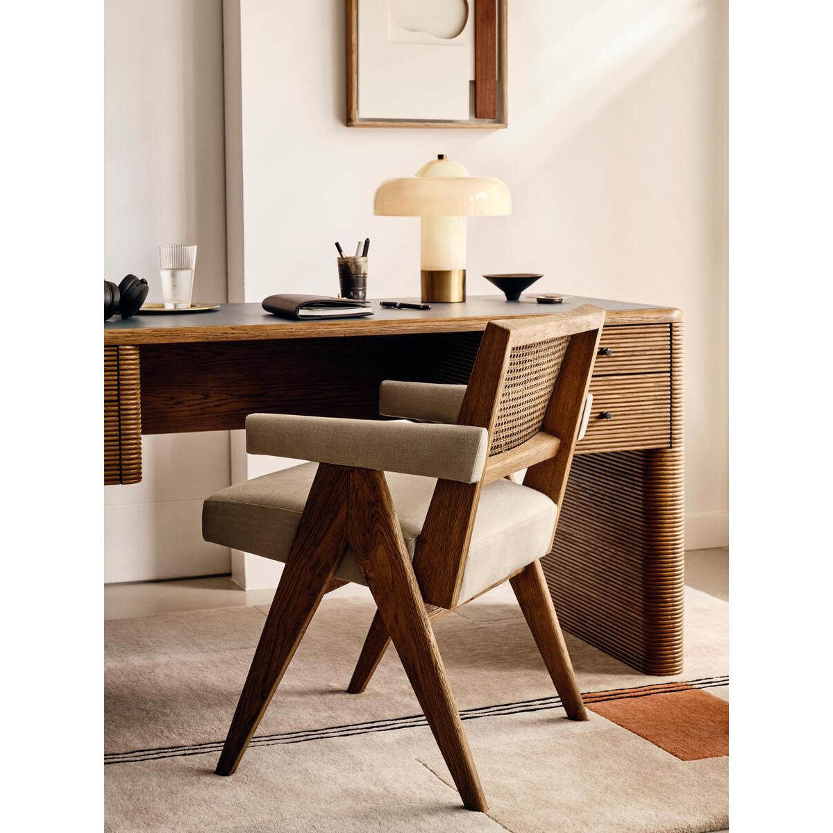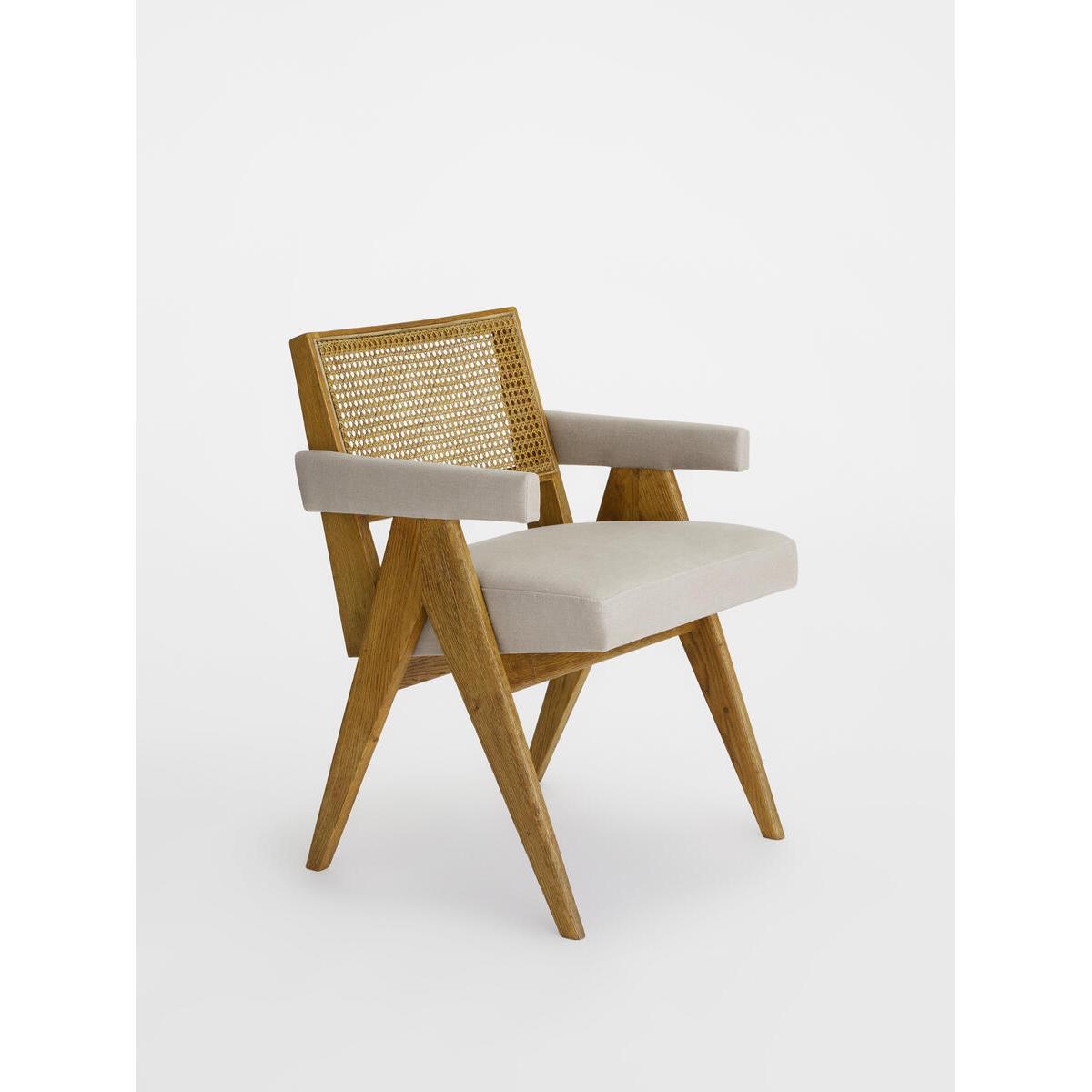 Originally designed for 180 House, our Hayward armchair is built onto a solid oak frame with a wire-brushed finish. It has a natural woven cane back and is upholstered with a taupe linen cushion and arms. Solid oak chair Wire-brush finish Natural cane back Padded seat cushion Upholstered arms Taupe linen colourway Inspired by 180 House