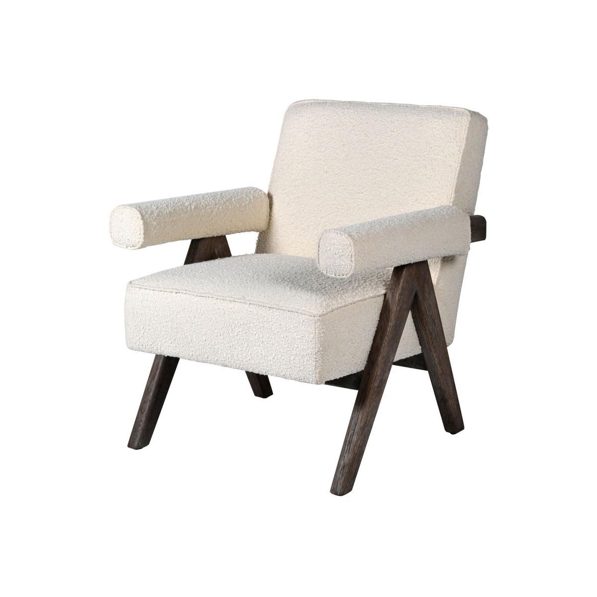Snuggle into the soft boucle upholstery of this cream armchair with a sculptural wood frame and matching padded arms.