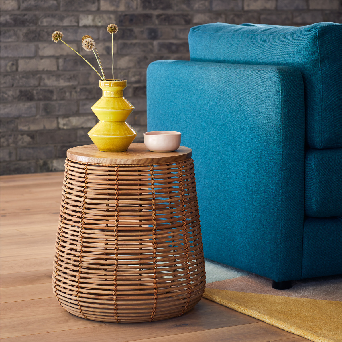 Bring a natural touch to your living area with the Hazel natural rattan side table. Handwoven in Vietnam, this side table is full of visual interest thanks to its striking mix of materials and textures. With a real rattan base and oak veneer top, Hazel will soon become the talking point of your home. Perfect for placing in a living room or conservatory, there’s plenty of space for a table lamp and cups of tea, but remember to place down coasters to protect the surface from excess heat and scratches. Part of the Hazel range, a matching coffee table is available.