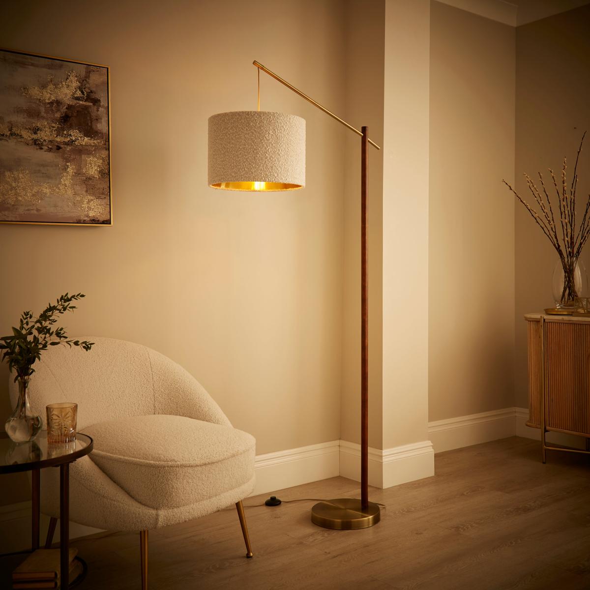 * Mid-Century Inspired* Boucle Shade* Rich-Coloured FSC Wooden Base* Extended Arm Extend your style with the Hazelle Boucle Wooden Floor Lamp. Featuring a luxurious boucle shade and a rich-coloured FSC wooden base with an extended arm, it's perfect to sit over a sofa or in the corner of the room – a true design statement.
