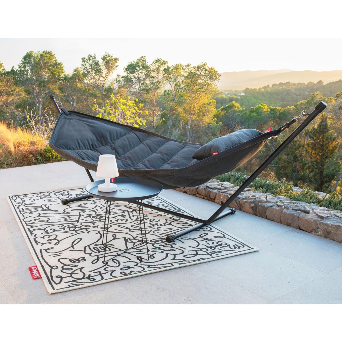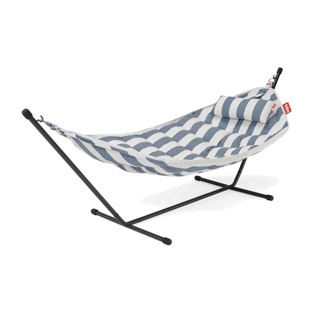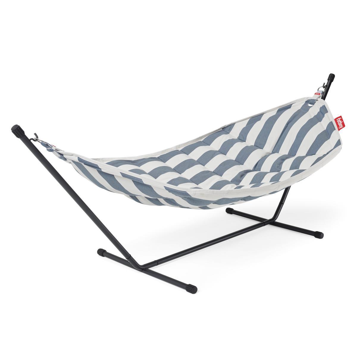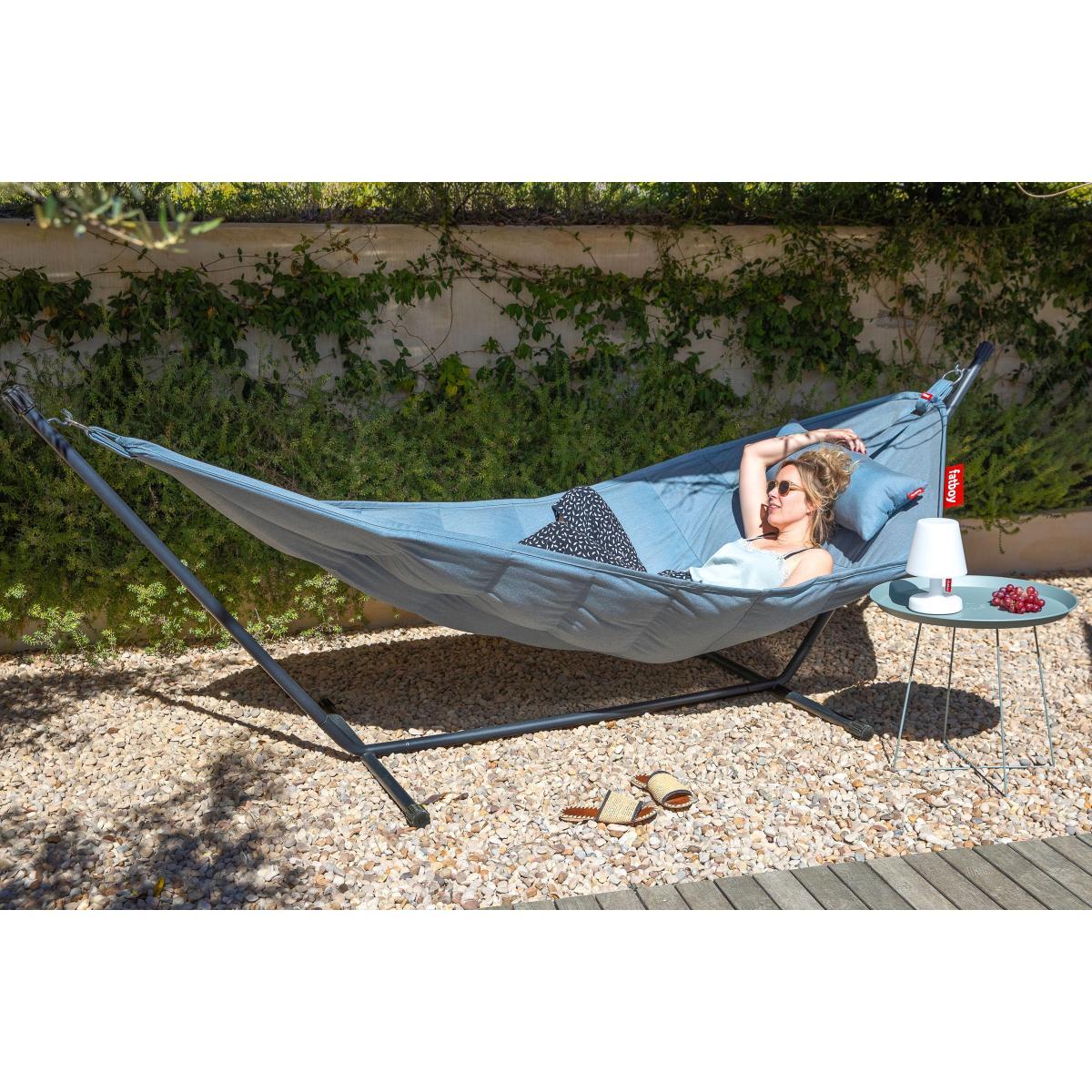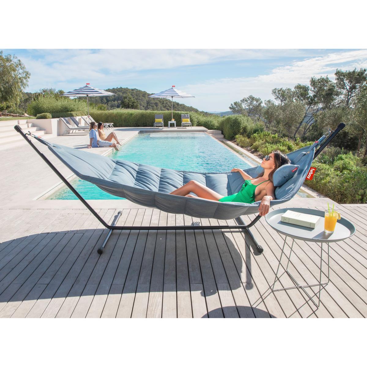 With its XXL dimensions, thick padded mattress and cushion, the Headdemock Superbe hammock provides unbelievable comfort. Its modern, relaxed style will transform your gardens, terraces, verandas and swimming pool edges. This version of the Headdemock hammock is made of Olefin fabric: a high-performance outdoor fabric. Waterproof, it can withstand bad weather, mould, UV and fading. This XXL hammock is great for lounging around in for 1 or 2 people. It comes with its own support: so you don’t need a rope or a tree to find your happiness! Headdemock is a foldable, compact hammock ready to really shake things up. Very solid, the steel structure is removable : so you can easily carry your hammock with the shoulder bag provided. It’s practical for taking your hammock on vacation, with friends, on the beach. The removable head cushion is easily attached and stays in place. Just pass the small metal hook through the hole at the top of the hammock. Then you can adjust the height of the cushion using the adjustable strap. Fabric made from resistant Olefin yarn that is nevertheless soft, the upholstery combines the durability of traditional outdoor materials with the beauty and refinement of traditional upholstery fabrics. It is durable, resistant, quick and easy to clean. It is also light and soft to the touch, with more hang than you would think for such a highly-resistant fabric. The olefin fabric is waterproof, wicks away moisture and dries quickly. It is ideal for use near to pools and does not stay wet for long. What's more, the manufacturing process creates very little waste and the olefin fabric is 100% recyclable.