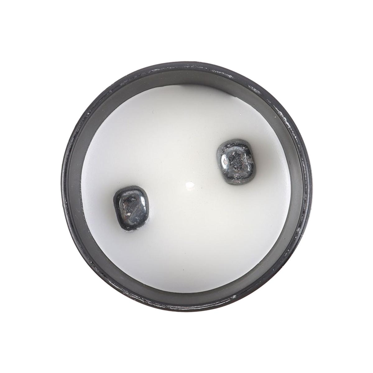 Detoxify negative energies with this healing hematite candle. Infused with the grounding properties of hematite, this unscented candle features polished gemstones to clear negativity and encourage positive energy. Encased in a black glass jar with a metal lid, packaged in a matching cardboard box ready for gifting. The crystal will release from the wax with use and can be later reused for a multitude of spiritual purposes. Approximate burn time of 18 hours.