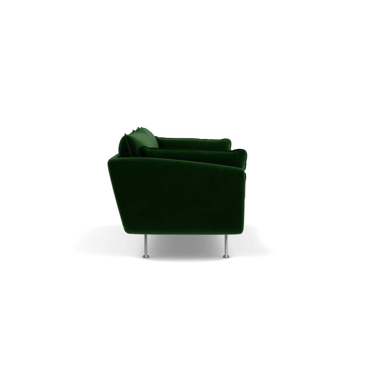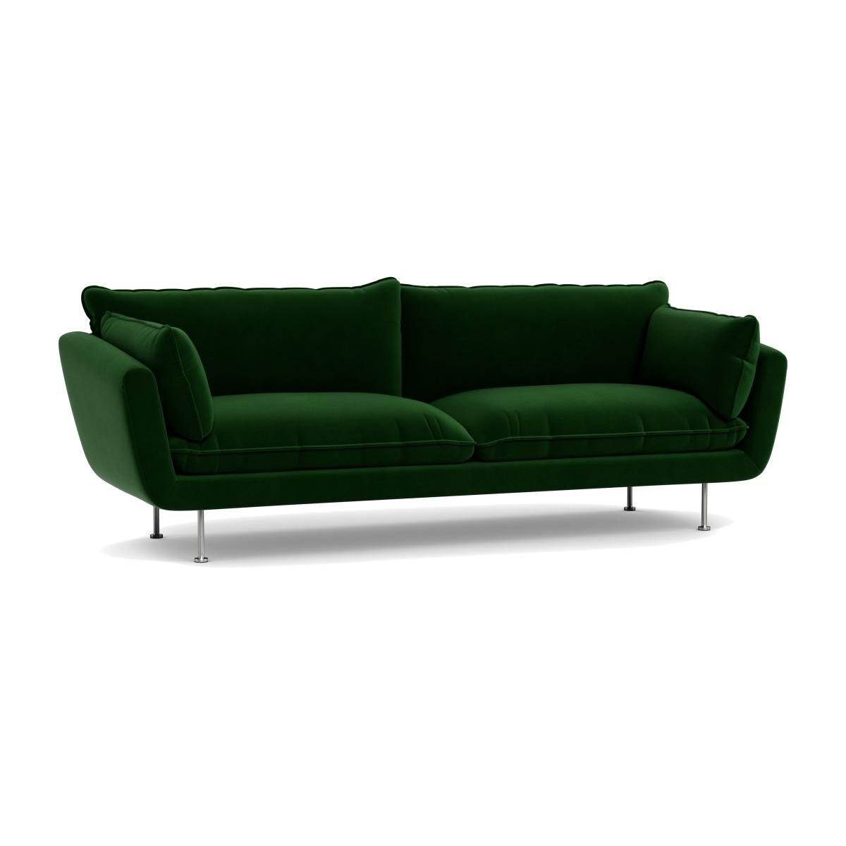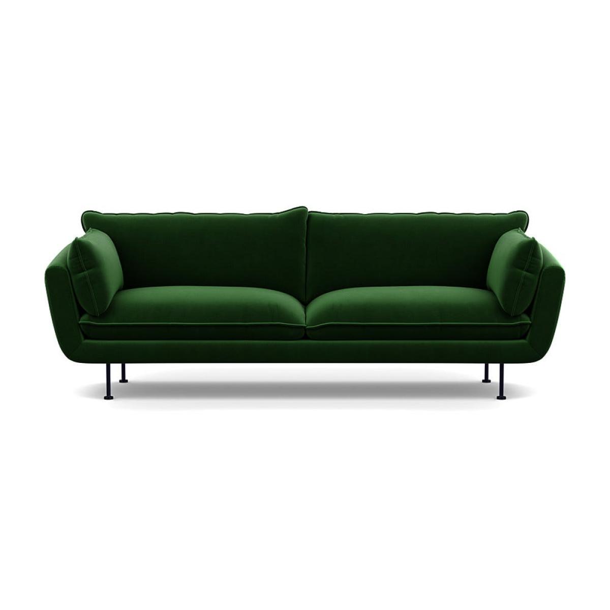 I love this sofa for its bold velvet finish and sleek design, which make it a real statement piece. The dark forest green shade is versatile enough to complement both contemporary and classic interiors, adding a touch of sophistication and colour depth. Its 'smart' velvet offers a luxurious feel, while the black feet provide a modern contrast. Practical styling tips involve pairing it with neutral tones or metallic accents to balance its richness, and adding textured cushions or throws can create an inviting, layered look. This sofa works well in open-plan living spaces or even as a chic feature in a cosy corner, making it a versatile choice for various interior styles.
