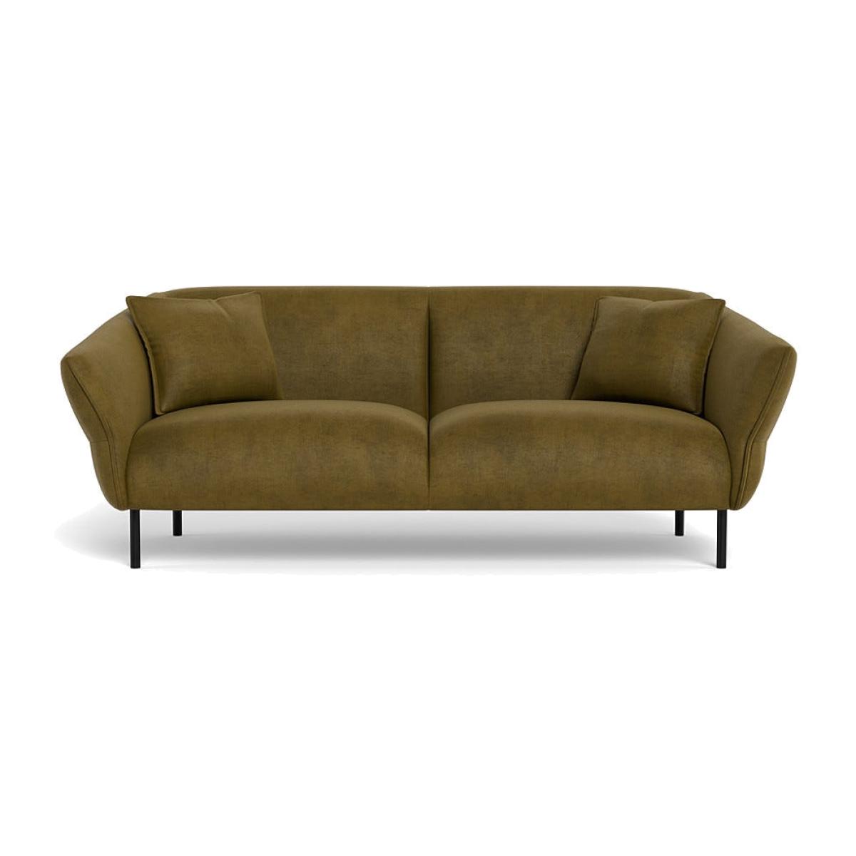 I’m a fan of the Alto three-seater in peridot because its slim black legs and softly curved arms give it a light, contemporary feel despite the rich velvet upholstery. It sits beautifully in living rooms with mid-century accents or modern Scandi schemes, especially when paired with warm wood tones, rattan elements and plenty of greenery. For styling, add a couple of moulded cushions in contrasting neutrals (think dove grey or chalk white) and layer a tactile wool or boucle throw across one arm. Anchor the setup with a low-pile rug in a muted geometric pattern, and position a slim-lined coffee table in brass or black metal to echo the leg finish.