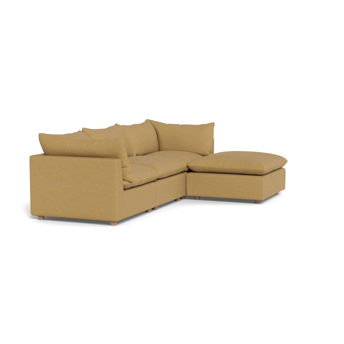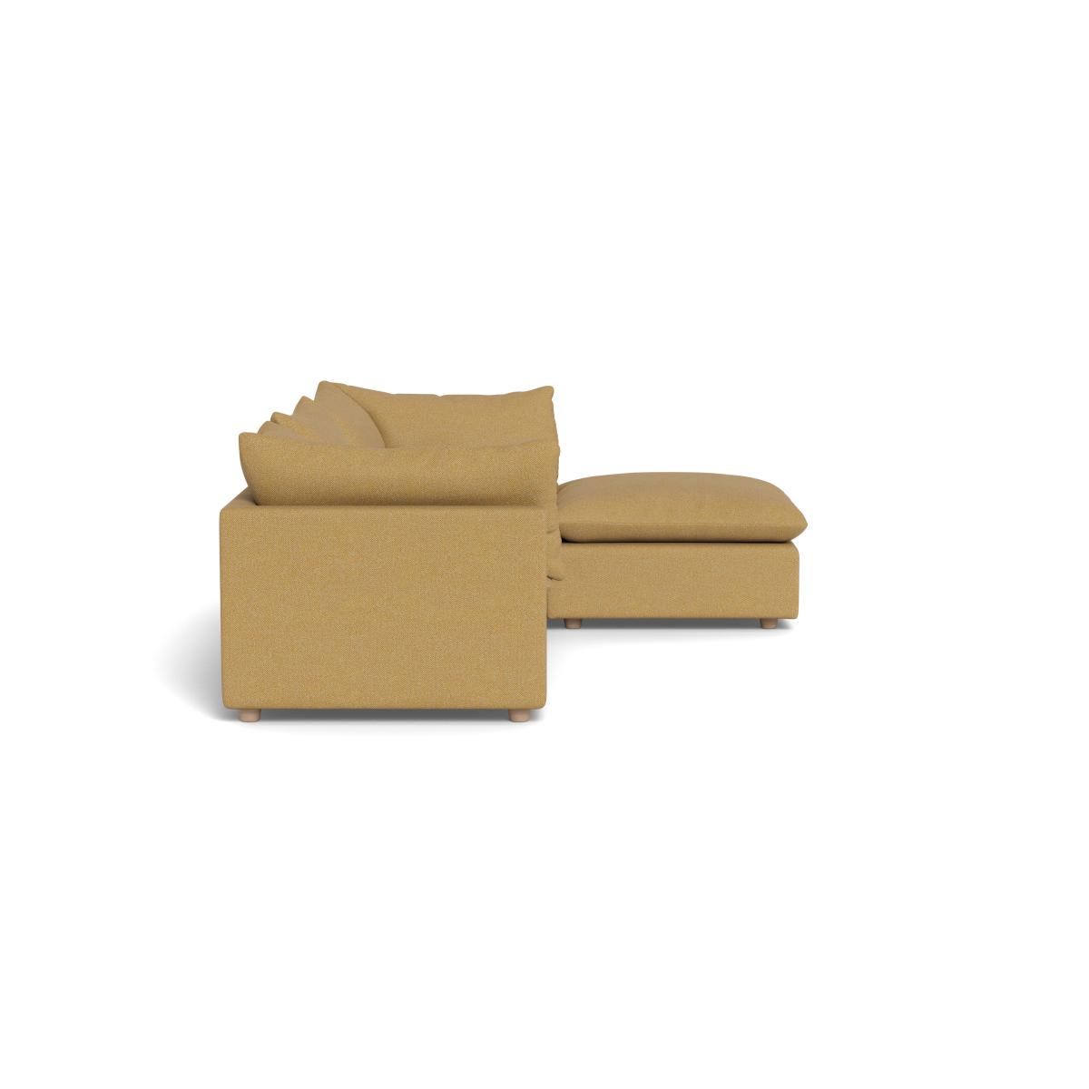 I love this corner sofa for its versatile design and comfortable profile, making it a practical choice for both relaxed living spaces and more formal interiors. Its boucle tweed fabric in Citrine adds a warm, textured touch that pairs well with a variety of colour schemes, from neutral tones to richer accents. The walnut-stained beech feet add a subtle touch of sophistication while grounding the piece. It works particularly well in contemporary or Scandinavian interiors, but can also complement eclectic schemes with its inviting texture. For styling tips, consider layering with plush cushions and throws in contrasting textures and colours to enhance its cosy appeal. Positioning it in a corner with a low coffee table and some layered lighting will maximise its inviting nature while maintaining a balanced, stylish look.