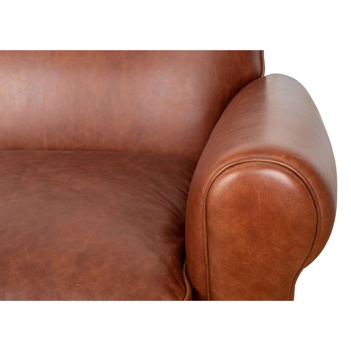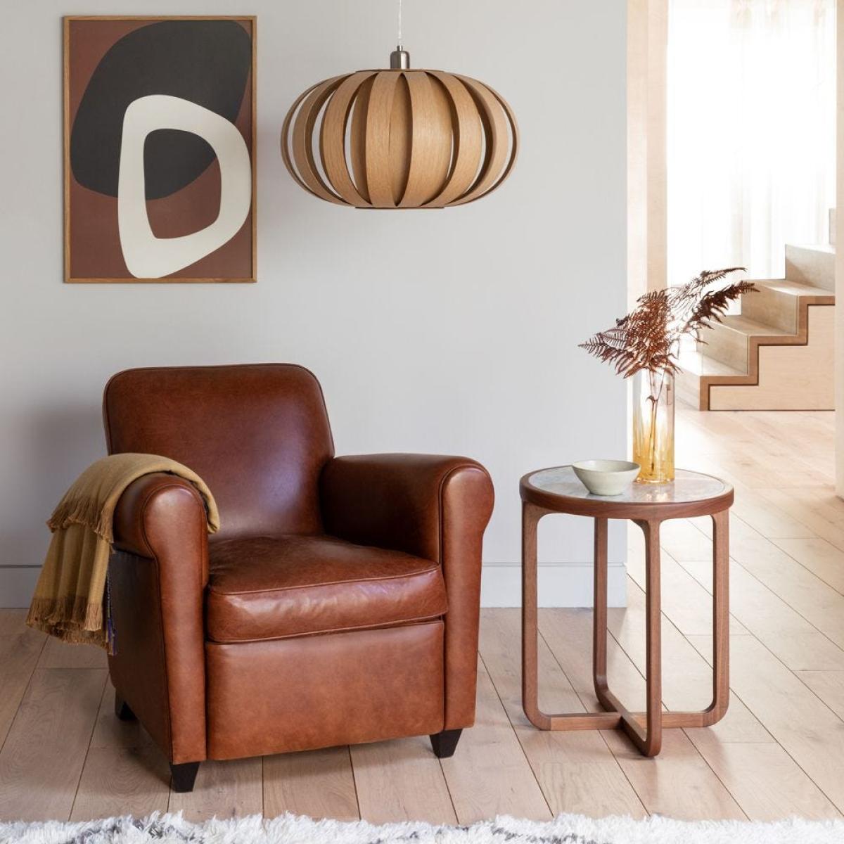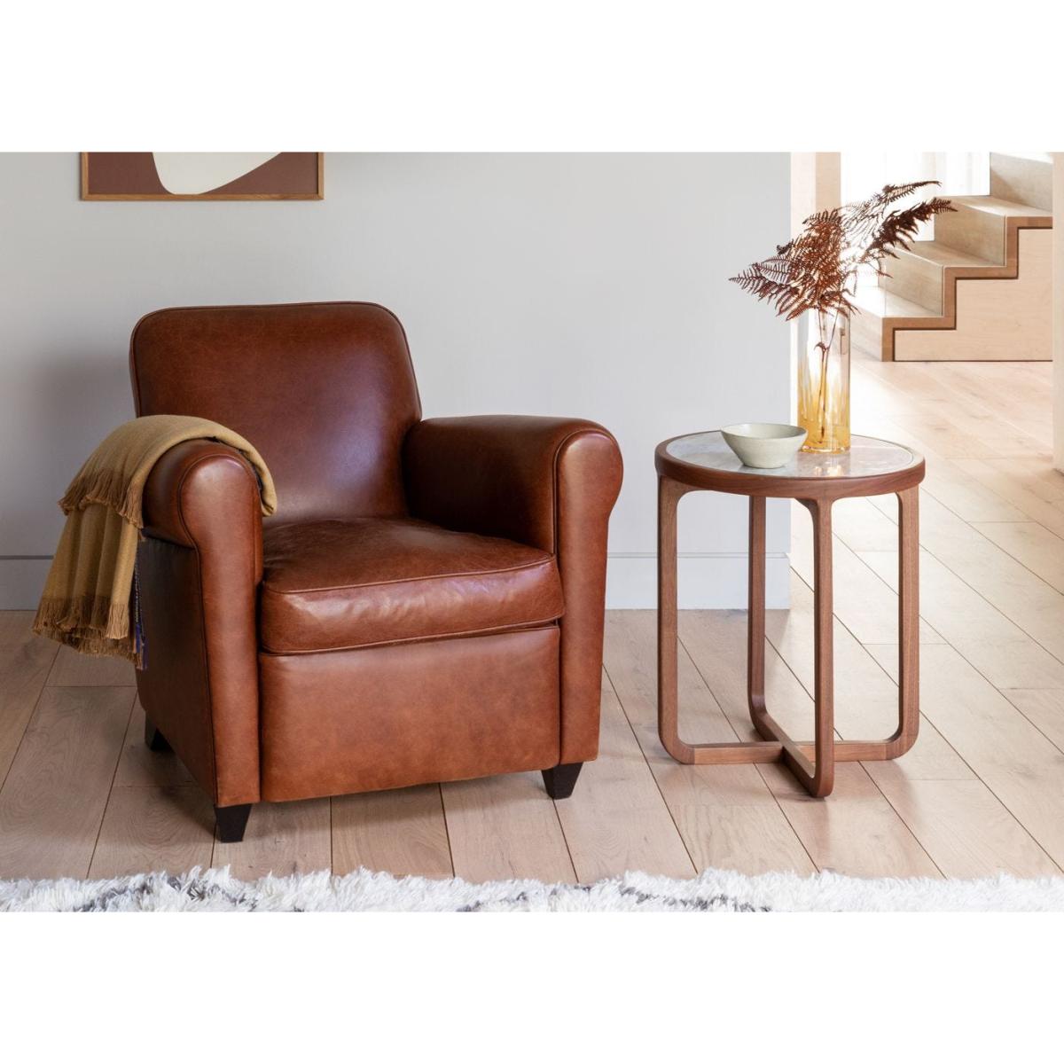 I love this armchair for its classic yet versatile appeal, thanks to the warm tan leather which ages beautifully over time, adding character. It works particularly well in both traditional and contemporary interiors, providing a touch of luxury and comfort without feeling overly formal. Practical styling tips include pairing it with textured cushions and a neutral rug to anchor a cosy corner, or contrasting it with more modern, sleek furniture for an eclectic look. Its substantial build and timeless aesthetic make it an excellent investment for creating inviting living spaces that are both stylish and practical.