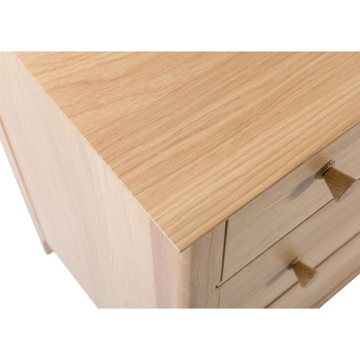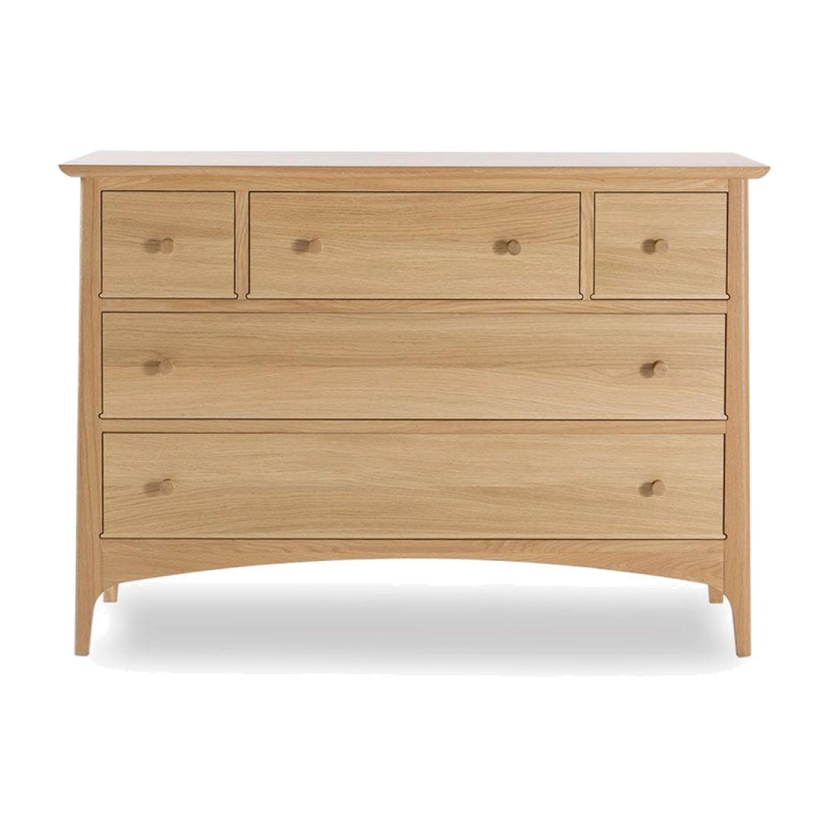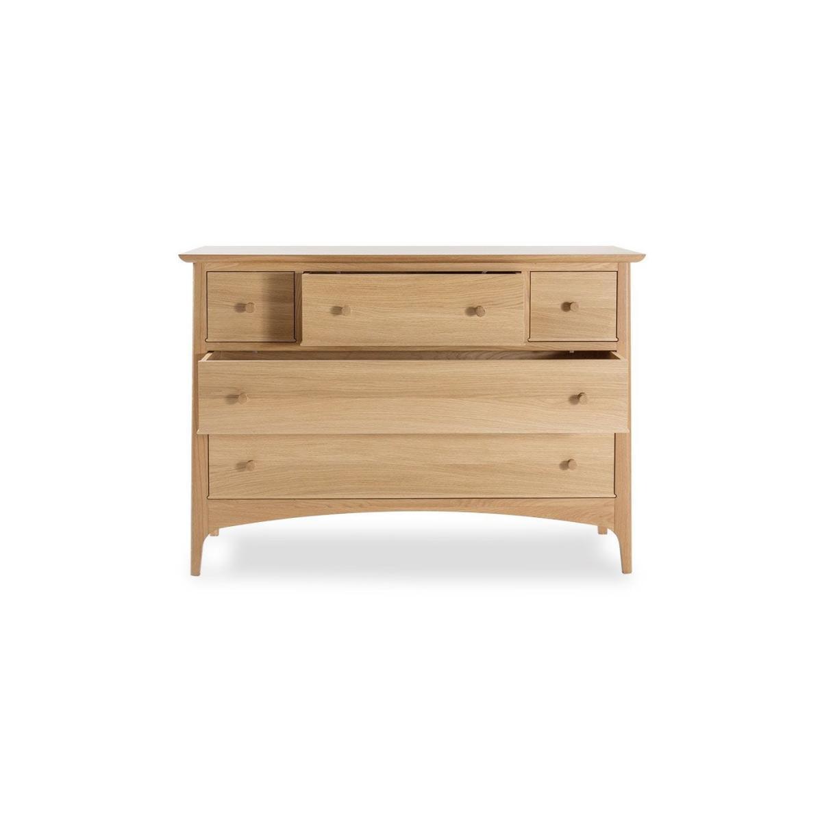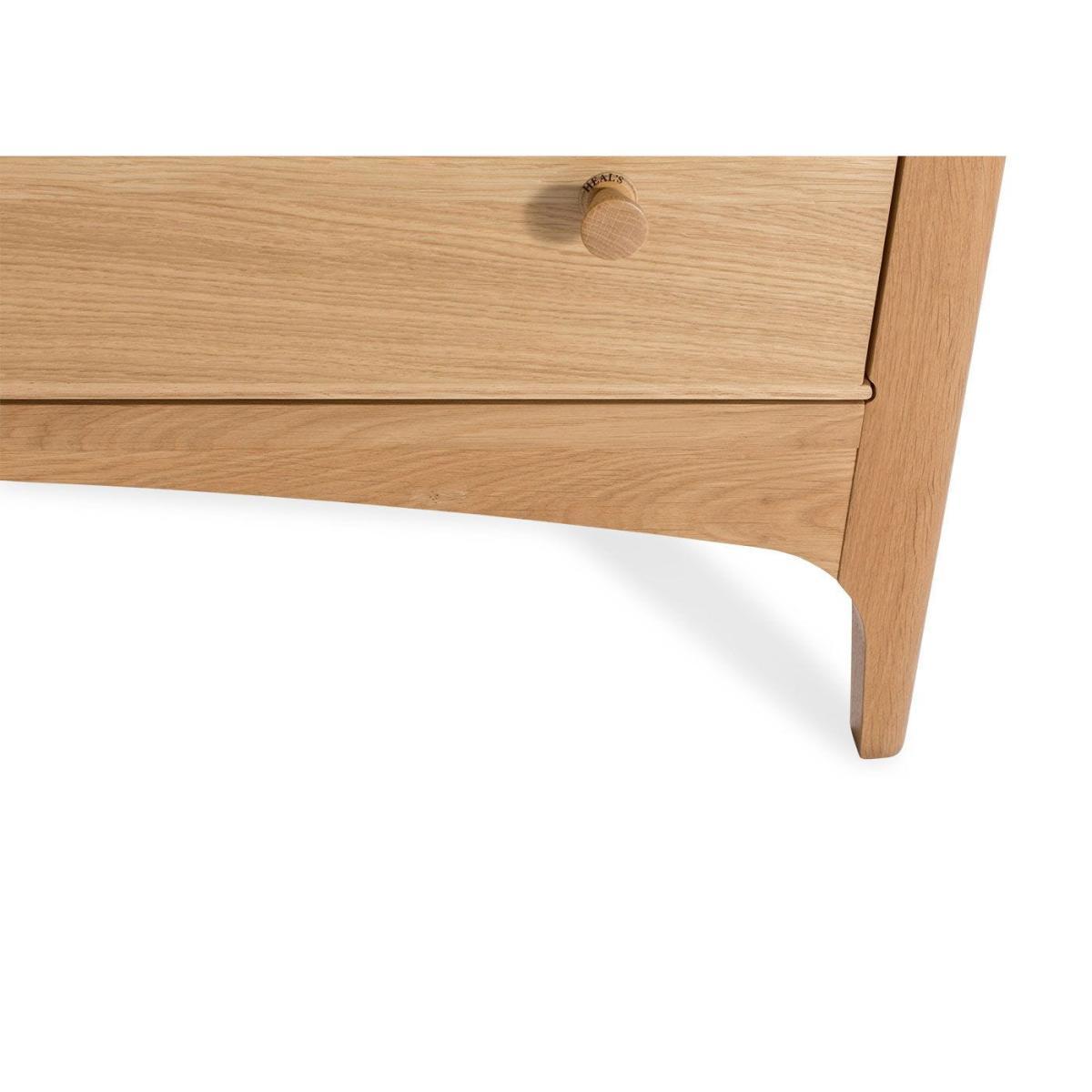 Heal's made its name as a furniture maker through the Arts and Crafts movement of the late 19th century and the Blythe range has been designed to capture that same ethos of functional, quaker inspired furniture. Designed and developed in-house, the Blythe 5 Drawer Chest is made from solid oak and oak veneer that has been finished in a clear matt lacquer to protect the wood while also providing a smooth finish. This spacious storage chest features five drawers of varying size each of which is complete with traditional wooden drawer runners. Inspired by Heal’s heritage, subtle design details such as the lipped top, arched silhouette and Heal’s wooden cuff on each of the handles demonstrate the craftsmanship at the heart of the range.