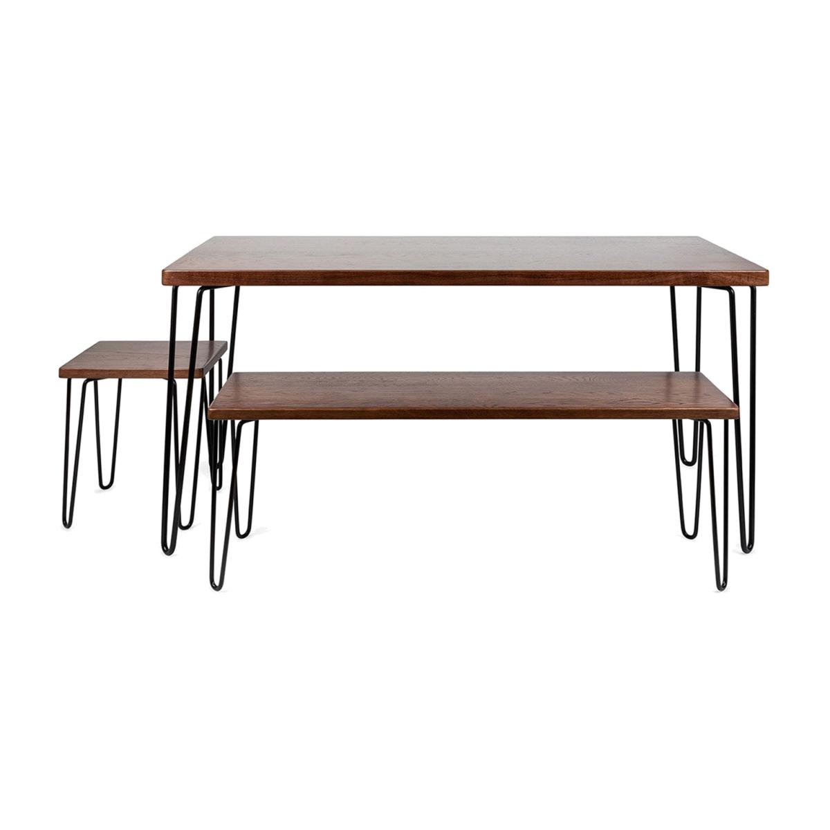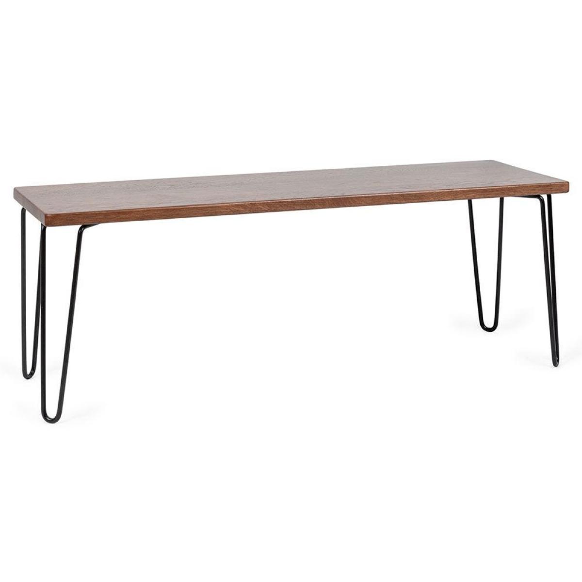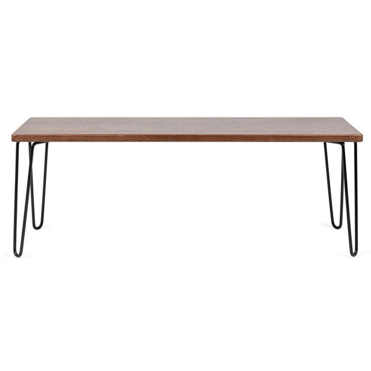 I love the Brunel bench for the way its dark-stained top and slender black hairpin legs strike a balance between warmth and minimalism. Its compact form lifts a room rather than weighing it down, making it an ideal choice for contemporary kitchens, industrial lofts or pared-back Scandi dining areas. For styling, slip a woven runner down the middle when using it as a dining table and add linen cushions to the benches for extra comfort. In a hallway or living room you can swap the benches out for low stools or use them as occasional coffee-table seating, then tuck them neatly back under when guests arrive.