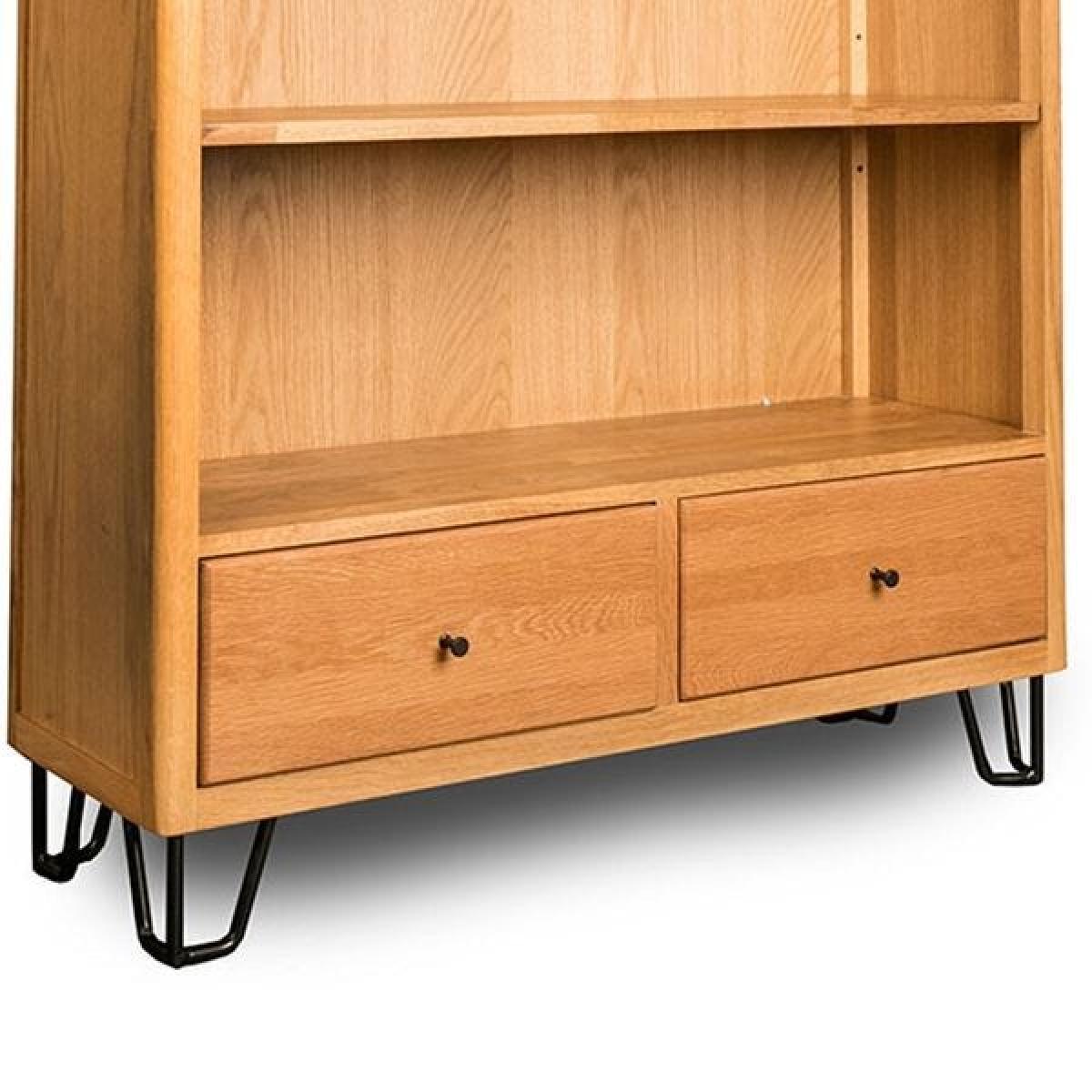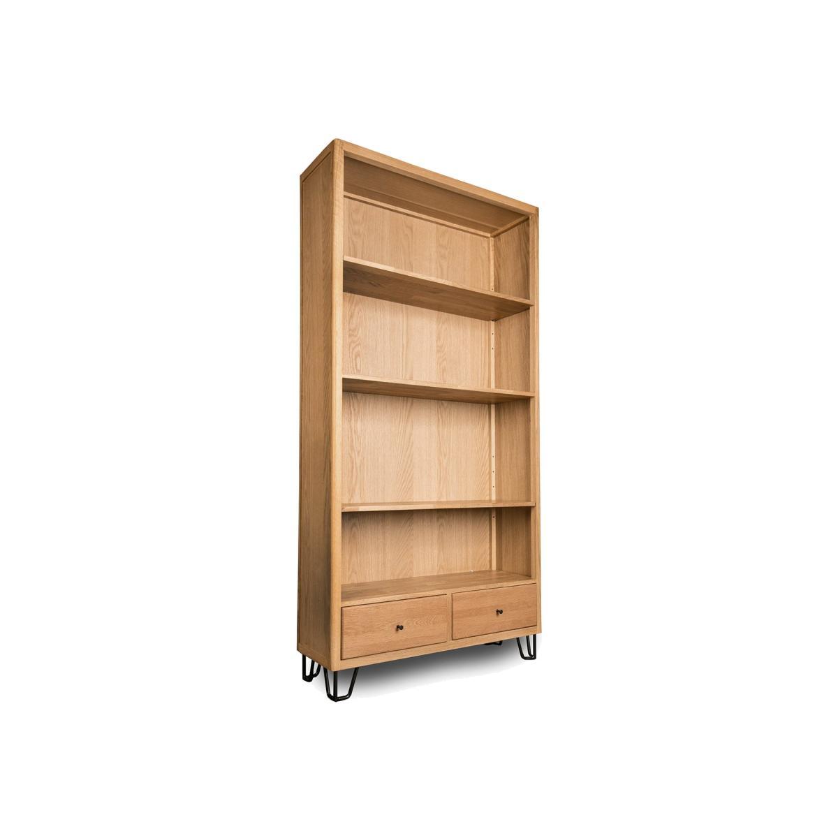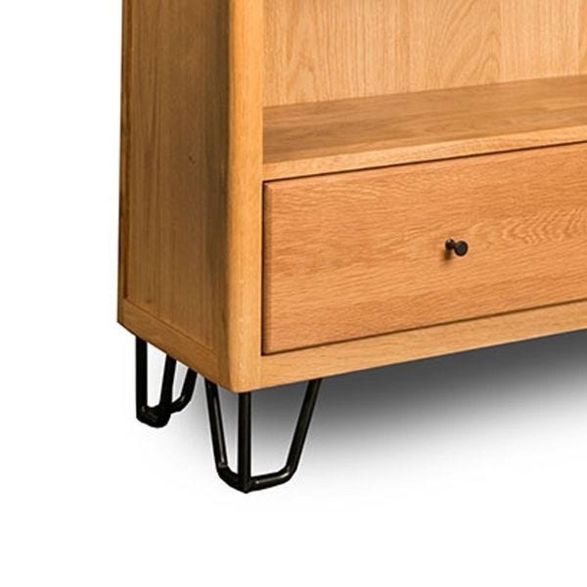 Solidly structured from American oak with a light veneer, this shelving unit features classically styled recessed panelling, while subtle detailing such as hand joinery and softly curved edging is evident throughout. The Mid-century silhouette has been given a functional redesign to incorporate a wide array of storage space with twin chest of drawers on the base topped with a series of adjustable shelving - the middle panel stays in place while the top and bottom shelves allow three separate heights. Powder coated metal feet and matching period style spindle handles provide an industrial feel that blends perfectly with the tubular finish of the Brunel range.