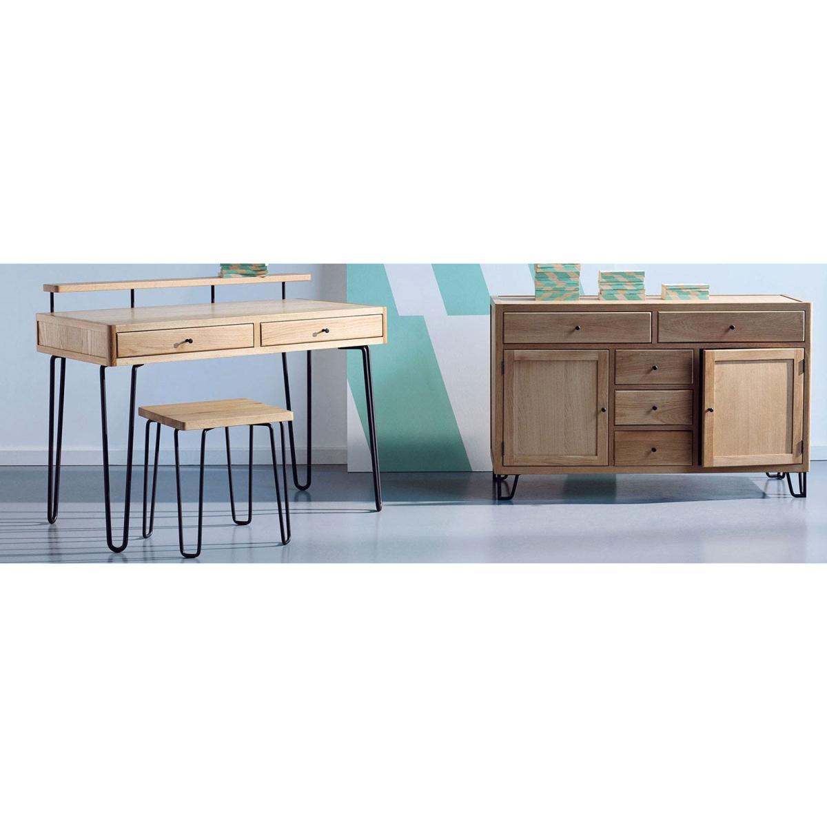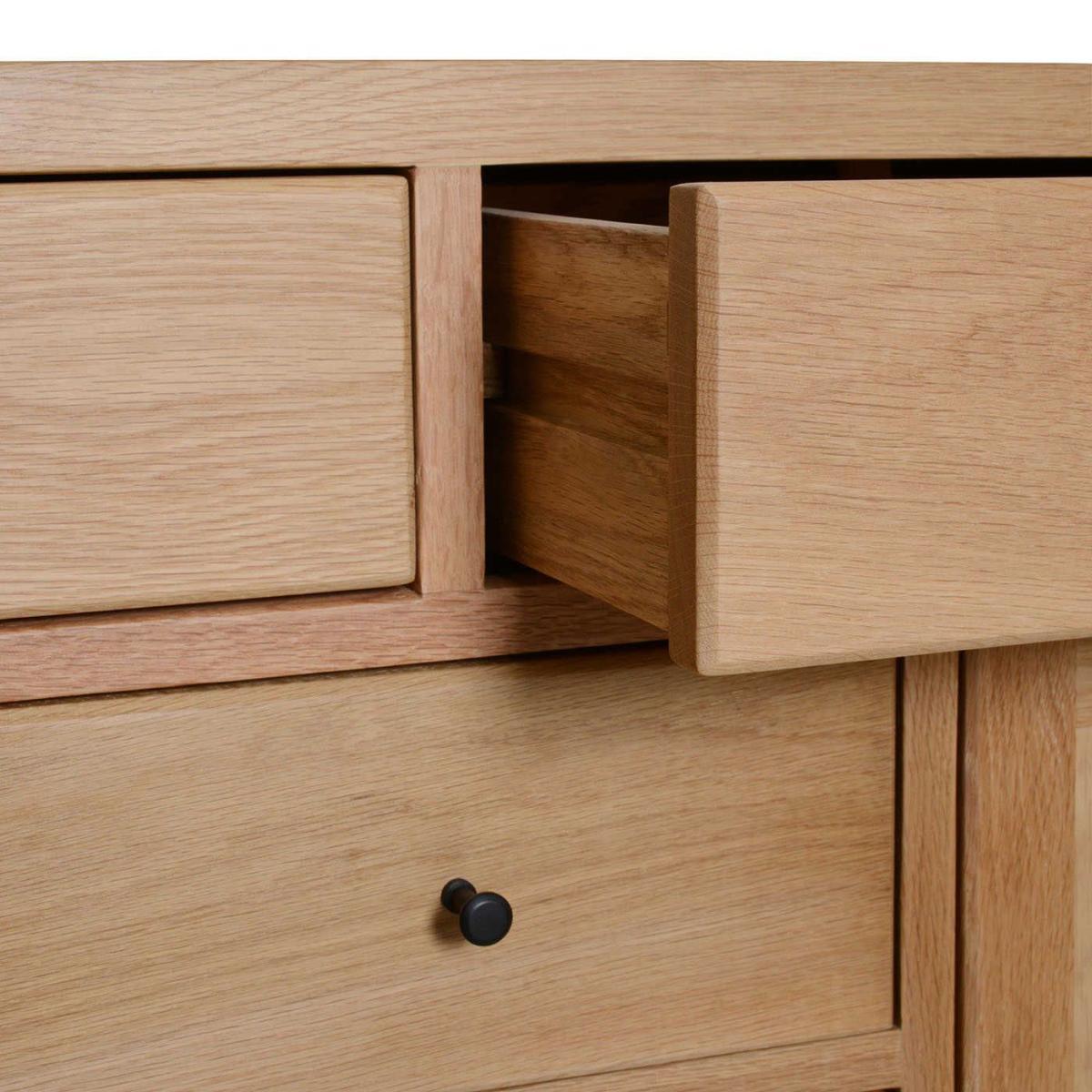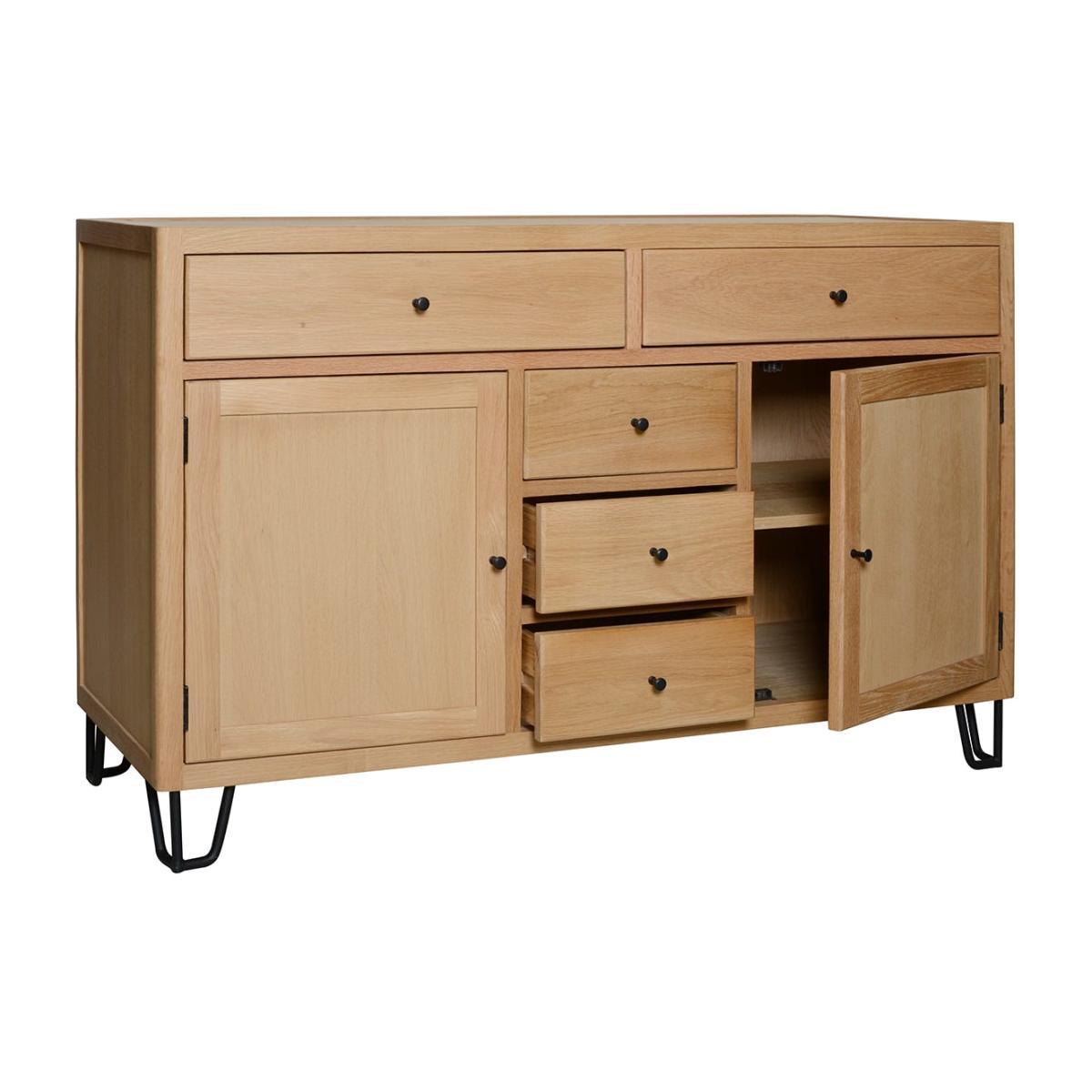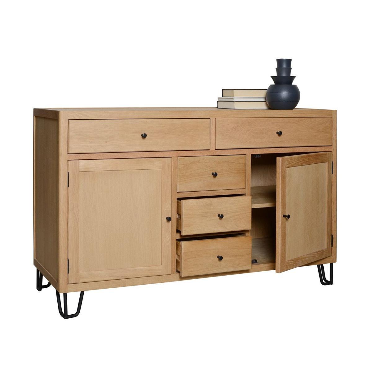 Rob Scarlett’s hugely popular Brunel range sets industrial style against Mid-century Scandinavian design to create pieces made for modern living. Drawing inspiration from original 1950s designs by the likes of Robin Day and Clive Latimer, this classic shaped sideboard gives glamorous period furnishings an edgy makeover that’s suited to chic urban interiors. Solidly structured from American oak with a soft veneer, the iconic 1950s silhouette of this piece is accentuated by classically styled recessed panelling on the sides, top and cupboard faces. Five deep drawers - two wide on top and three half-width in the centre - have been beautifully crafted to provide ample storage room with expert hand joinery and softly curved edging throughout. Paying tribute to the pioneering use of manufactured elements within modernist design, powder coated metal legs and matching period style spindle handles provide an industrial feel that blends perfectly with the tubular finish of the Brunel range.