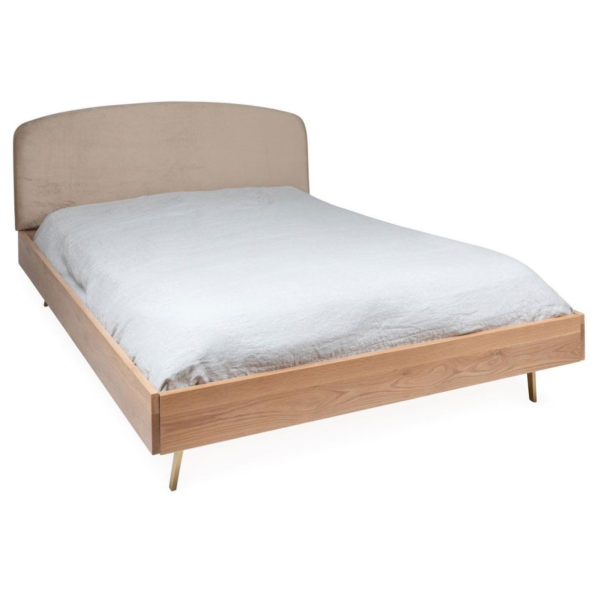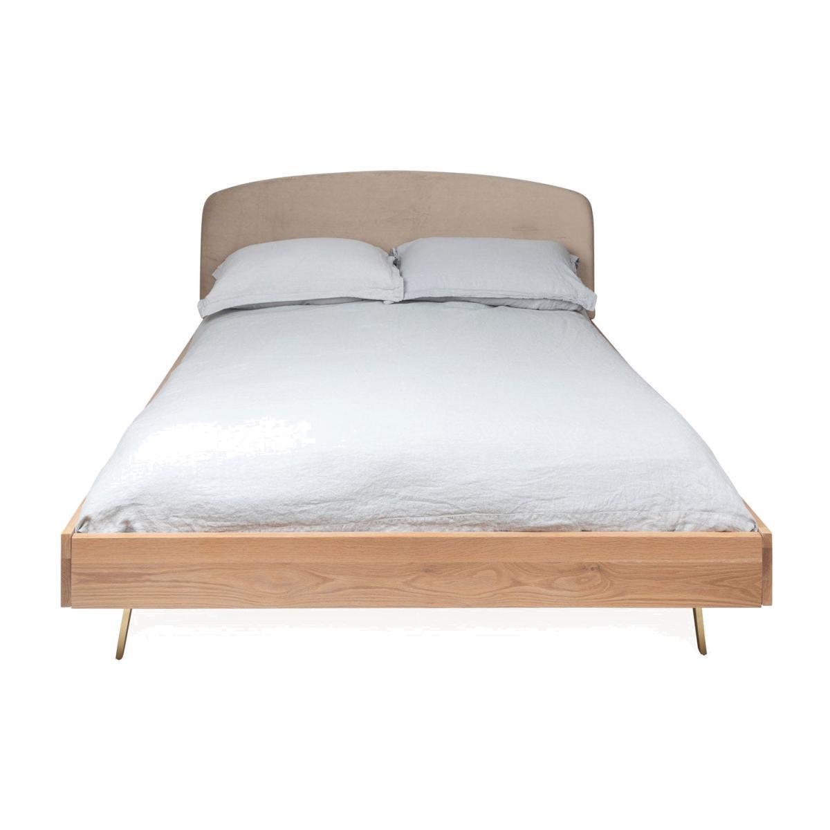 Designed by Rob Scarlett exclusively for Heal’s, the Crawford Bed boasts a curved headboard with soft fawn velvet upholstery that sits against a solid blonde oak base. Powder-coated steel legs complete the bed and lend it an understated feminine flourish.