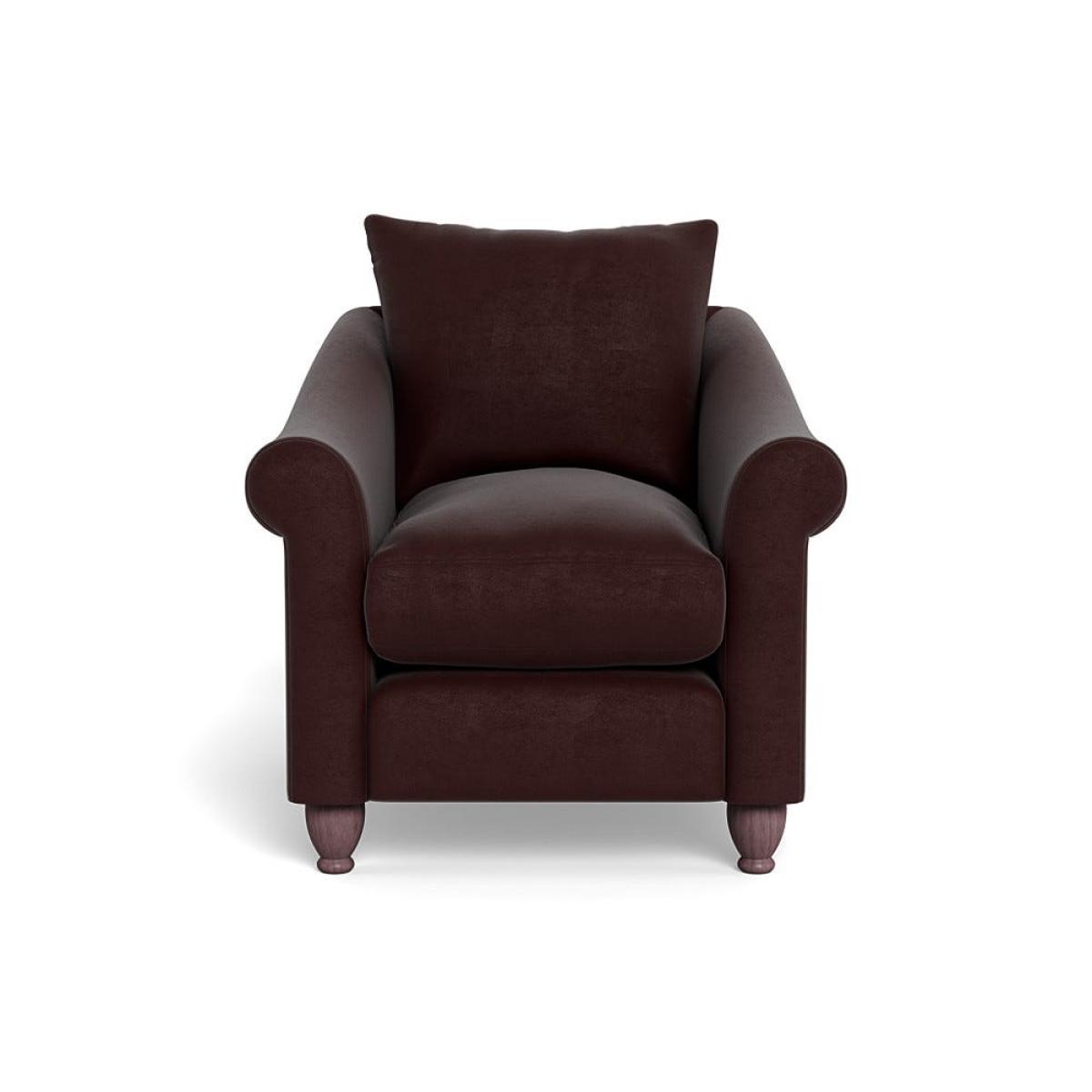I’d call this the Devon velvet armchair, and what I love most is its balance of classic roll-arm lines with a rich acorn velvet that works equally well in both traditional and modern schemes. The warm walnut-stained beech feet tie into wood-flooring or woven jute rugs, while the deep seat makes it perfect for a reading corner or snug living space. Styling tip: layer it with a neutral-toned wool throw and a patterned linen cushion to add depth without overpowering its sleek silhouette. Pair with a slim brass side table or a simple oak console to keep the look light and versatile.
