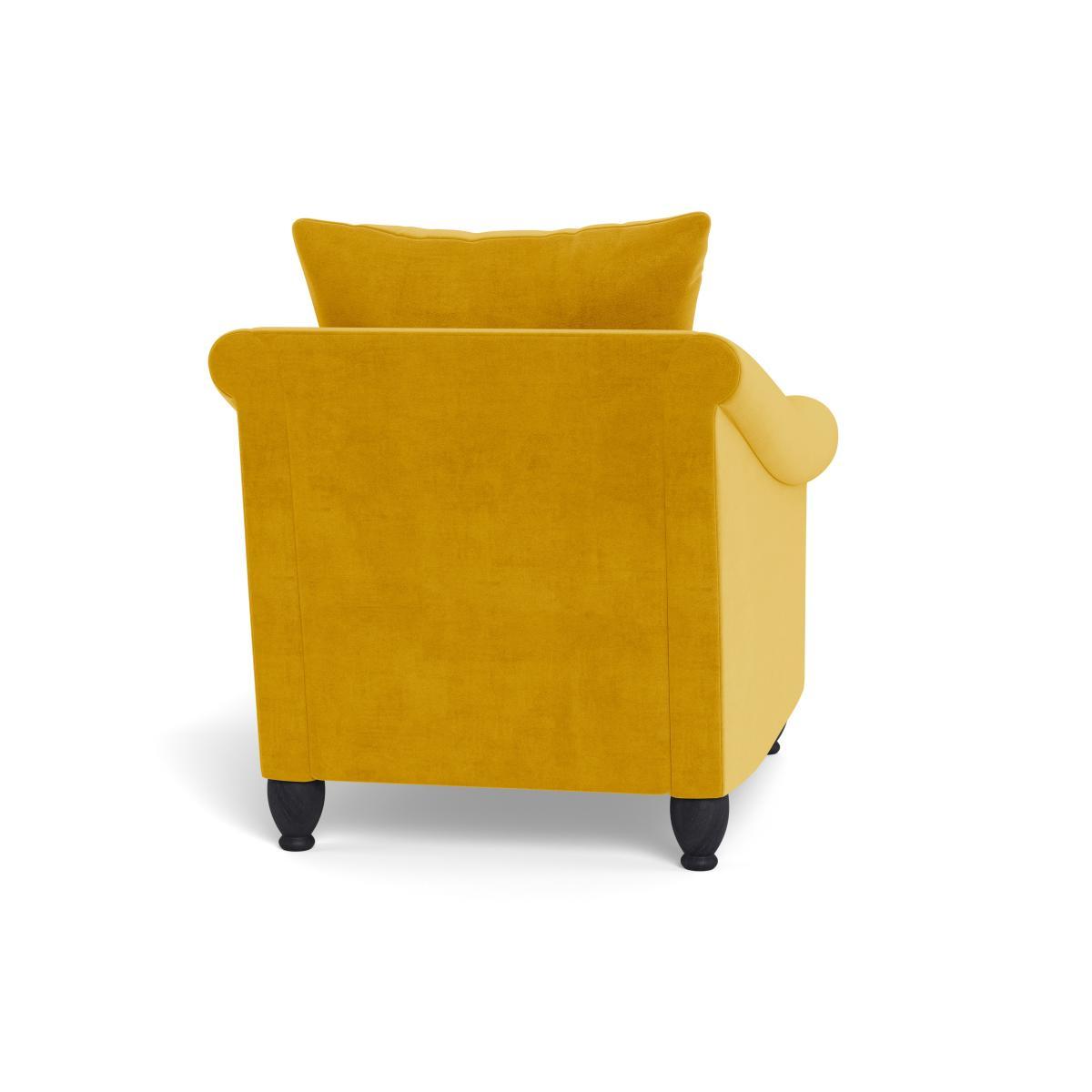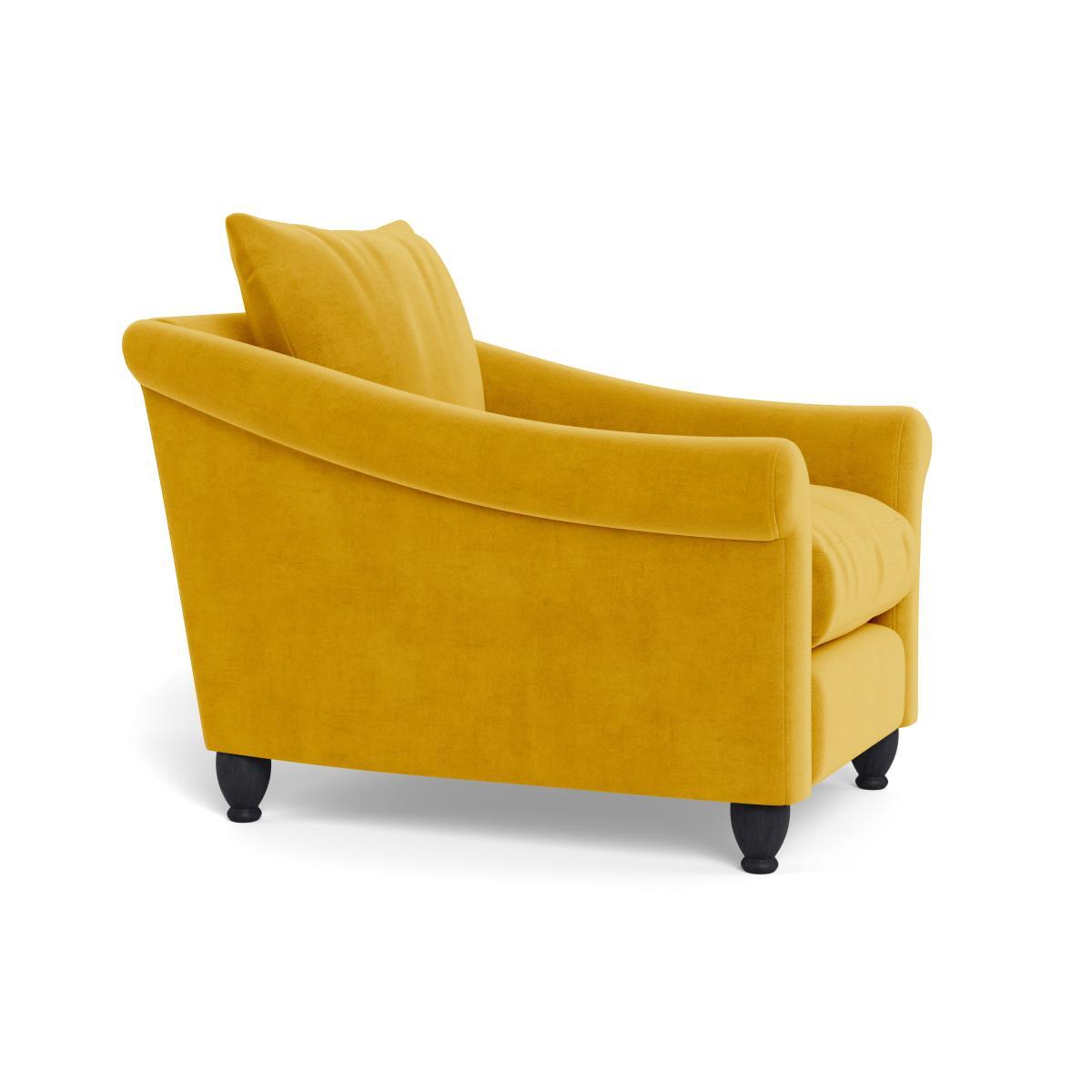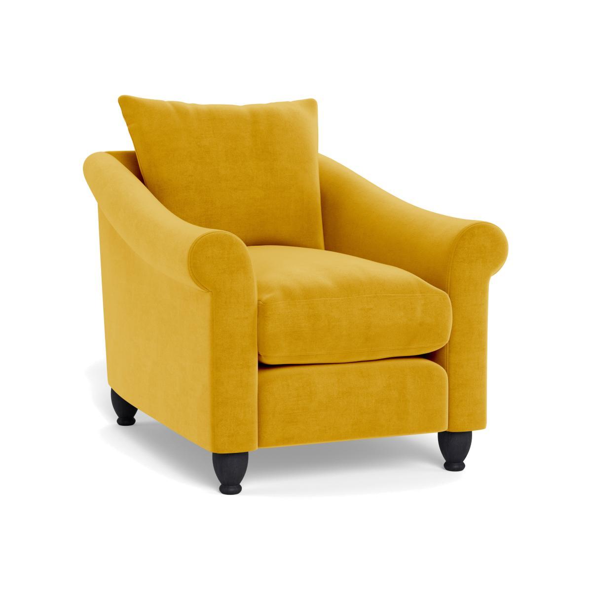 I’d use the Devon armchair in canary velvet as a bright accent in a neutral or tonal living space - its soft curves and black-stained beech feet give it just enough structure to feel modern without looking out of place in a more traditional setting. The velvet finish adds a subtle shine that catches natural light, so it works equally well in a cosy reading nook or paired with a sleek metal-framed coffee table. For styling, balance the bold yellow with soft greys or deep navies on throws and cushions, and place it against a pale wall to let the colour pop. Add a simple side lamp and a low-pile rug in muted tones to keep the look grounded.