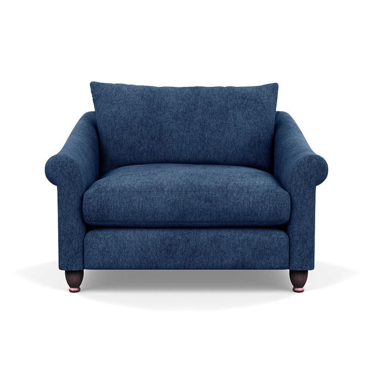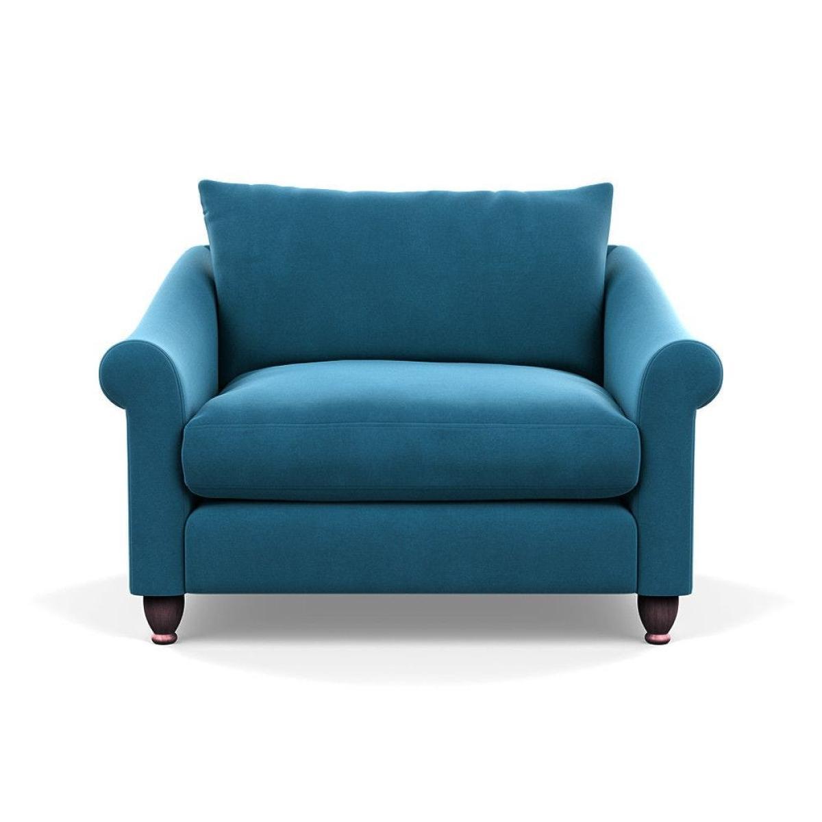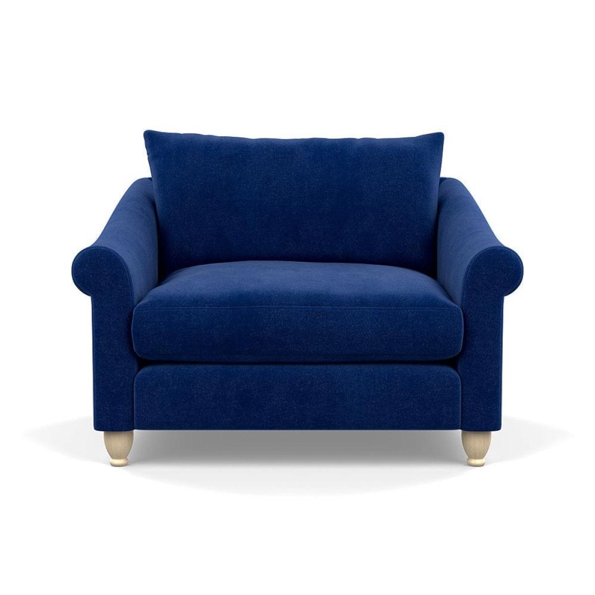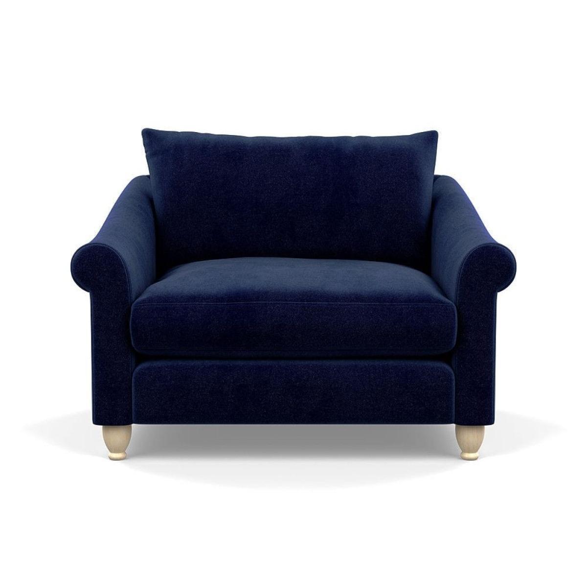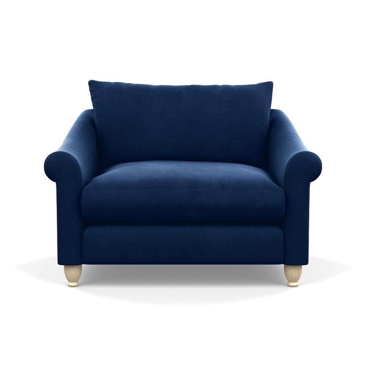 I really like this loveseat for its bold colour and versatile design. The deep Airforce blue velvet adds a luxurious touch, while the dark brown stained beech feet give it a refined finish that anchors it beautifully in both modern and more traditional settings. It works particularly well in eclectic, contemporary, or even mid-century styled interiors, providing a focal point that’s both inviting and sophisticated. For styling, consider pairing it with neutral textiles and contrasting cushions to emphasise its colour, or add warmth with textured throws in earthy tones. It’s a practical piece that balances comfort and style, making it a great addition to living rooms seeking a lively yet elegant statement.