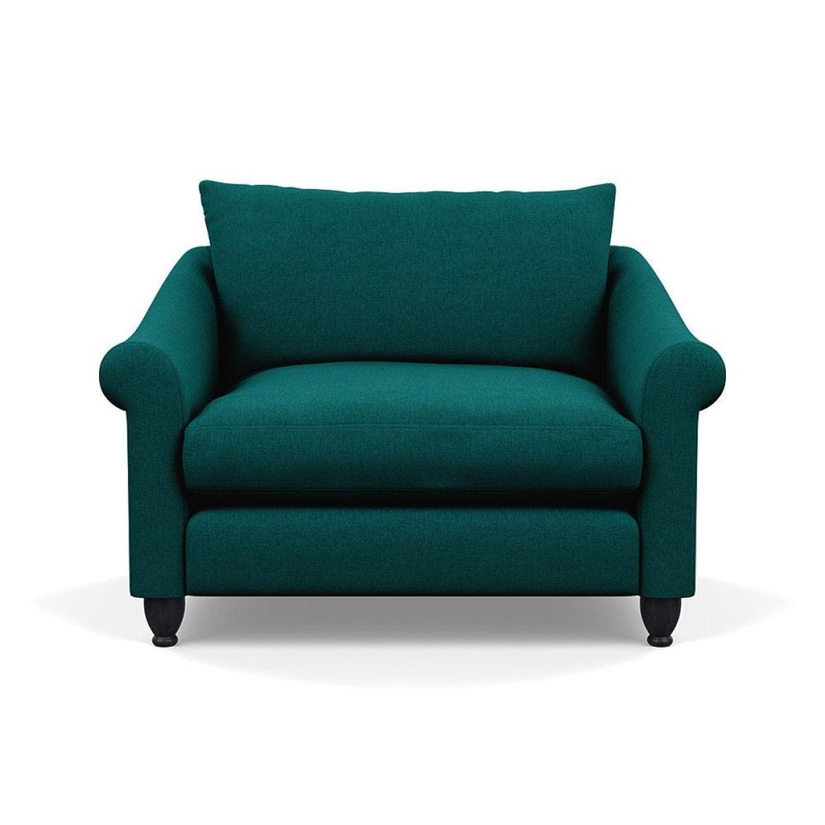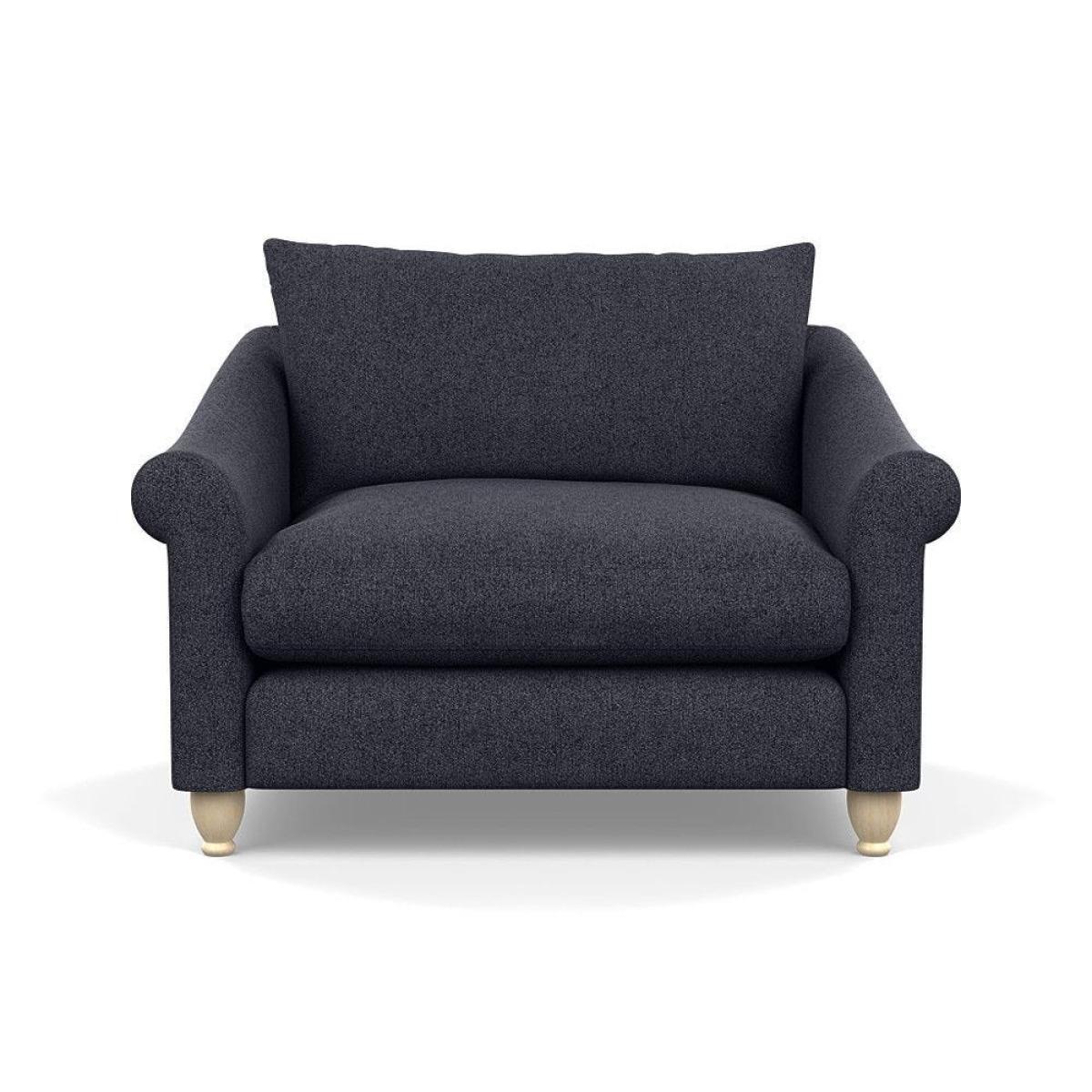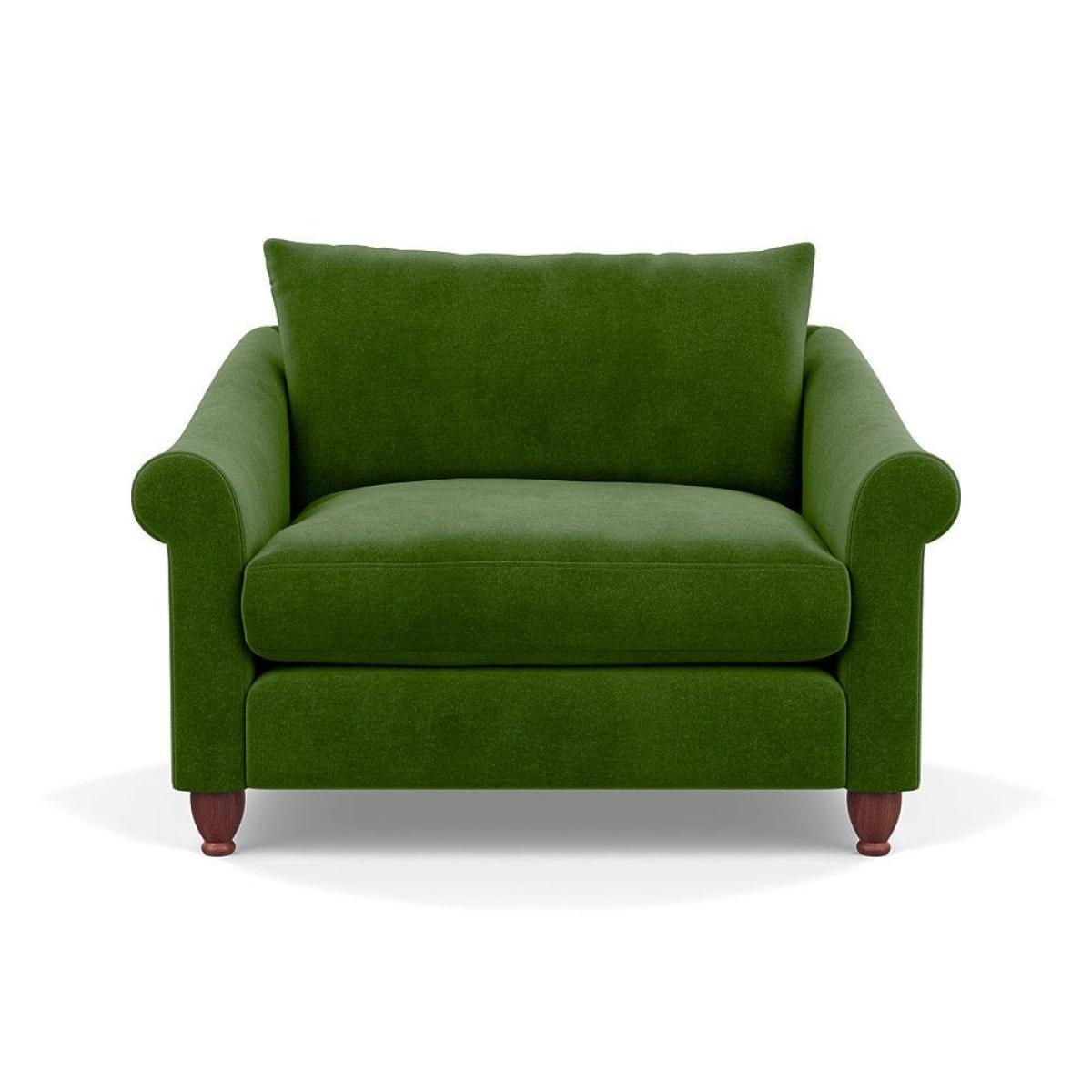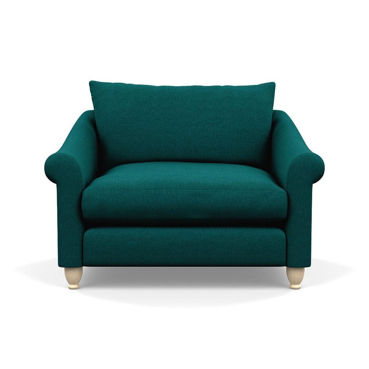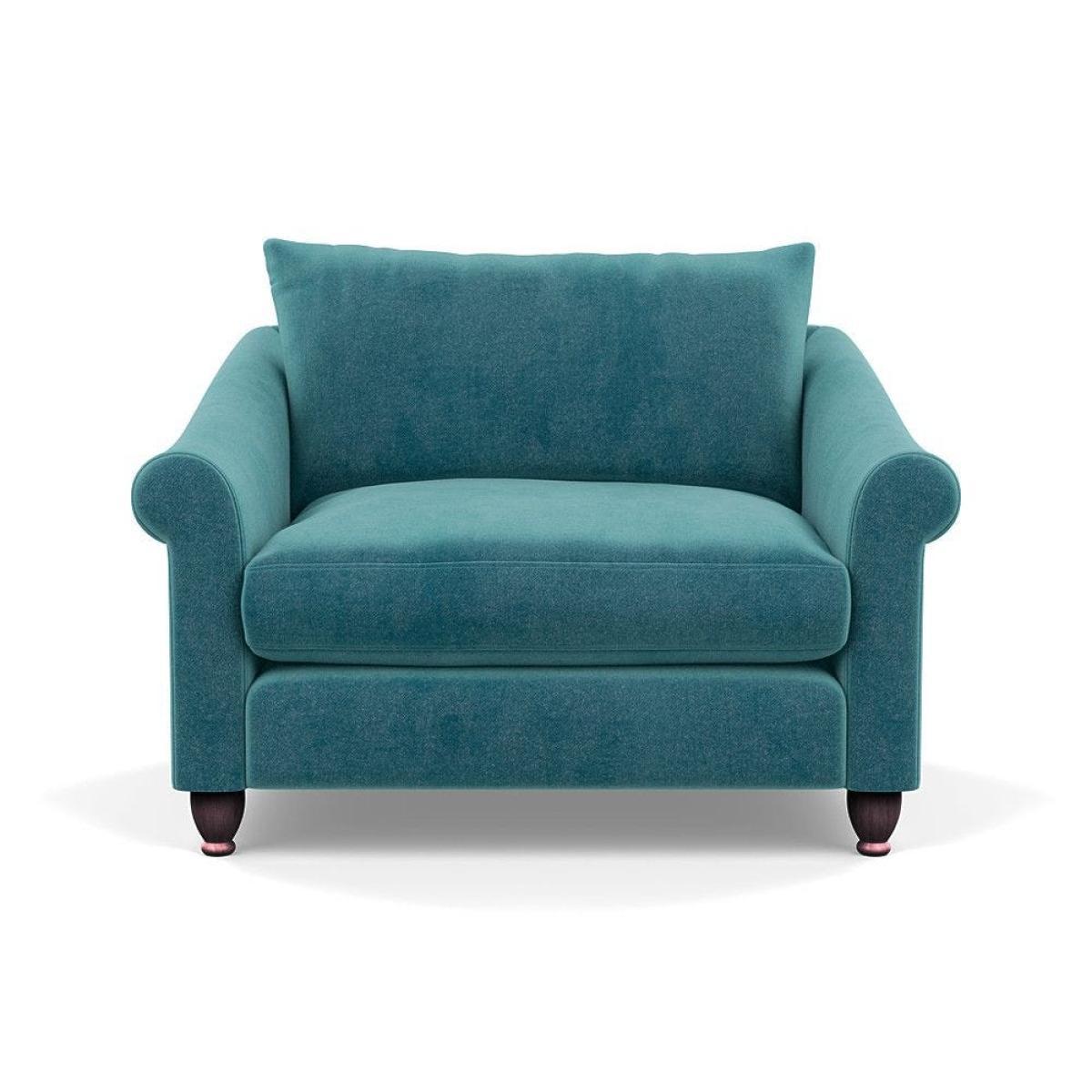 I really like this loveseat for its bold colour and versatile design. The deep Airforce blue velvet adds a luxurious touch, while the dark brown stained beech feet give it a refined finish that anchors it beautifully in both modern and more traditional settings. It works particularly well in eclectic, contemporary, or even mid-century styled interiors, providing a focal point that’s both inviting and sophisticated. For styling, consider pairing it with neutral textiles and contrasting cushions to emphasise its colour, or add warmth with textured throws in earthy tones. It’s a practical piece that balances comfort and style, making it a great addition to living rooms seeking a lively yet elegant statement.