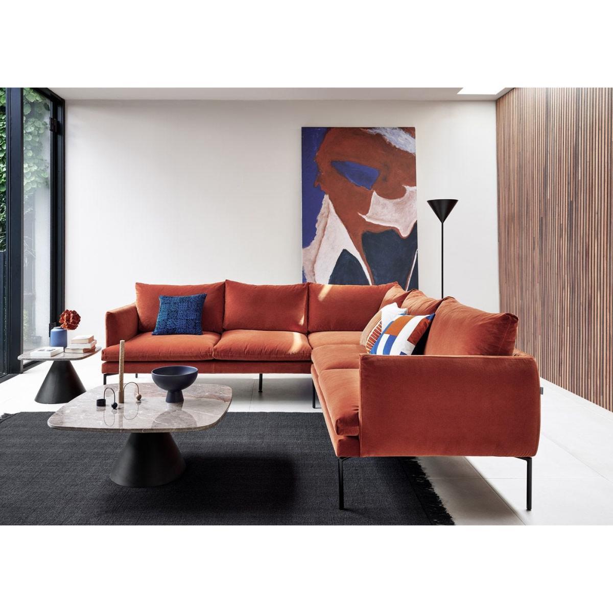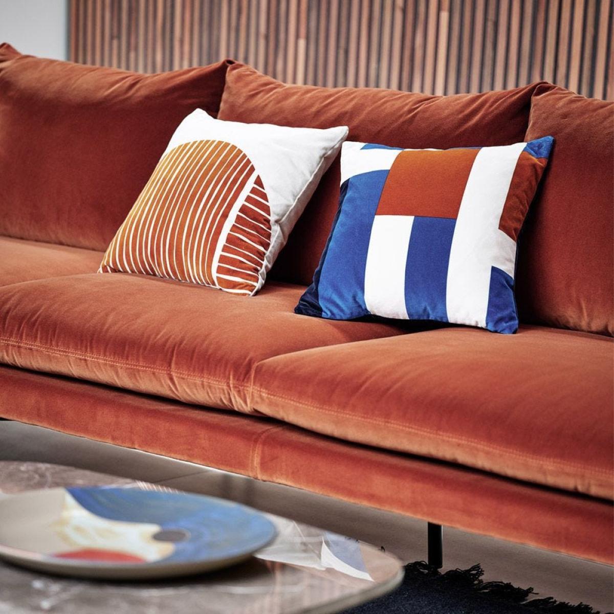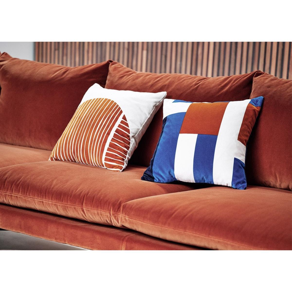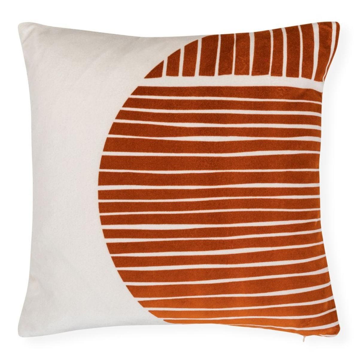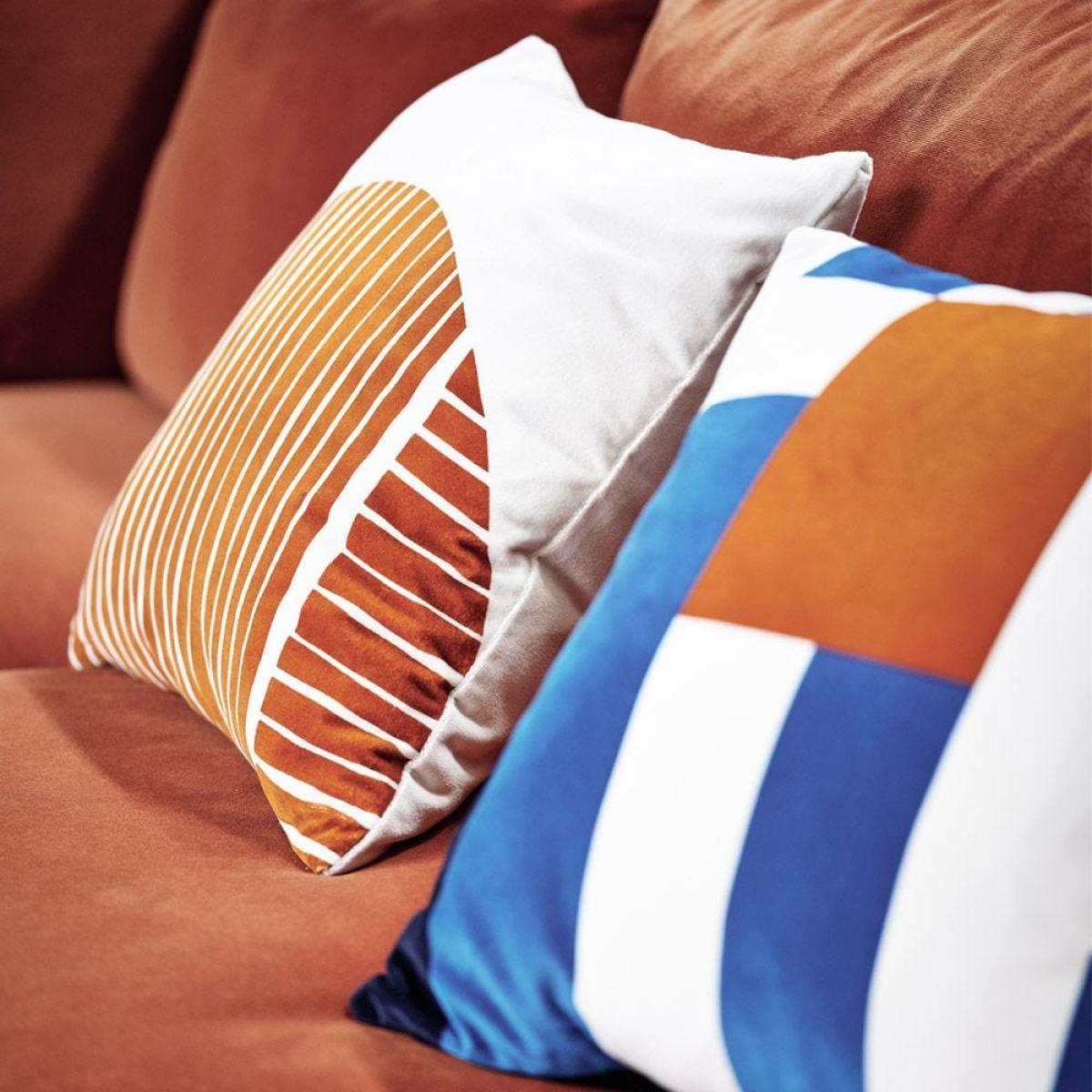 London-based design studio One Nine Eight Five designed this Ebba Cushion exclusively for Heal’s. Its design explores the ever-changing shadows that emerge on the exterior walls of mid-century architecture and came to life through a series of collages working with the negative space and block colour. The cushion itself is crafted in Britain using printed cotton velvet and completed with a plain cream cotton velvet back. All our cushions come with a sumptuous feather pad for a luxurious yet firm feel.