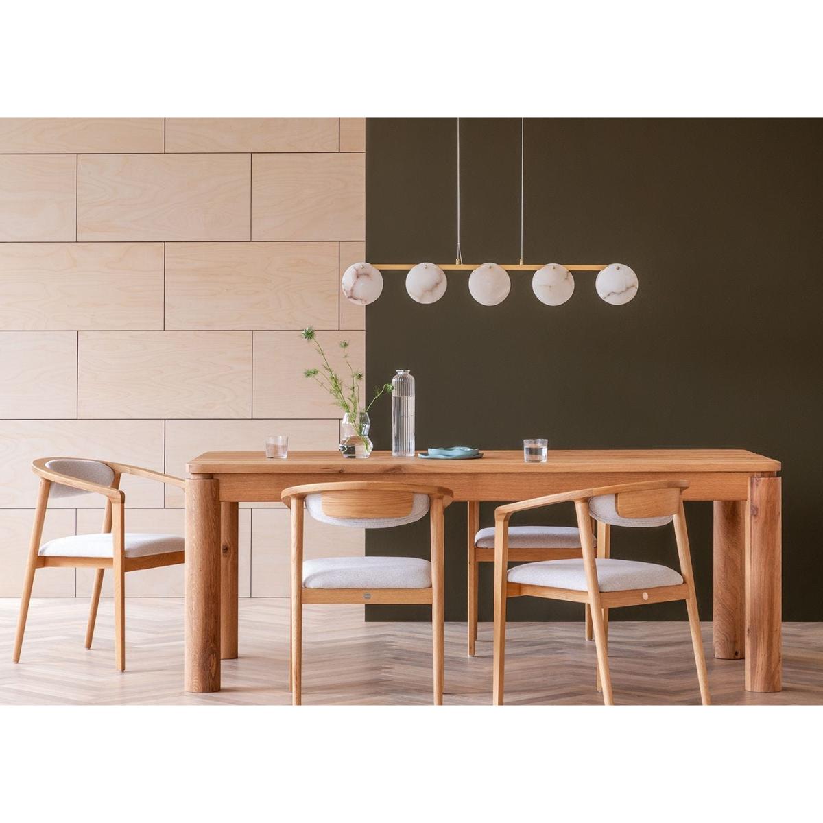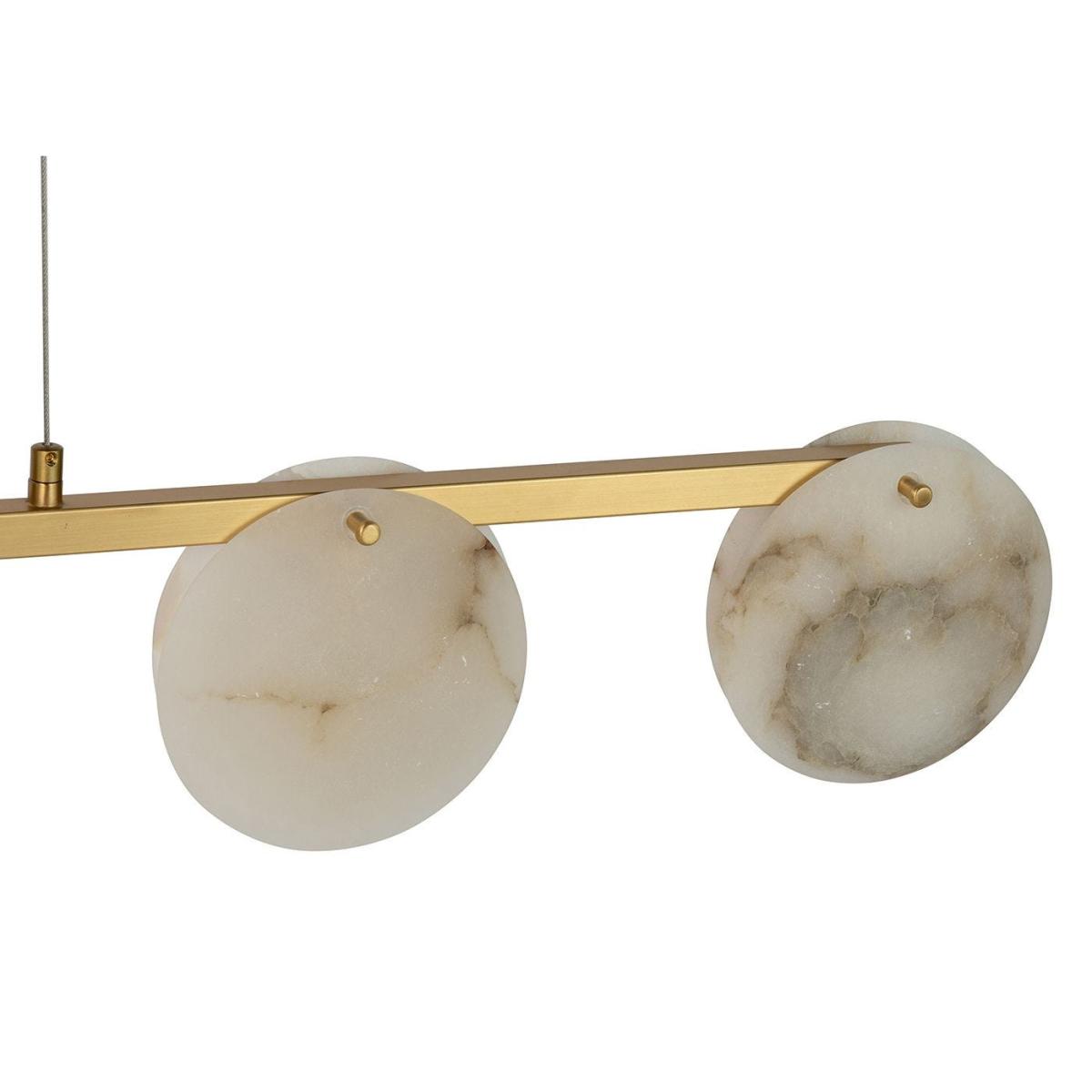 Illuminate your dining room with the exquisite Ebro Alabaster Long 5 Light Pendant. Crafted with natural alabaster discs that showcase unique veining patterns, this pendant emits a soft, ambient glow reminiscent of natural light. The satin brass frame adds a touch of elegance and complements the alabaster beautifully, making it a stunning addition to modern and traditional interiors alike. Perfect for dining areas or living rooms, this pendant creates a serene ambiance while serving as a striking focal point for your kitchen island or dining table.