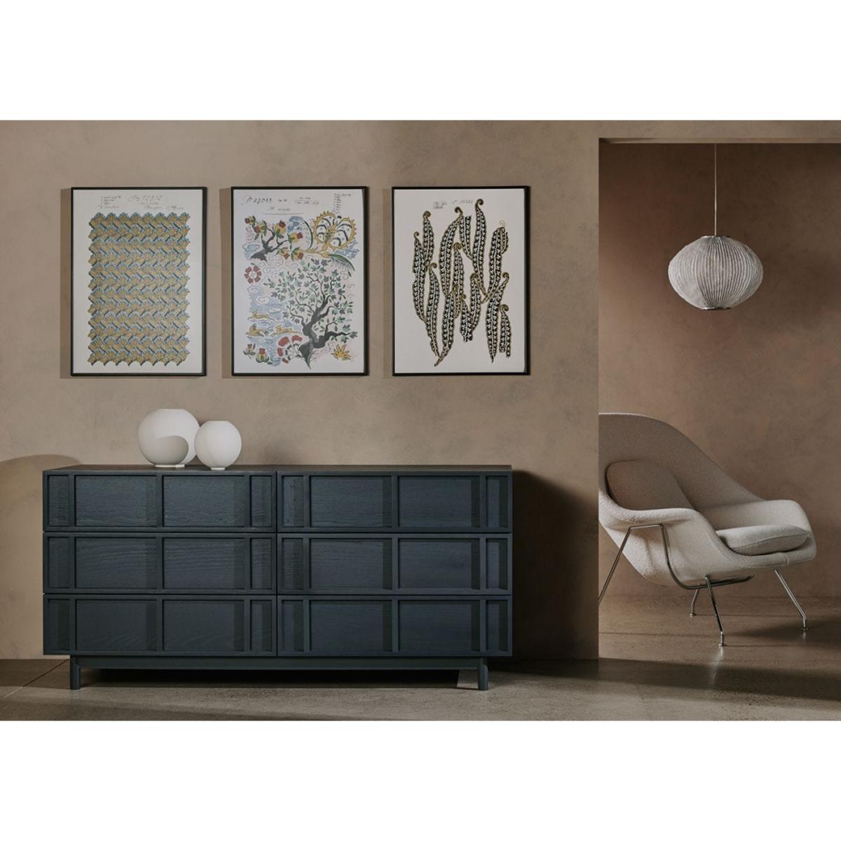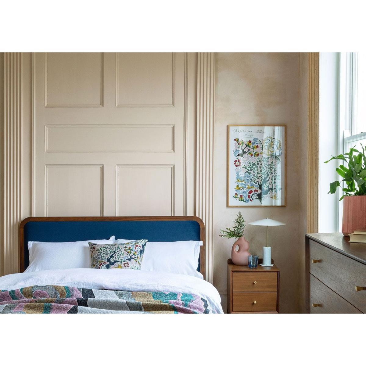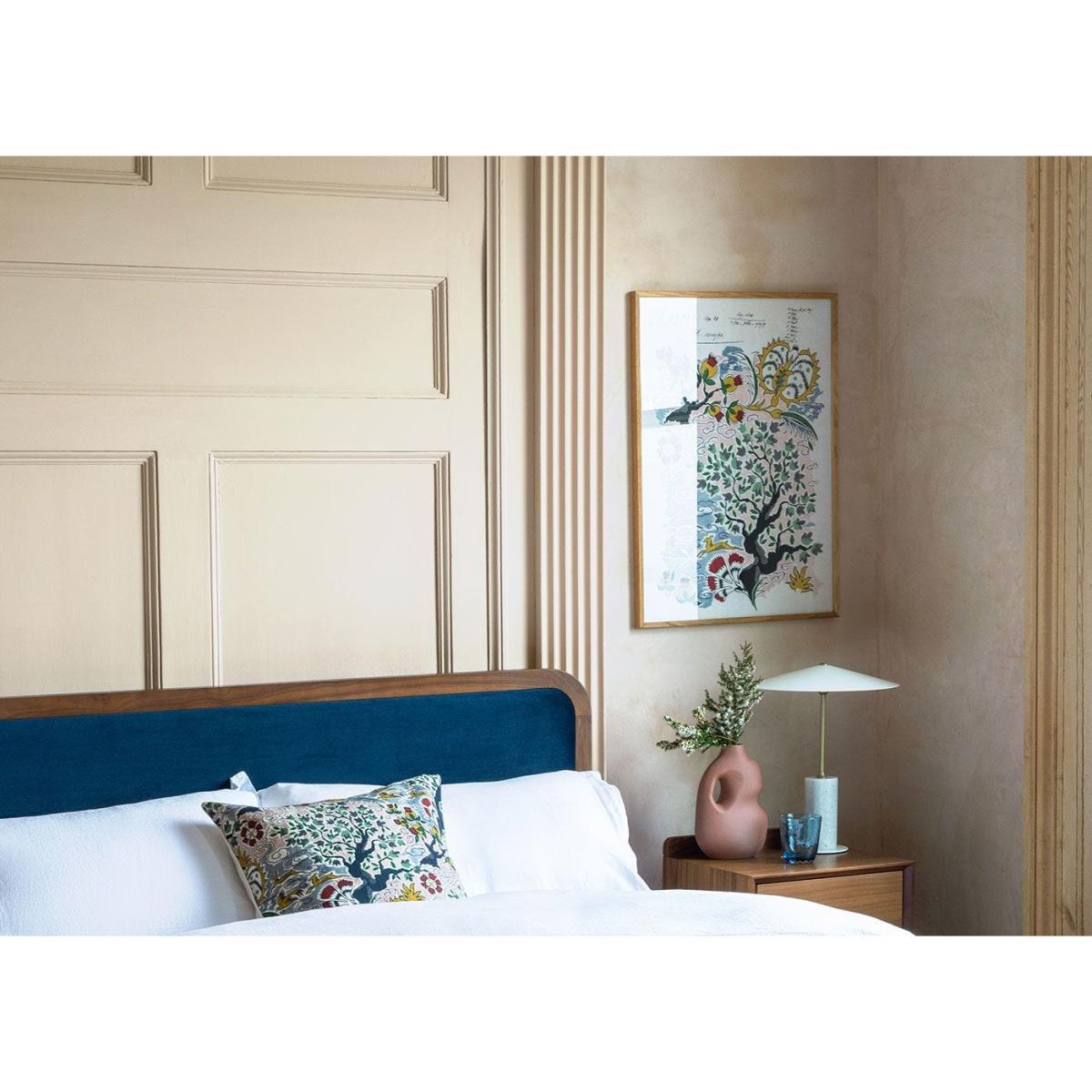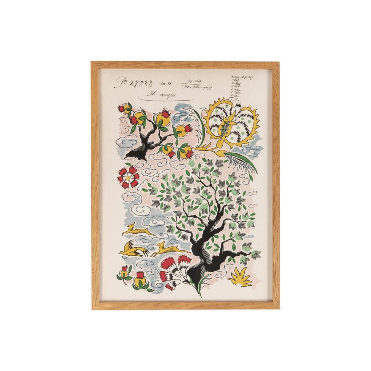 Reviving a French textile design created in 1929, the Print Sisters chose the Eden Print for its rich symbolism and vibrant messages of good fortune. For fertility, the pomegranate tree is a herald for women and men. The tree of life opposite symbolizes eternal life and beauty. Leaping deers and drifting herons also decorate this lively scene — their rich colours are all brought to life by this fine digital restoration. For a captivating, intriguing statement, hang on a plain wall to enliven any modern space.