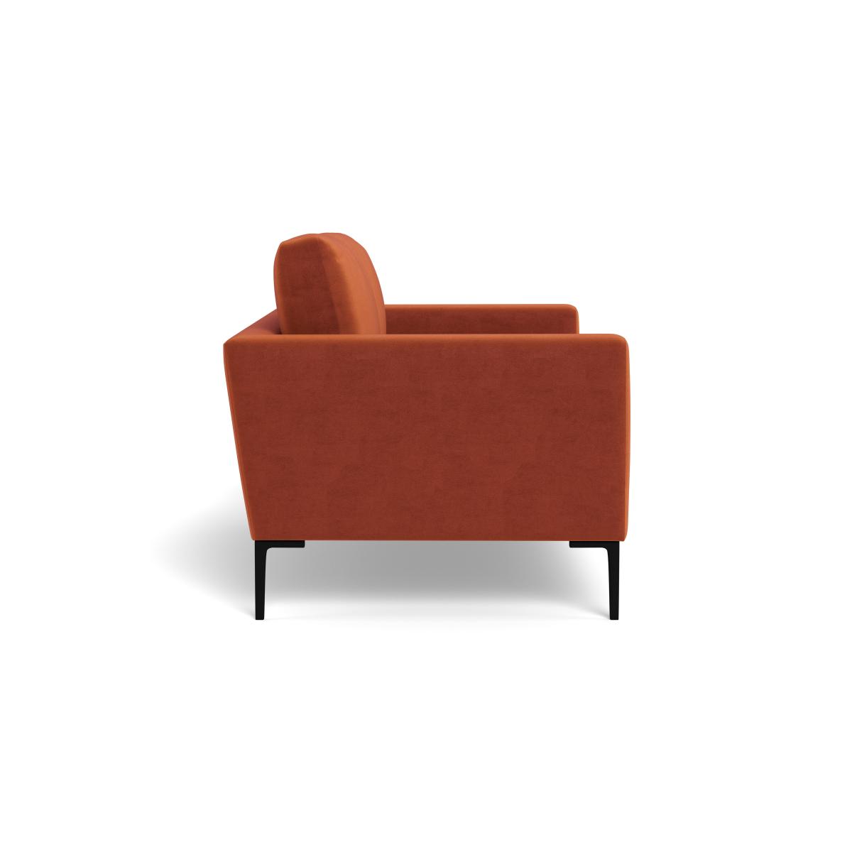 I’m a fan of the Eton sofa in russet because its clean lines and slim black legs keep the look fresh rather than bulky. The warm velvet tone works especially well in mid-century, Scandi or industrial-inspired rooms, pairing neatly with navy cushions or a neutral wool throw to balance that rich colour. For a pulled-together scheme, place it on a jute or low-pile rug and add cushions in mixed textures - think velvet, linen and boucle - to catch the light. A slim coffee table in dark wood or metal keeps the airy feel, while a floor lamp beside it provides both reading light and visual height.