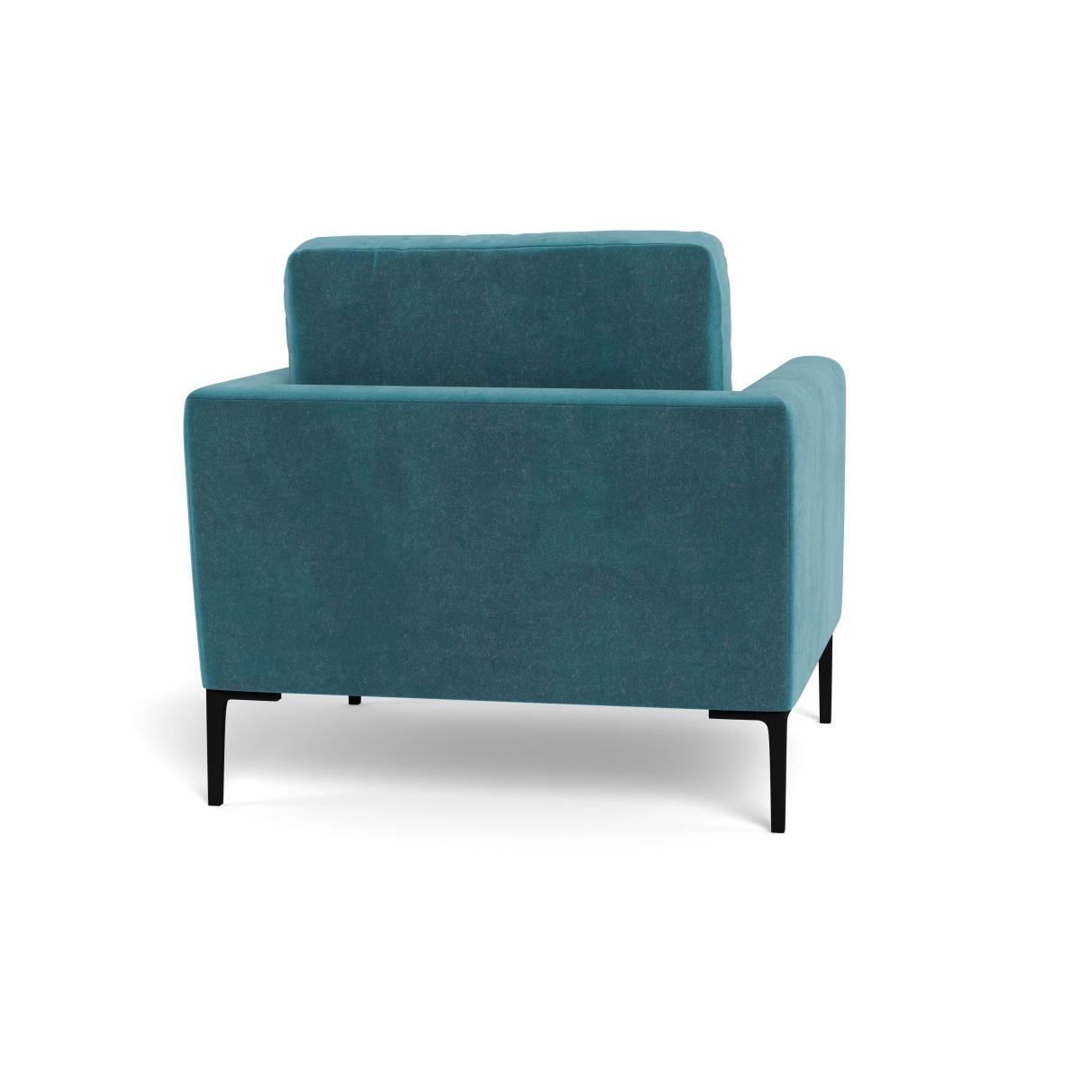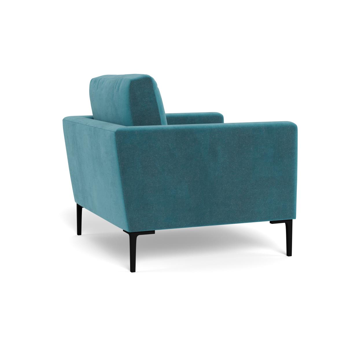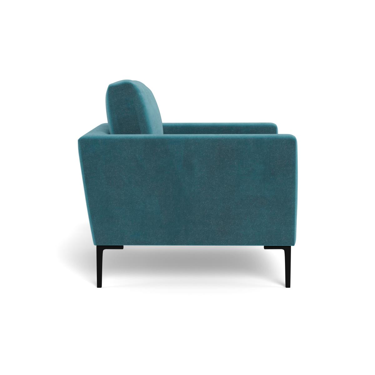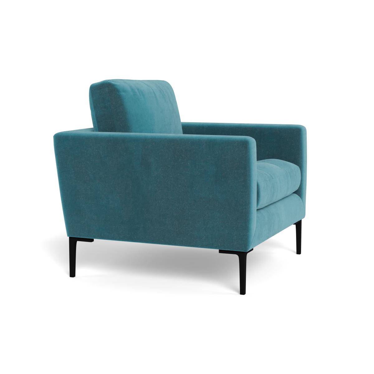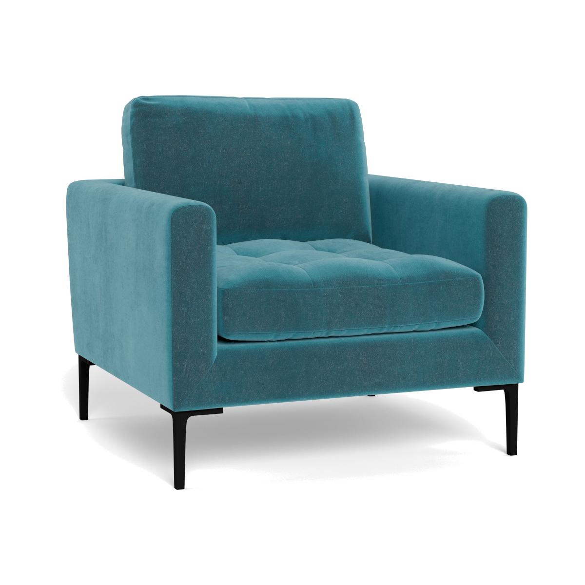I’d call this the Eton armchair in Airforce Blue - its smart velvet and slim brass feet give a clean, contemporary feel that works equally well in a Scandi-inspired lounge or a mid-century corner reading nook. I love its boxy shape for adding structured comfort, and the depth of that blue pairs perfectly with neutral walls or a warm wood floor. For styling, introduce a soft boucle throw in cream or soft grey and echo the brass detail with a side table or lamp. Keep surrounding furniture low and streamlined to let the chair’s colour and fine detailing stand out.
