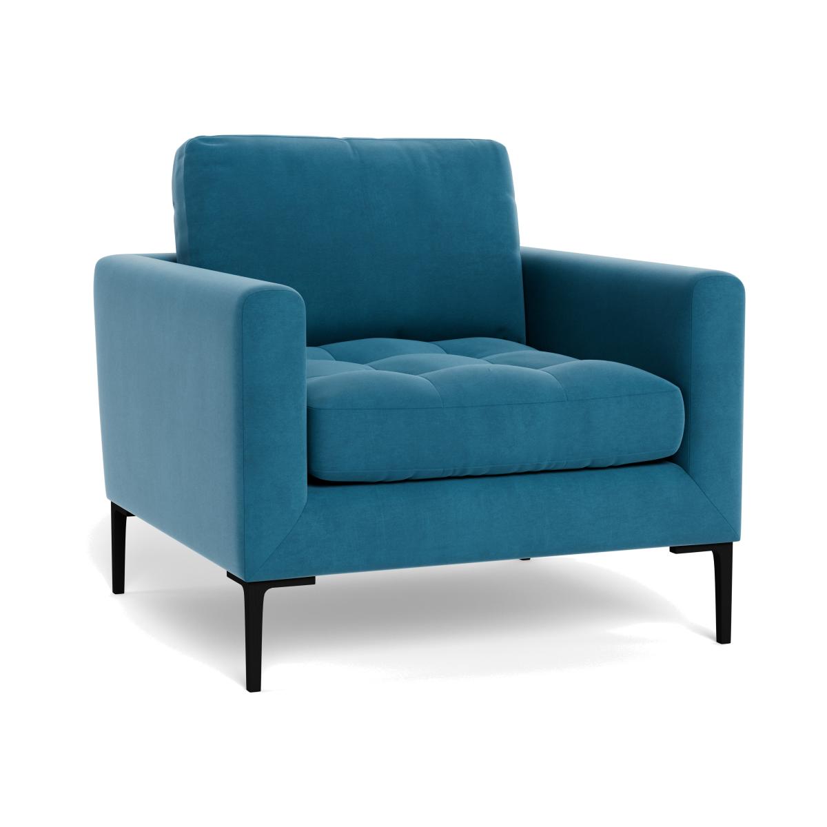 I’m a fan of the Eton armchair in that ocean-blue velvet - it feels rich without dominating a room, and the slim brass feet give it just enough lift for a contemporary look. It sits equally well in a mid-century lounge, a pared-back Scandi scheme or even a bold, maximalist corner as a grounding piece. To style it, add a contrasting cushion in ochre or soft pink, tuck it into a neutral-toned rug and side table combo, and frame with a slim floor lamp for a cosy reading spot. Its compact proportions mean it works nicely in smaller living rooms or study nooks.