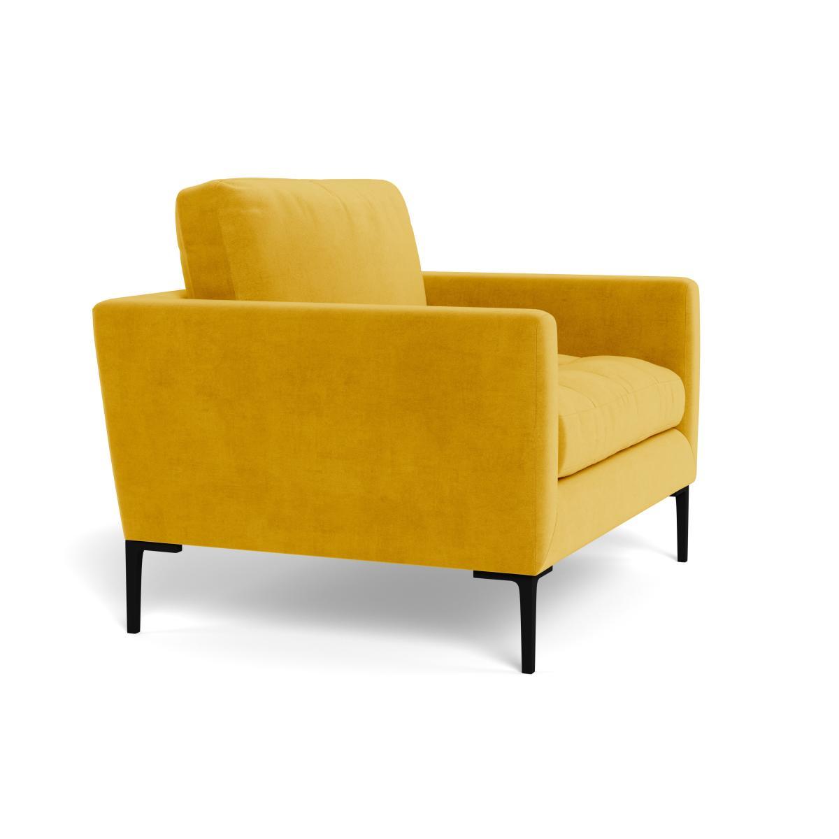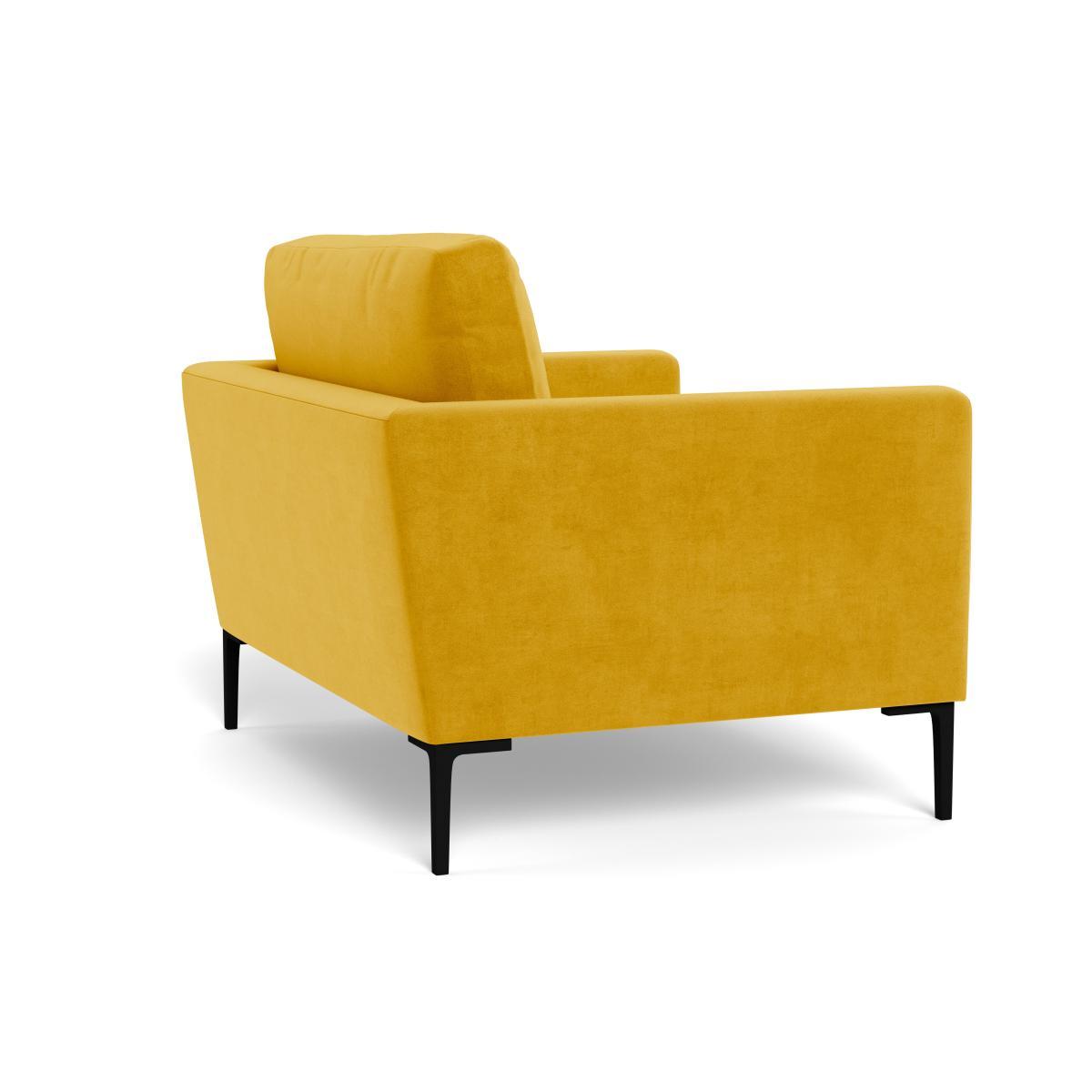 I love this little loveseats's bold colour and sleek silhouette - the yellow velvet is perfect for adding a splash of vibrancy to both contemporary and eclectic interiors. Its compact size makes it well-suited for smaller living rooms or open-plan spaces, where it can serve as a statement piece without overwhelming the room. I recommend pairing it with neutral tones and textured cushions to emphasise its luxe fabric, or styling it with contrasting accessories like black metal side tables or warm wooden accents for a modern yet cosy look. Its black feet ground the colour and give it a clean, contemporary edge, making it versatile enough to complement various colour schemes and decor styles.