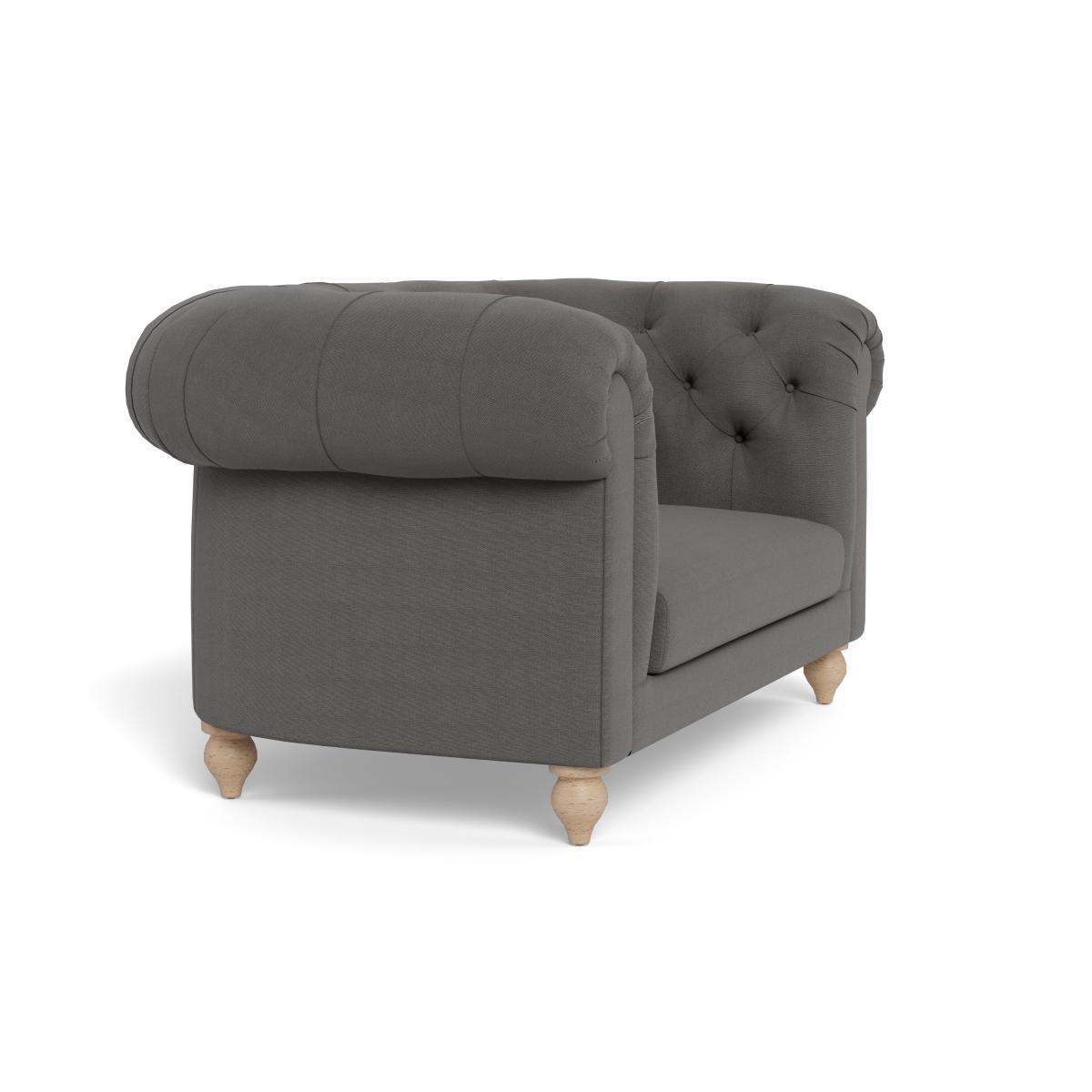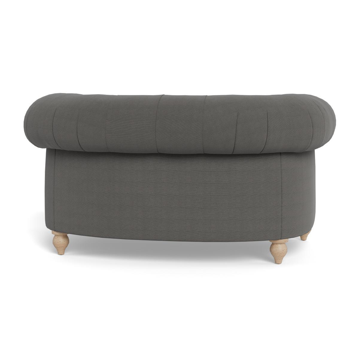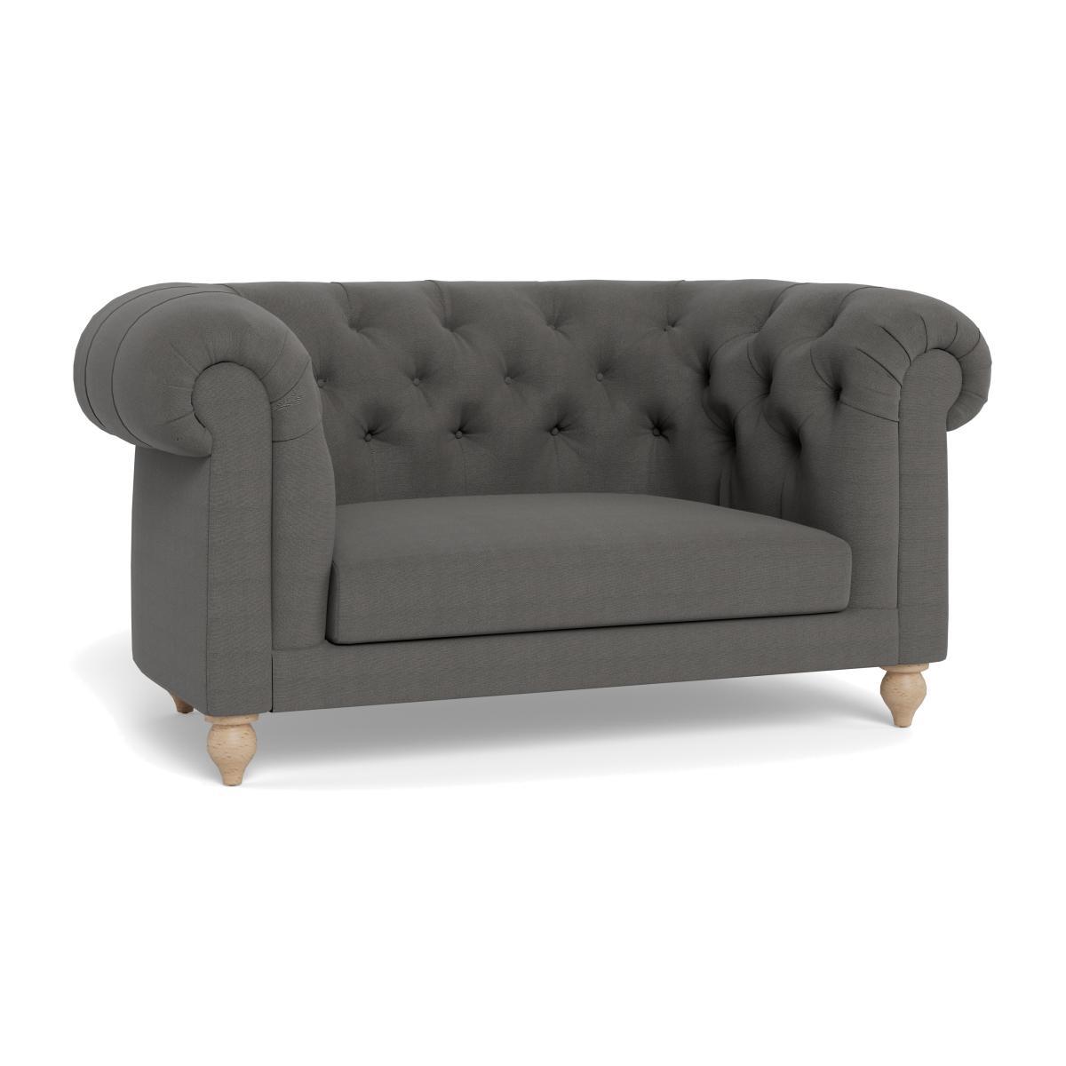 I really like this little loveseat; its classic Chesterfield silhouette with rolled arms and tufted back gives it a timeless appeal that works well in both traditional and contemporary interiors. The linen-cotton blend fabric adds a relaxed, tactile feel, making it suitable for bedrooms with a cosy, inviting vibe or for casual lounge areas. Its versatile ink spot colour anchors the piece as a statement item without overwhelming the space. To style it effectively, pair with textured cushions in neutral or contrasting shades, and consider placing it against a soft wall colour or layered with a throw to create a layered, welcoming look. It’s a practical yet refined option, ideal for adding a touch of elegance to smaller living spaces or the corner of a bedroom.