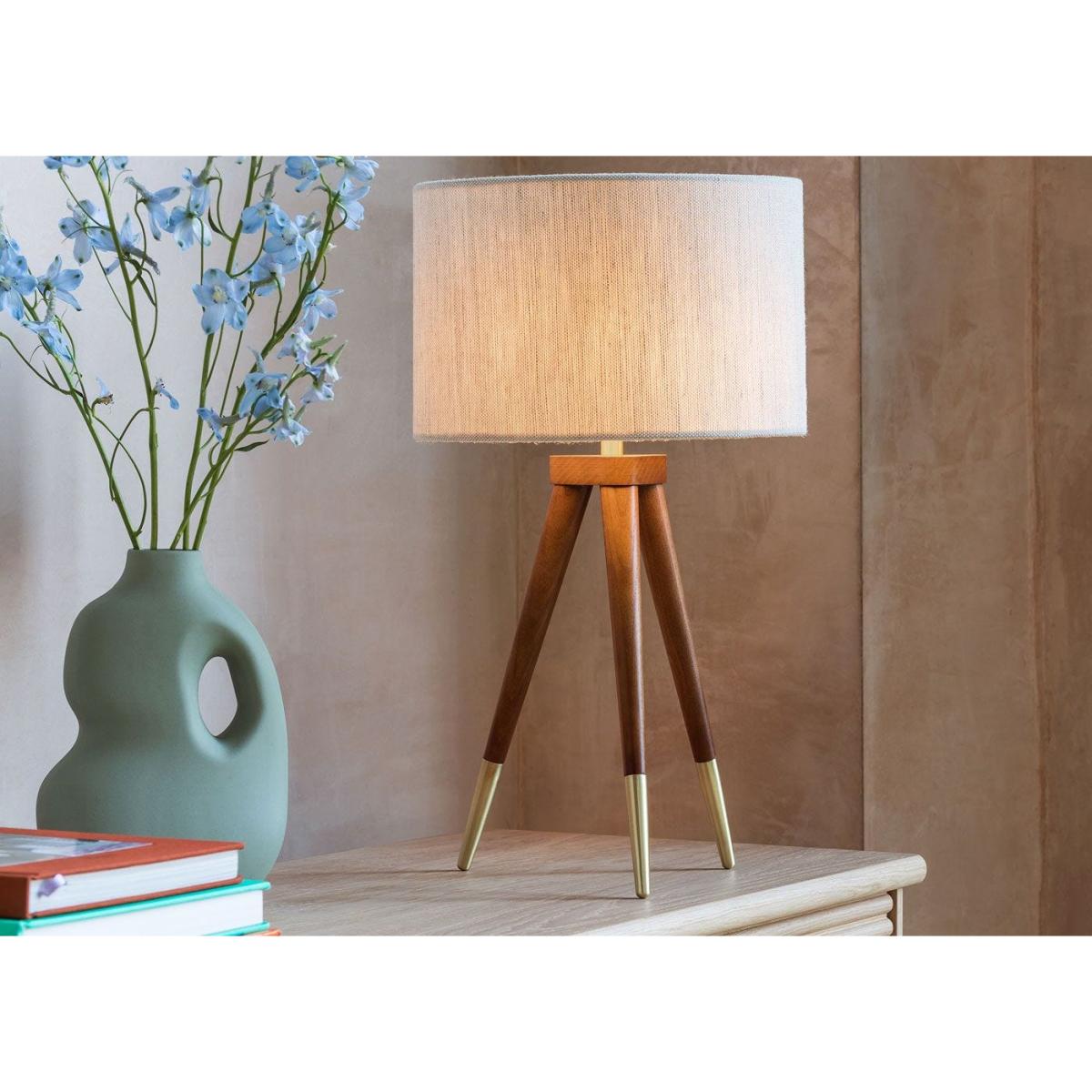 I love this lamp for its clean lines and warm walnut finish, which bring a subtle sophistication to both contemporary and mid-century styled interiors. Its tripod design is practical and versatile, making it a great option for bedside tables, desks, or living room corners. When styling, try pairing it with textured fabrics and neutral tones to highlight its natural wood detail, or use it as a statement piece against darker hues for contrast. The brass accents at the tripod tips add a touch of luxe, making it suitable for both minimalist and more eclectic schemes. Practical tip: keep the lampshade in neutral shades to ensure it complements various colour palettes and enhances the warm glow of the light.