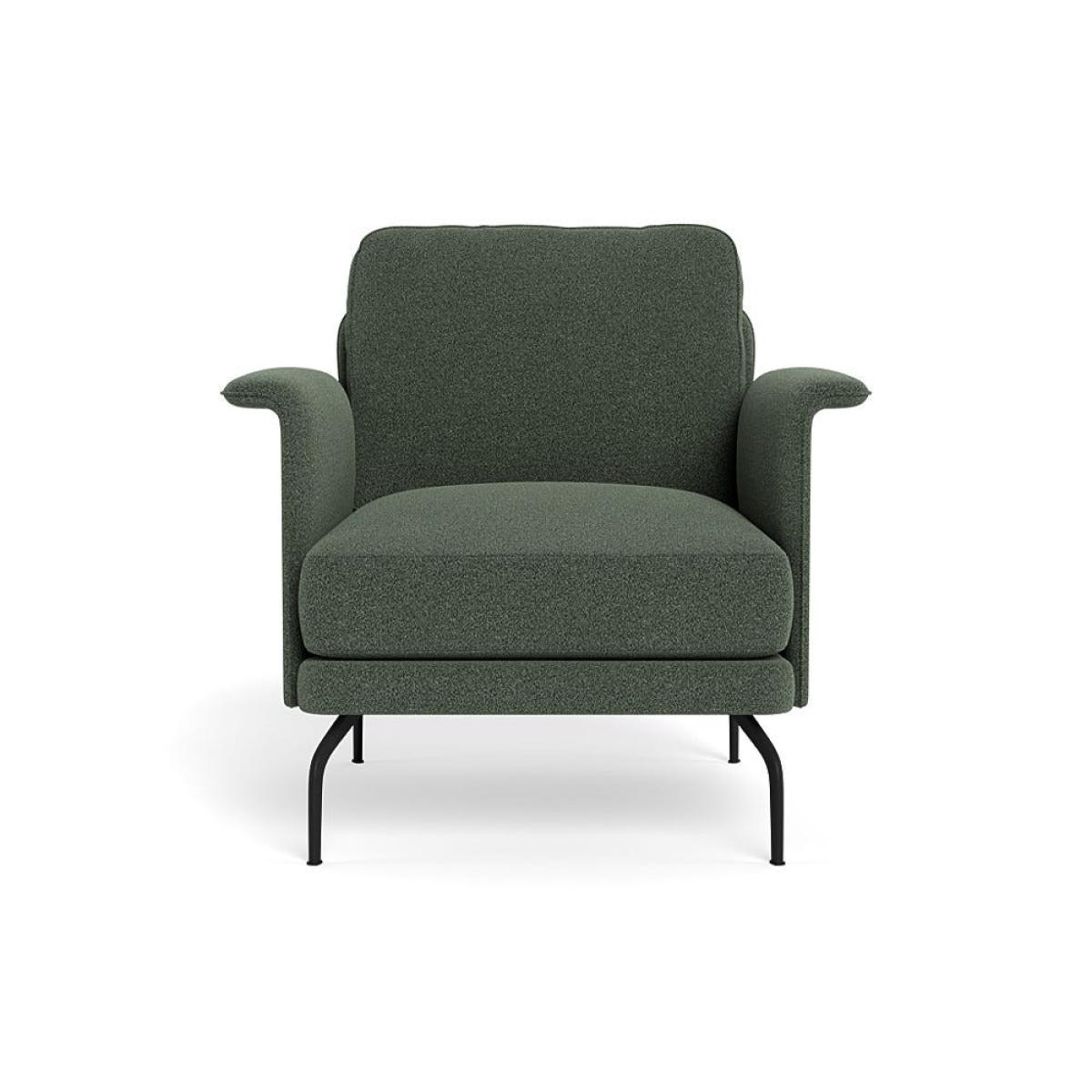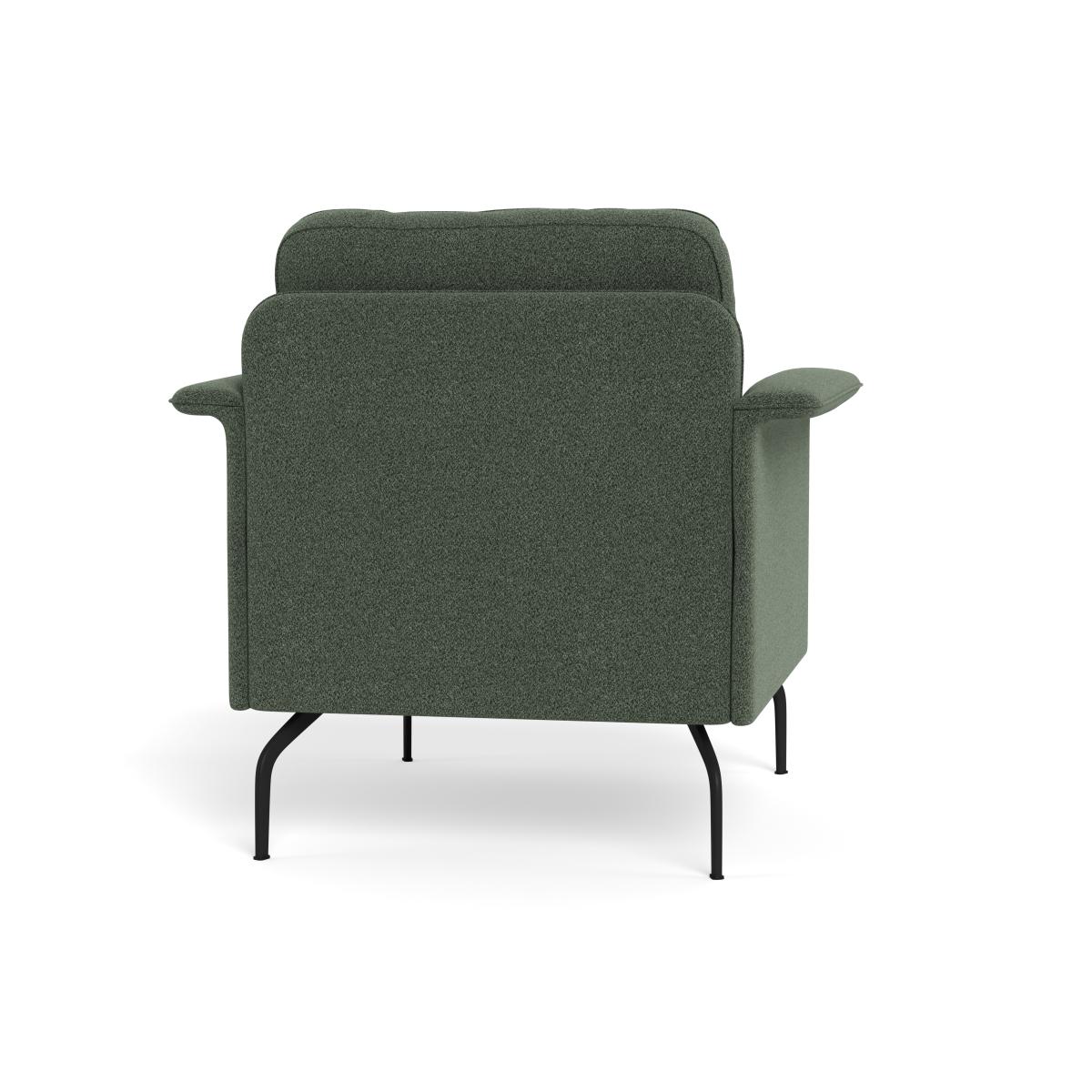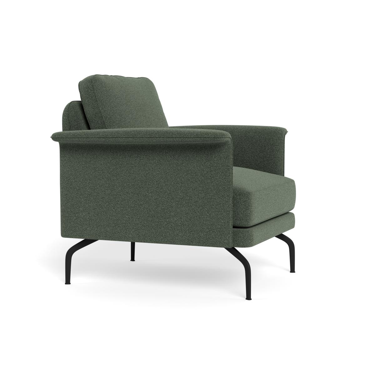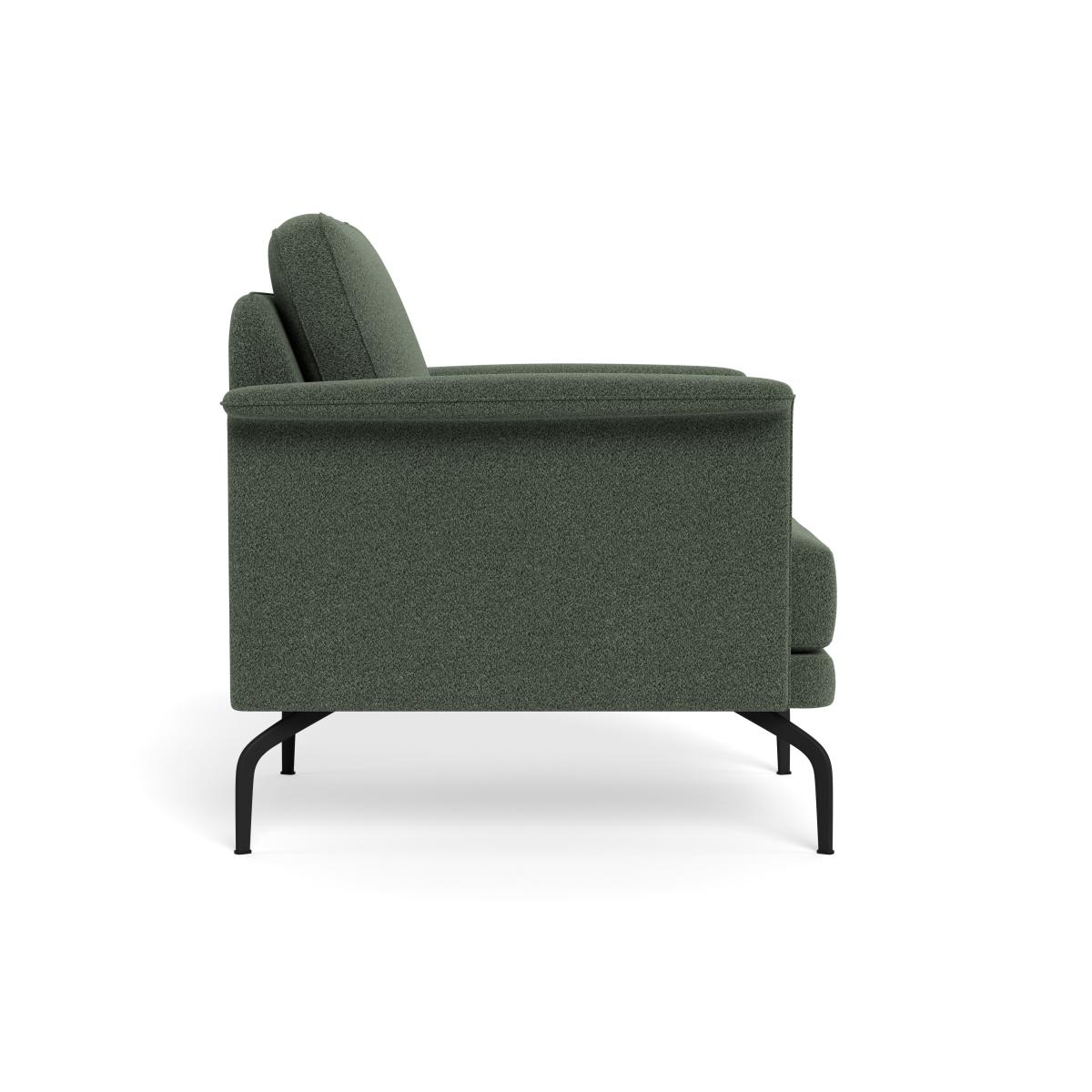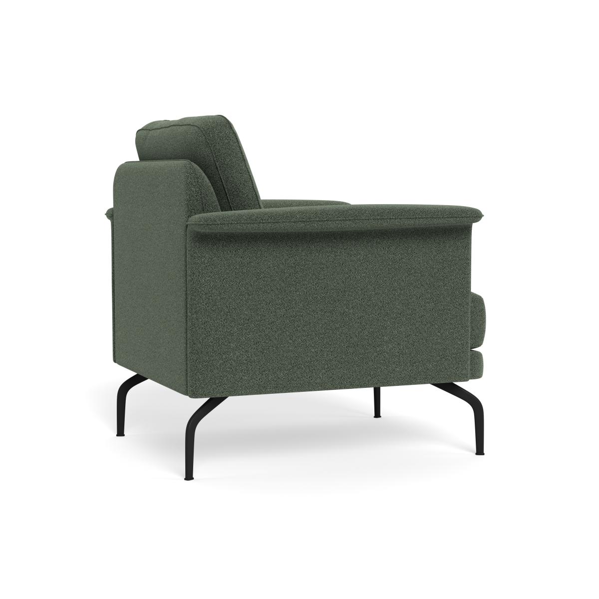 This armchair offers a stylish yet practical addition to a variety of interiors, thanks to its classic silhouette combined with the neutral boucle fabric. I love how the fern green colour adds a subtle touch of colour without overwhelming the space, making it versatile enough for both contemporary and more traditional settings. The black metal feet give it a modern edge, which works well in minimalist or industrial-style rooms. For styling, consider pairing it with textured cushions or layered throws to create a cosy look, or position it alongside a small side table and a statement lamp for a functional yet inviting reading corner. Its compact size makes it ideal for living rooms, bedrooms, or even a home office, offering comfort and style without overwhelming the space.