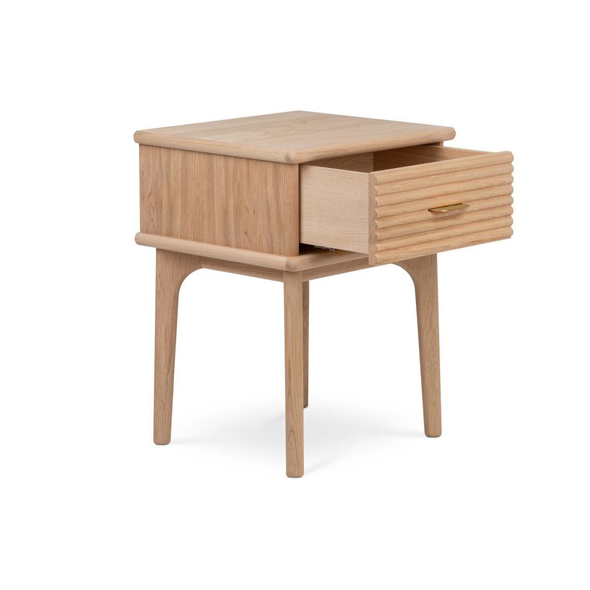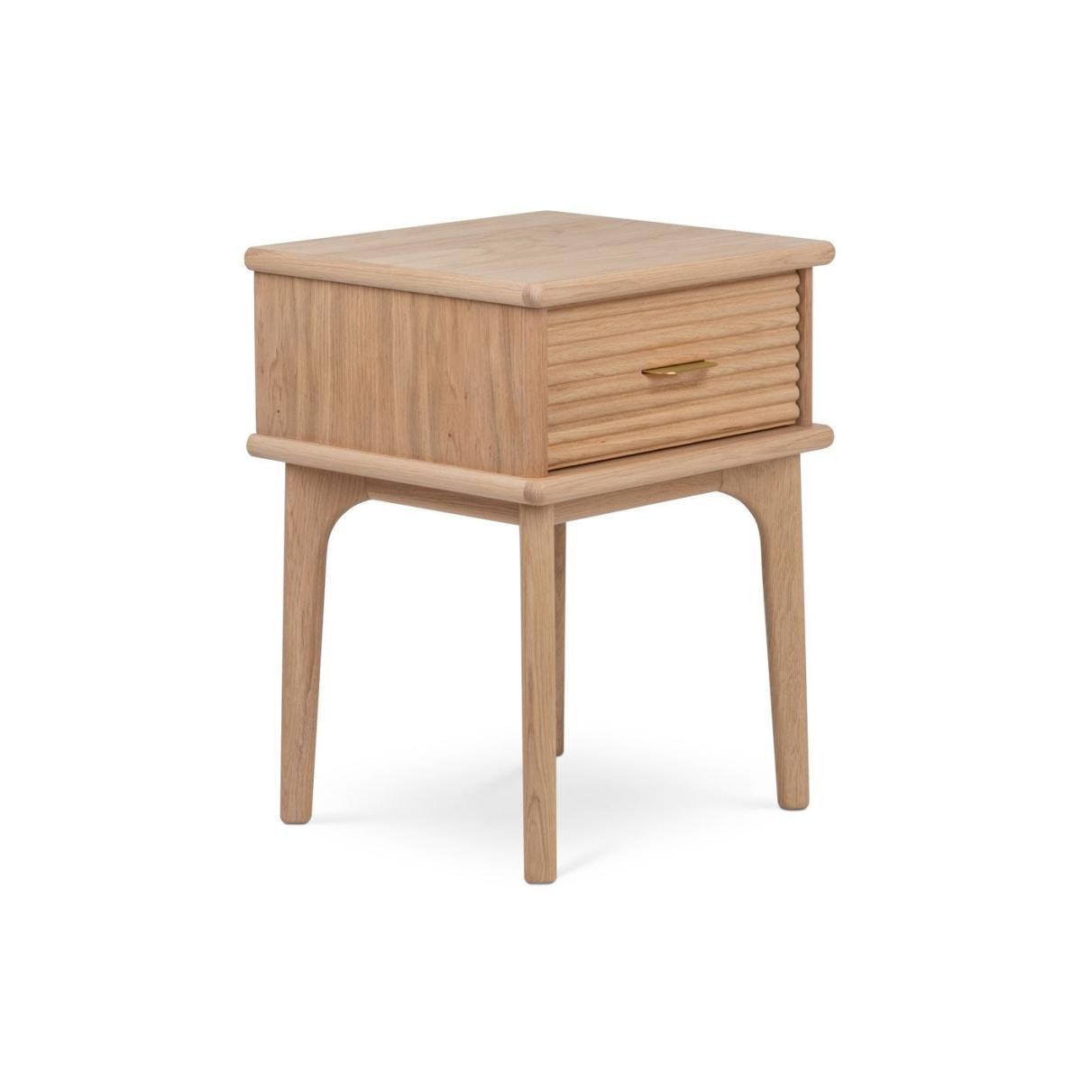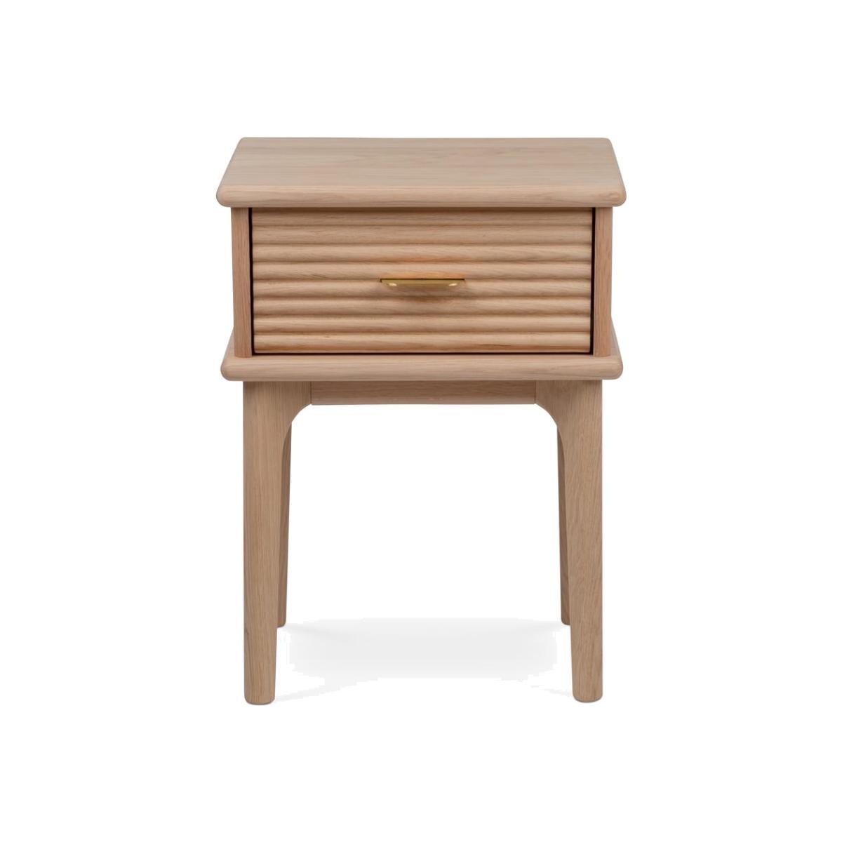 Showcase ambient nighttime lighting and store bedroom essentials with the Kendal Bedside Table, crafted in light solid and veneered oak and characterised by its tactile groove detailing. The final touch is its brushed brass handle that brings a luxurious feel to its understated minimalist design. Crafted from solid and veneered light oak, it has a well-built, sturdy structure that ensures this piece will last over time.